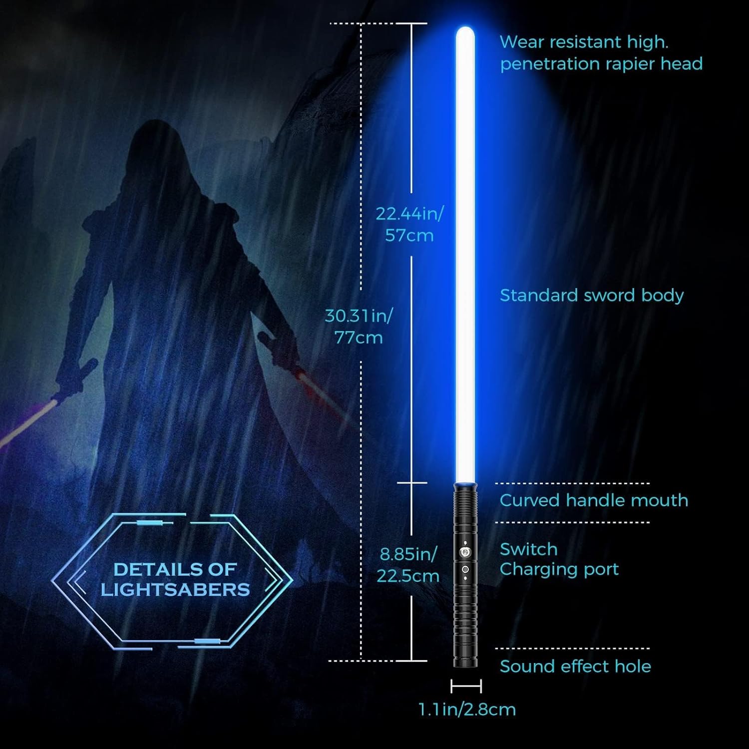 Le spade laser possono emettere 7 colori ed eseguire movimenti e simulazioni di combattimento: oscillazioni fluide ed effetti sonori di combattimento mentre esegui diverse mosse di combattimento. Le spade laser soddisfano gli standard dei giocattoli del Regno Unito e sono adatte a bambini di età superiore a 6 anni. L'impugnatura è realizzata in lega di alluminio di alta qualità e la lama è realizzata in PC ad alta resistenza e ad alta trasmissione della luce. La spada laser con una lunghezza totale di 77 cm è perfetta for cosplay for bambini, feste in costume di Halloween, amanti del cinema ed è il regalo perfetto for i bambini. La spada laser ha una batteria al litio integrata e un cavo di ricarica USB. Carica for 3-4 ore, puoi giocare for 2-3 ore. La spada laser è dotata della più recente porta di ricarica di tipo C, garantiamo un uso prolungato, ideale per collezionisti, appassionati e Jedi.