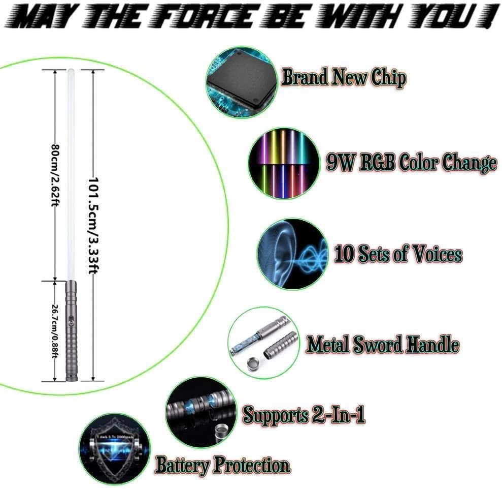 1. ILLUMINAZIONE RGB DINAMICA: Seleziona 16 colori vivaci; 10 effetti sonori autentici migliorano l'immersione, modalità silenziosa per ambienti tranquilli 2. CONFIGURAZIONE DUAL: Acquista 2 spade, ricevi 1 connettore gratuito. Utilizzabili singolarmente o unite in spada doppia; lunghezza totale 101,5 cm 3. DURABILITÀ PREMIUM: Lama rinforzata in policarbonato resiste agli urti; impugnatura in lega aeronautica garantisce bilanciamento e robustezza 4. RICARICA EFFICIENTE: Batteria agli ioni litio USB carica completa in 3-4 ore per 4-5 ore d'uso; protezione integrata contro sovraccarichi 5. VERSATILITÀ POLIVALENTE: Ideale per feste in costume, eventi ludici e ricorrenze; regalo perfetto per compleanni, Halloween o feste dei bambini