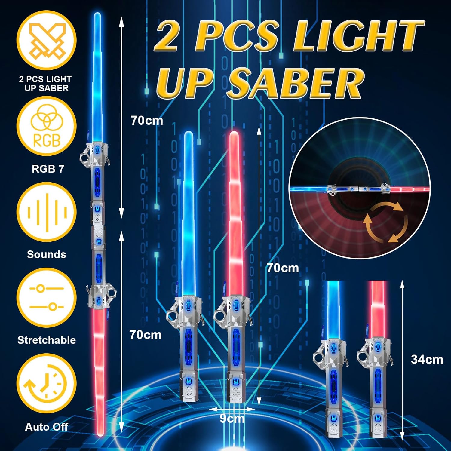 ✨ 【Spada Luminosa Ricaricabile per Bambini】 Questa spada laser a LED di nuova concezione ha una batteria integrata ad alta capacità e può essere utilizzata immediatamente. Sono necessarie batterie aggiuntive. Basta tenere premuto l'interruttore per 3 secondi per attivare la spada laser e viene fornita con un cavo di ricarica USB da un'ora. Può essere utilizzato continuamente per 10 ore con una singola carica, garantendo un divertimento di gioco di lunga durata. ⏳【Pulsante di Accensione】 La spada laser ha 24 modalità di luce colorata che possono essere attivate premendo a lungo l'interruttore. Inoltre è dotato di nuovissimi effetti sonori che ti immergeranno nella luce. Quando le spade laser si scontrano, le luci LED cambiano colore ed entrano in modalità lampeggiante, aumentando il divertimento del combattimento. Se desideri disattivare l'audio, puoi facilmente attivare l'interruttore a sinistra. 👾【Modalità di Lunghezza】 il set comprende due spade laser portatili, ciascuna con un'impugnatura progettata per una presa comoda. La spada laser può essere lunga tra 25 e 70 cm e due spade laser possono essere combinate con un connettore per creare una spada da 150 cm. Perfetto per vari scenari di gioco, il design flessibile e retrattile ti consente di trasformarti in un guerriero Metroid e proteggere l'intera stella. 💪 【Costruzione Robusta】 Il corpo principale della spada laser è realizzato in plastica ABS di alta qualità, che fornisce una superficie liscia e una struttura leggera, stabile ed elastica. Ciò lo rende molto resistente anche durante le attività di gioco intense. 🎁【Set regalo Sorprendente】 Questo conveniente set combinato di spade laser offre look alla moda, funzioni entusiasmanti e facilità d'uso. Ideale per feste cosplay, feste in costume, Halloween, Natale, feste di compleanno o feste a tema come Galactic Warrior, Luke Skywalker, Darth Vader ecc. È perfetto per tutti! Con 24 colori chiari, fantastici effetti sonori e molteplici modalità di durata, puoi difendere il mondo con stile!
