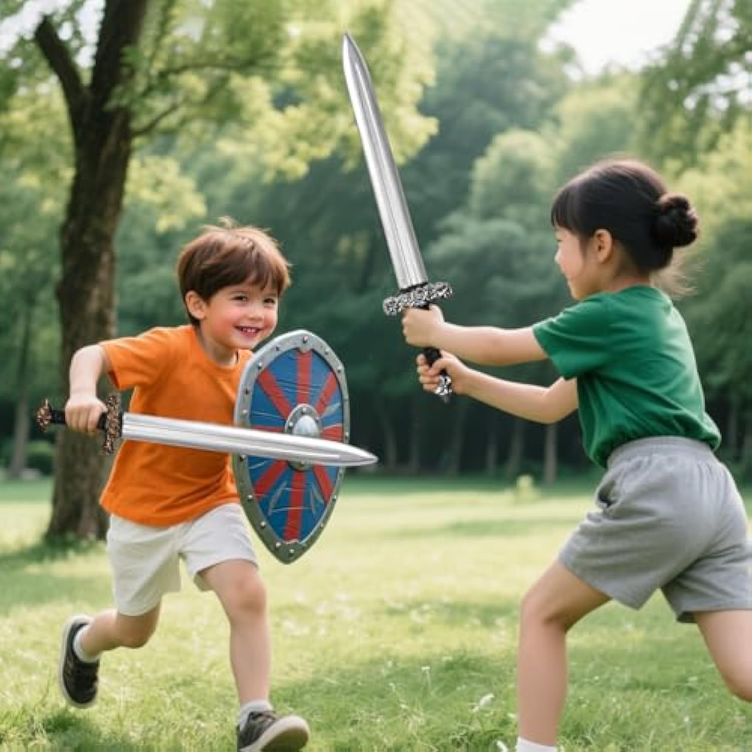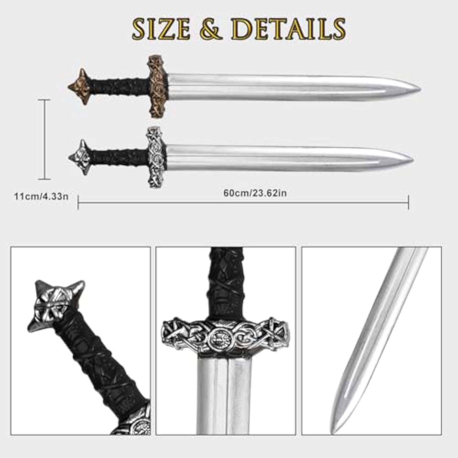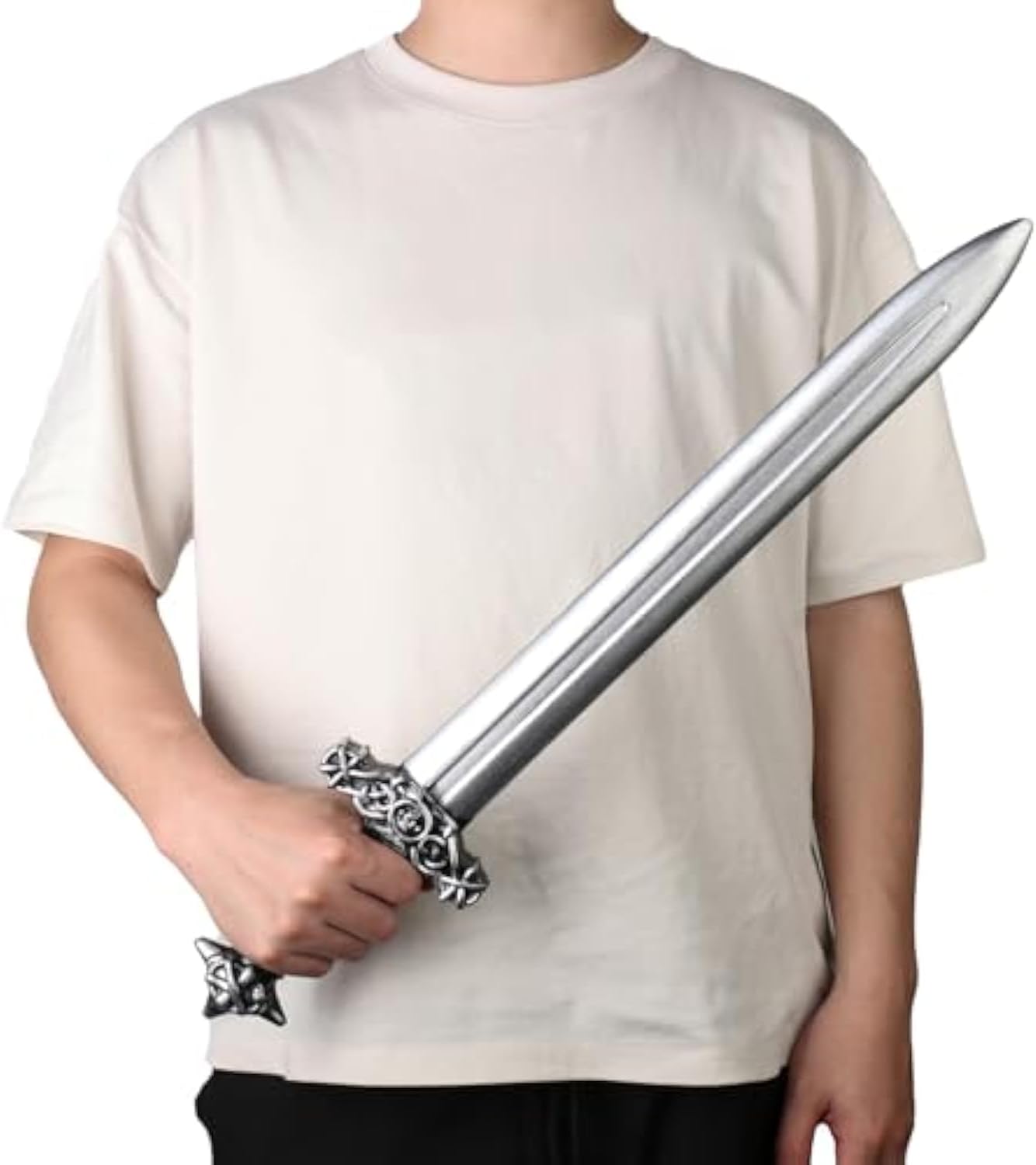 100% polietilene Divertimento sicuro e universale: realizzate in plastica leggera e priva di BPA, queste spade finte sono progettate per tutte le età: bambini, adolescenti e adulti possono tranquillamente godersi battaglie medievali, duelli cosplay o eventi a tema. Autentico Knight Sword Style: Caratterizzato da un design dettagliato spada medievale, queste spade di plastica aggiungono realismo ai costumi, sia per oggetti di scena di Halloween, festival rinascimentali o giochi di ruolo fantasy. Uso multi-generazionale: sono perfetti per giochi in famiglia, cosplay per adulti, spettacoli teatrali o accessori decorativi rinascimentali per la casa o eventi. Durevole e leggero: la plastica infrangibile assicura che queste spade giocattolo resistano al gioco energico, mentre il loro design facile da impugnare si adatta sia alle mani piccole che agli utenti adulti. Set doppio valore: include 2 spade medievali, ideali per duelli, costumi di gruppo (ad esempio, cavalieri, pirati, guerrieri) o regali per compagni di storia e appassionati di fantasia.