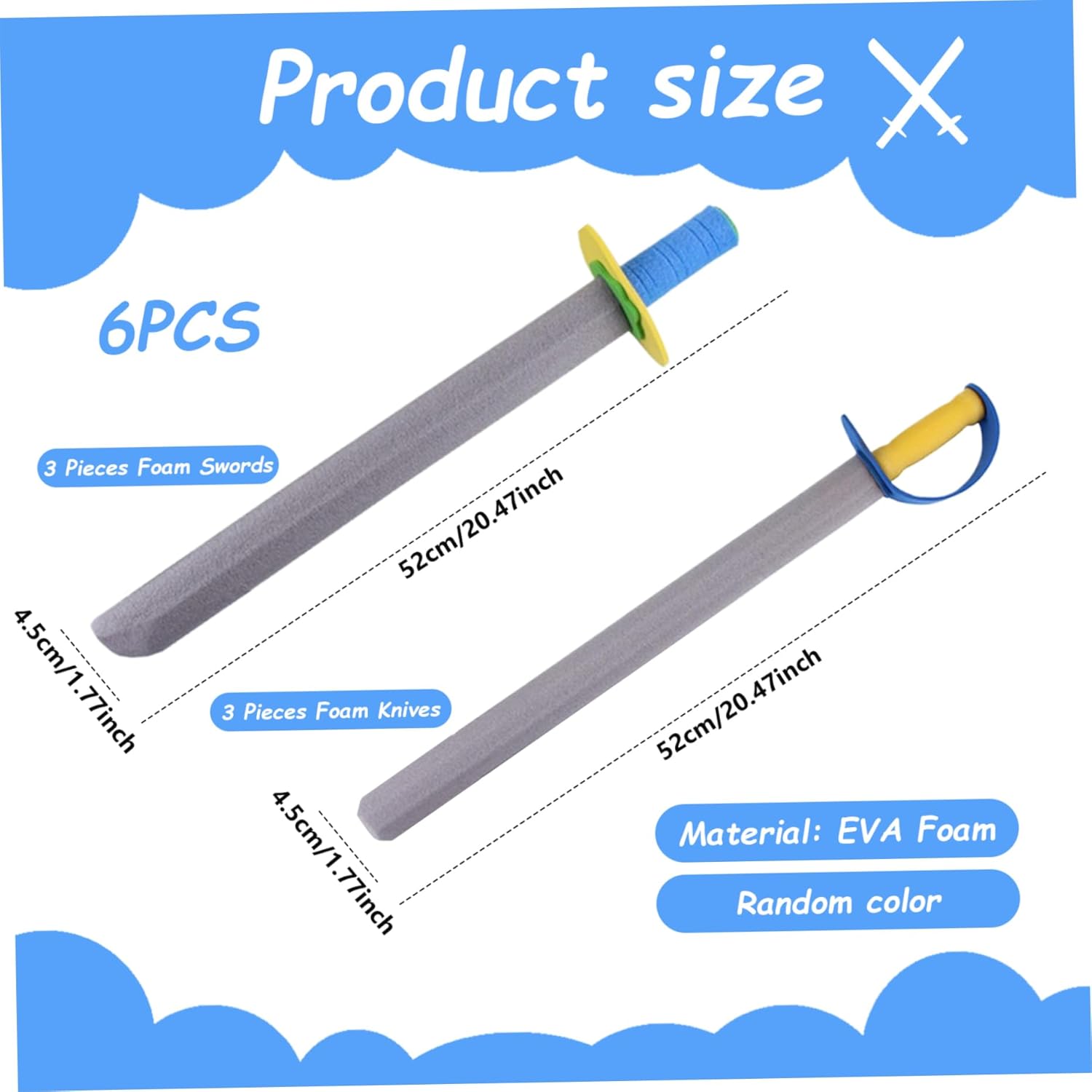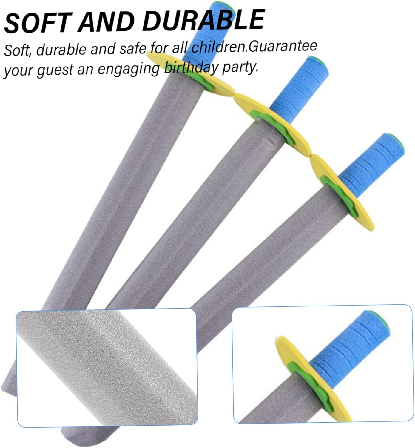 Dimensioni perfette: a 21 pollici di lunghezza, queste spade per i bambini hanno una dimensione perfettamente per piccole mani, offrendo un'esperienza audace audace. Giochi realistici: progettati per simulare un vero combattimento con la spada garantendo la sicurezza, questi giocattoli in schiuma aiutano i bambini a impegnarsi in giochi fantasiosi come guerrieri o cavalieri. Divertimento per tutti: ottimo per ragazzi e ragazze, queste spade di schiuma per bambini migliorano il tempo di gioco con i loro colori vivaci e la costruzione sicura e morbida. Set vario: include 3 spade in schiuma e 3 coltelli in schiuma, offrendo opzioni di gioco versatili..Le maniglie sono disponibili in colori casuali per un maggiore divertimento. Sicuro e leggero: realizzati in schiuma EVA, queste spade di schiuma sono leggere, morbide e sicure per i bambini, rendendole ideali per i combattimenti di gioco senza il rischio di lesioni.