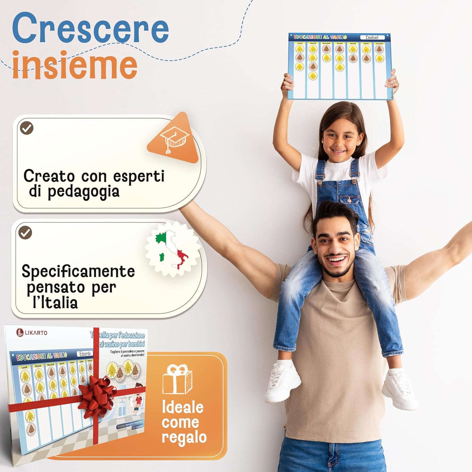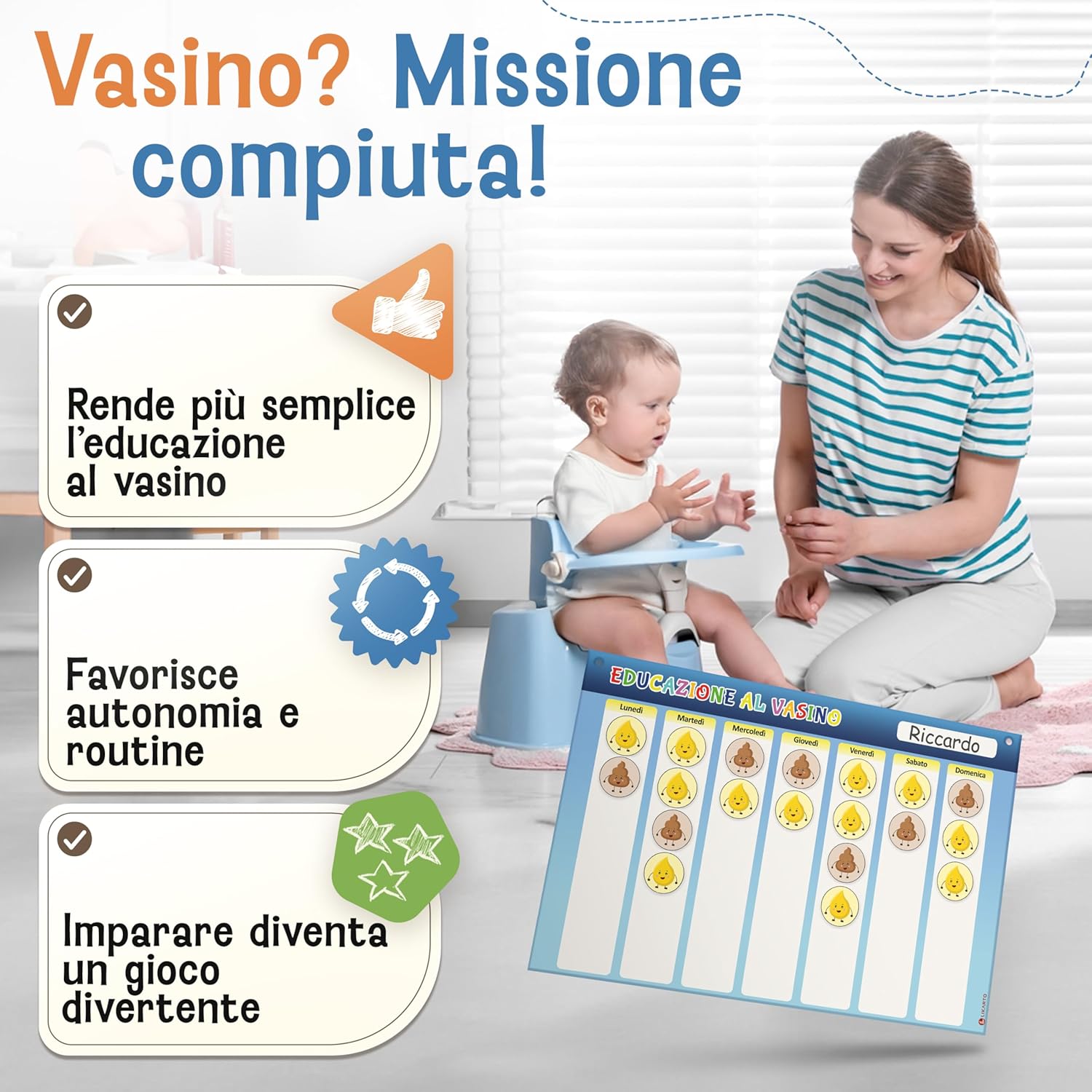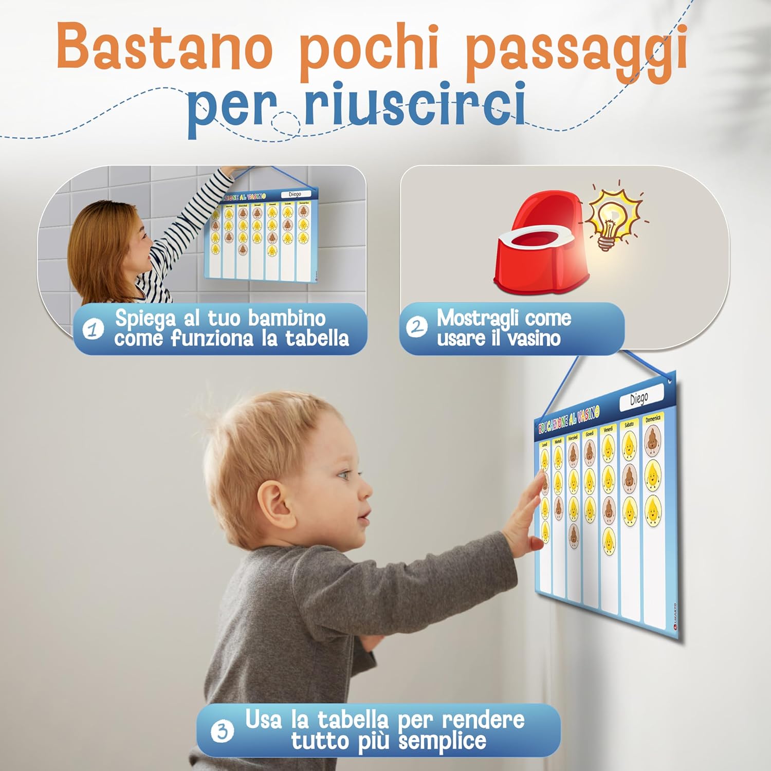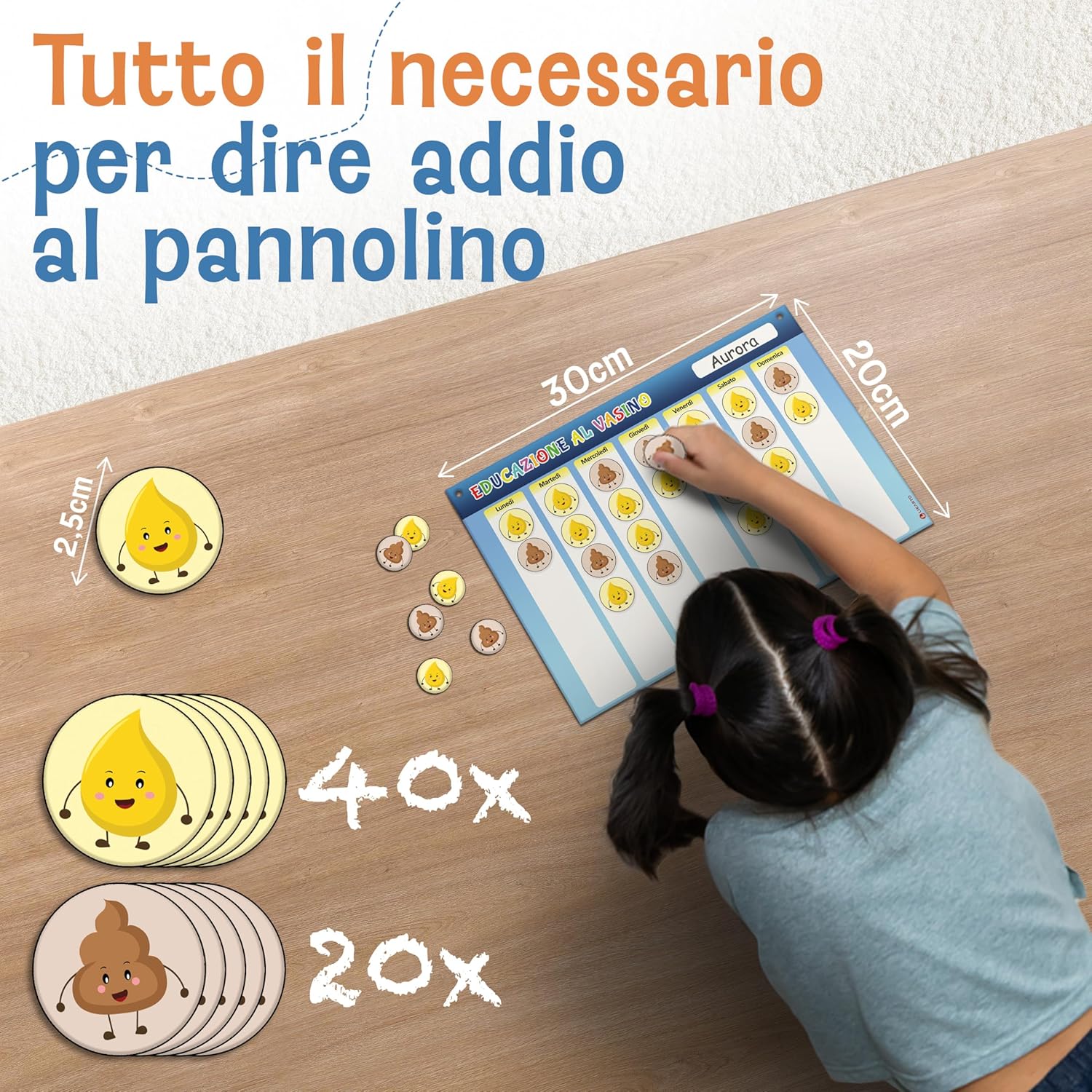 TOGLIERE IL PANNOLINO, GIOCANDO - Rendi il passaggio dal pannolino al vasino divertente. La nostra tabella aiuta a creare una routine quotidiana e a seguire i progressi in modo semplice e motivante. TANTI MAGNETI COLORATI - Il set include 60 magneti in totale, 40 per la pipì e 20 per la cacca. I magneti aiutano i bambini a riconoscere i loro progressi in modo divertente. ALTA QUALITÀ E DURATA - Lavagna magnetica extra resistente (30 × 20 cm) con magneti forti e riutilizzabili. Un'alternativa sostenibile ai tradizionali adesivi. La lavagna è cancellabile. AUTONOMIA E RESPONSABILITÀ, DIVERTENDOS - Il calendario, a misura di bambino, è facile da capire e divertente da usare. Aiuta a rafforzare il senso di responsabilità e l’autonomia durante l’educazione al vasino. LA PROMESSA DI LIKARTO - Garantiamo la massima qualità e un servizio impeccabile. Tutti i nostri prodotti sono testati e sicuri per i bambini. Puoi provarli senza impegno e restituirli facilmente, se necessario.