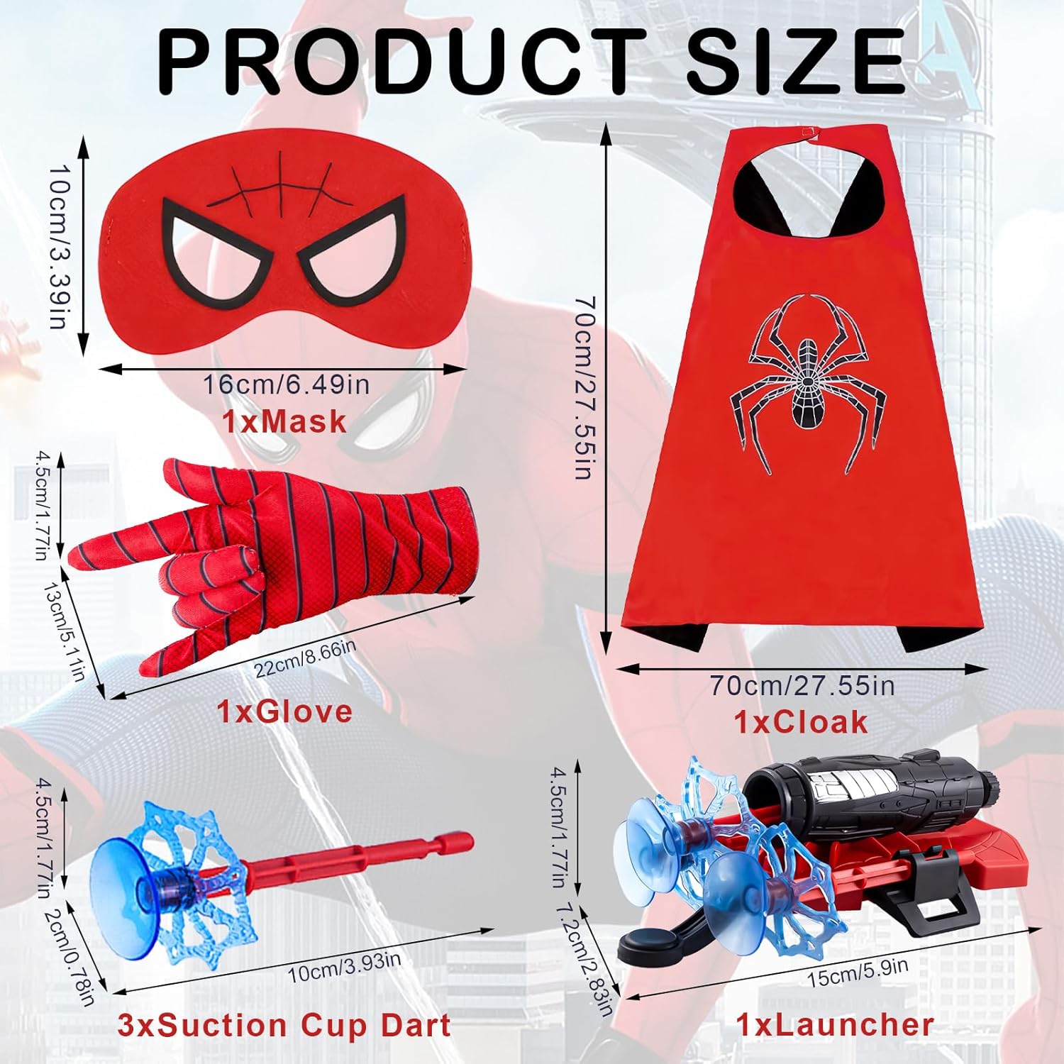 🕸【Cosa ottieni】Lo sparatutto in rete è composto da 7 parti, incluso 1 mantello da eroe che misura 70*70 cm, 1 maschera, 1 guanto, 3 dardi a ventosa e un lanciatore. Indossa l'abito completo e trasformati in un piccolo eroe per goderti un felice momento di gioco 🕷 【Set da gioco realizzato in materiale sicuro】 Il giocattolo è realizzato in plastica ABS di alta qualità, non tossico, inodore ed ecologico. I guanti sono realizzati in poliestere per comfort e durata. Il mantello dell'eroe è realizzato in raso, morbido, liscio e delicato sulla pelle. La maschera è realizzata in tessuto di feltro, ha un taglio preciso, si adatta bene al viso ed è fissata elasticamente per un facile utilizzo. 🕸【Nuovo design】Il lanciatore di rete presenta una tecnologia completamente nuova e un design a molla recentemente migliorato, che evita problemi precedenti come blocco e inerzia. La chiusura a molla rinforzata garantisce una chiusura fluida. Il design robusto garantisce che il trasmettitore non si rompa facilmente. C'è una ventosa sulla parte superiore del proiettile che non provoca alcun danno al corpo. Tuttavia, non mirare a parti del corpo umano durante l'utilizzo. 🕷【Utilizzo】Utilizzare il launcher è semplice: basta aprire il launcher, inserire le freccette a ventosa nel launcher e sentirai un suono "dang" una volta completata l'installazione. Quindi abbassa l'interruttore per azionare la testata aspirante. Puoi posizionarlo sul vetro o sul pavimento e le sfere della ventosa si attaccheranno al pavimento o al vetro. 🕸【Regalo perfetto】Il lanciatore di rete per bambini è un regalo ideale per i bambini. Può essere usato come regalo per compleanni, Natale, Halloween, carnevale, laurea, anniversari, sarà molto apprezzato. Allo stesso tempo, i bambini saranno molto entusiasti ed entusiasti quando lo indosseranno in vari festival o attività e realizzeranno anche i loro sogni eroici.