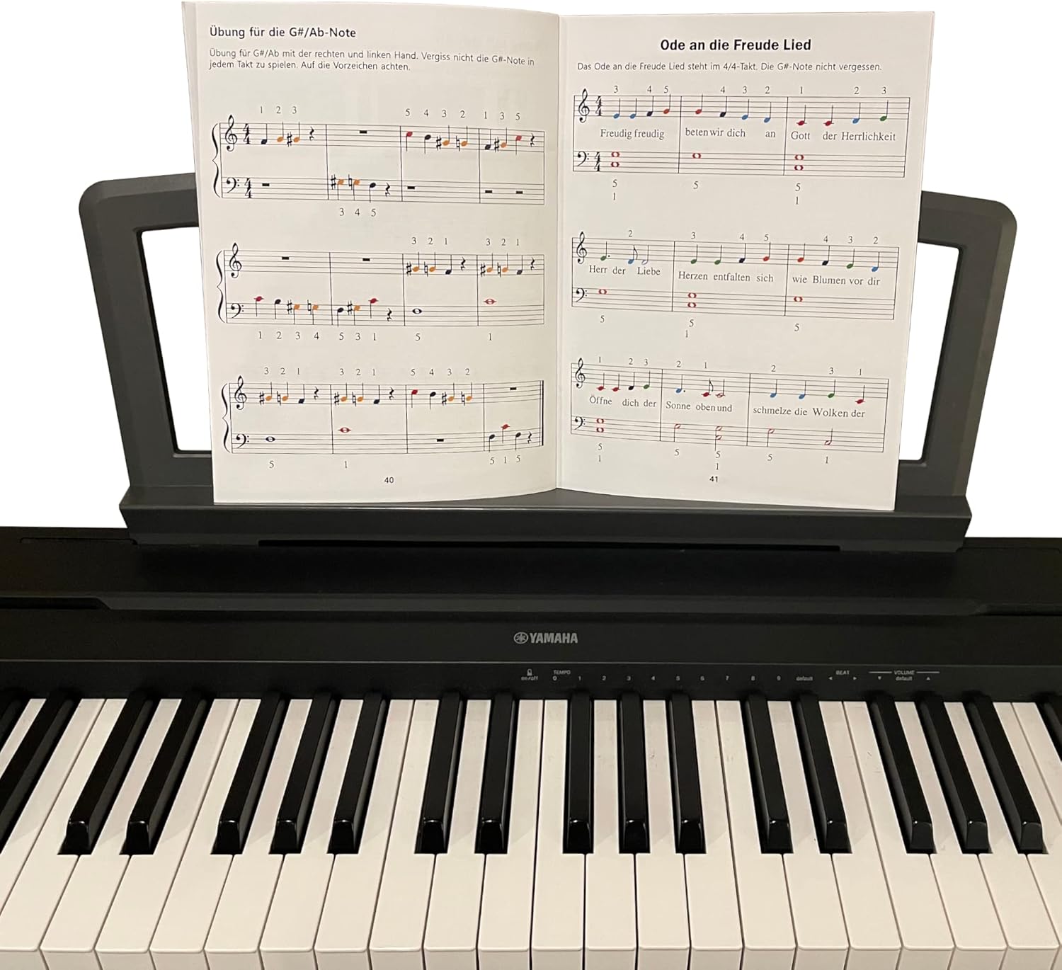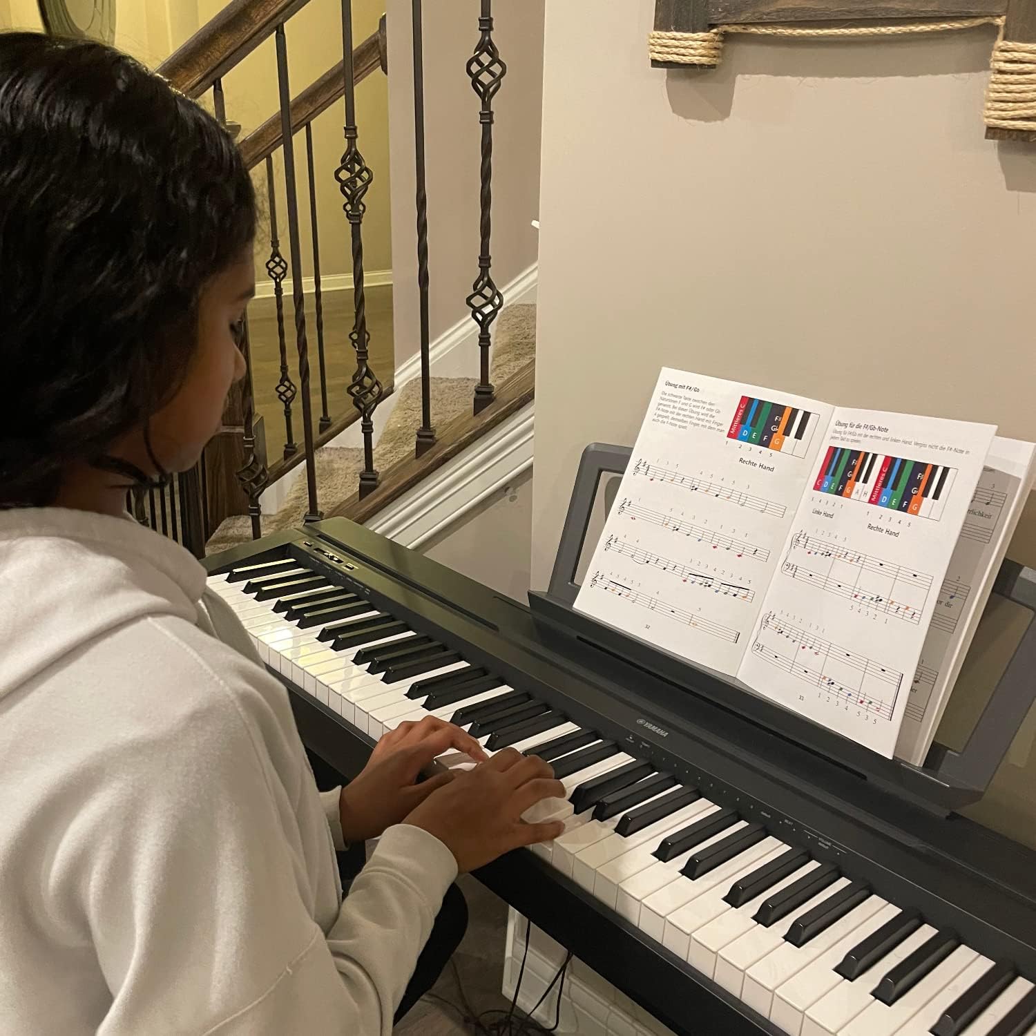 ⦗ LIBRO DUE LEZIONI DI PIANOFORTE PER PRINCIPIANTI ⦘ Contiene esercizi attentamente progettati di difficoltà gradualmente crescente. Alla fine di ogni sezione sono inclusi anche spartiti di canzoni popolari per bambini e brani di musica classica per testare i progressi e migliorare le abilità. Guida per sviluppare la tecnica corretta della mano e delle dita per suonare il pianoforte ⦗ IMPARARE LE BASI DELLA LETTURA DELLA MUSICA ⦘ Il libro insegna anche le basi della lettura della musica (rigo, linee del rigo, simboli della misura, durata delle note, ripetizioni, ecc.) e pone così le basi per leggere la musica. ⦗ NOTE CODIFICATE A COLORI ⦘ Le note nel libro di testo e sugli adesivi sono codificate a colori utilizzando la stessa combinazione di colori vivaci e allegri per facilitare l'identificazione delle note nel libro e sugli adesivi del pianoforte. Questo aiuta i bambini e i principianti a riconoscere e memorizzare le note musicali in modo rapido e semplice. Una risorsa eccellente per studenti e principianti visivi, indipendentemente dalla loro età. ⦗ TRASPARENTI E DUREVOLI ⦘ Gli adesivi sono stampati tra due strati di vinile trasparente e resistente per evitare lo sbiadimento dell'inchiostro e sono rivestiti con un materiale adesivo di lunga durata che non danneggerà i pulsanti. ⦗ PER OGNI PIANOFORTE O TASTIERA ⦘ Adatto a tutti i comuni modelli di pianoforte e tastiera. Il tavolo può essere fissato dietro i tasti e non interferisce con il gioco.