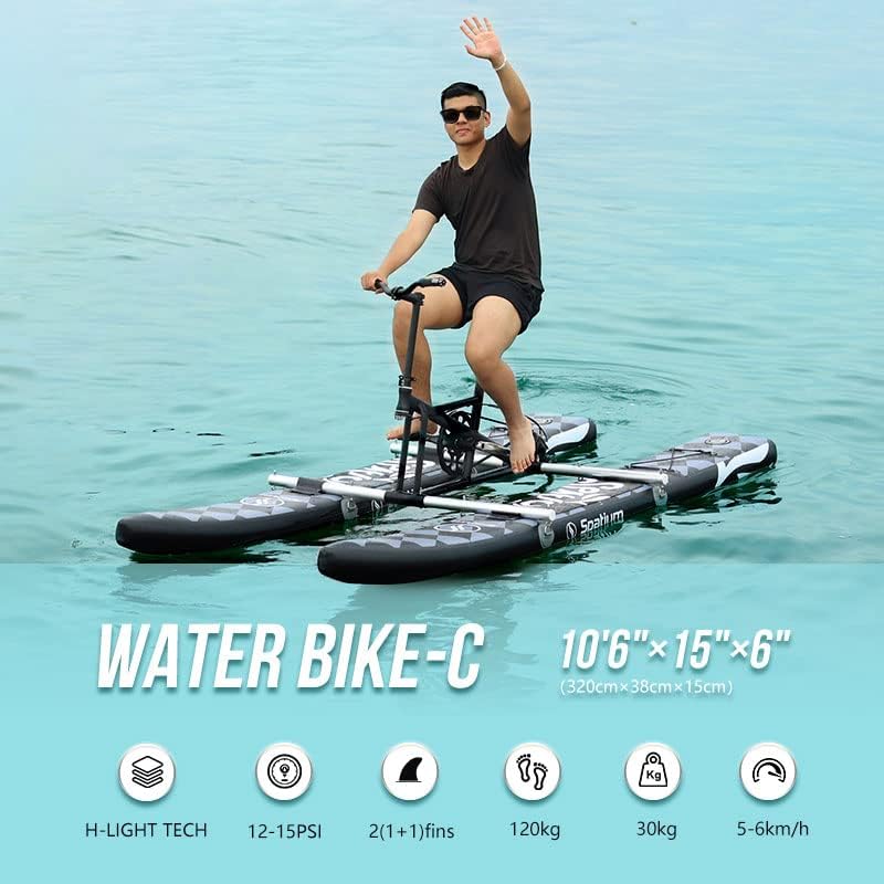 Nuovo stile per gli sport acquatici: il kayak a pedale gonfiabile Spatium è costituito da una bicicletta a elica attaccata a due pontoni SUP, la direzione dell'elica è controllata dal manubrio della bicicletta per cambiare la direzione dei pedali avanti e indietro, la velocità di crociera è di 6-8 km/h, quando si muove attraverso l'acqua è possibile liberare le mani e fare quello che vuoi Buona stabilità:La bicicletta ha una buona stabilità, può trasportare un adulto di 130 kg e può navigare liberamente anche in piccole onde; se non sai come fare surf, un pedalò è una buona scelta. Mobilità: la bici può essere smontata e assemblata e il telaio pesa solo 21 kg. Le dimensioni del telaio possono essere facilmente trasportate nel bagagliaio di un'auto di famiglia e il pontone è gonfiabile in modo che possa essere trasportato in uno zaino quando sgonfiato. Il gommone è molto leggero, pesa circa 30 kg e può essere facilmente sollevato da un adulto. Accessori per la pesca: abbiamo una borsa impermeabile per te sull'imbarcazione (montata sul sedile per riporre alcune esche), supporto per cellulare impermeabile, due supporti per canne, pinne, gonfiatore, secchio per la manutenzione del galleggiante, se hai bisogno di accessori per luci a led devi acquistare extra. Alcuni lotti potrebbero non avere accessori per la pesca, ti preghiamo di contattarci e li invieremo al tuo indirizzo. Sii sicuro:Quando si utilizza l'elica, appendere sempre il cavo di sicurezza dell'elica tramite il foro di sospensione sul retro del cambio e indossare un giubbotto di salvataggio allo stesso tempo. Non nuotare in acque ventose o agitate