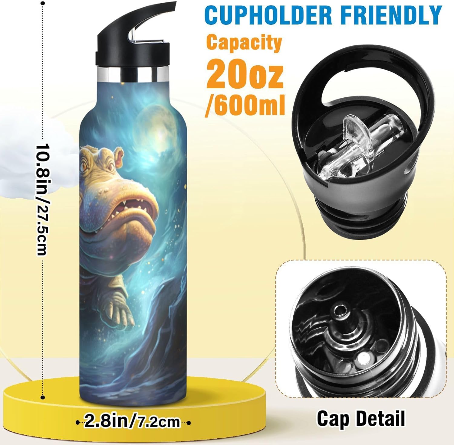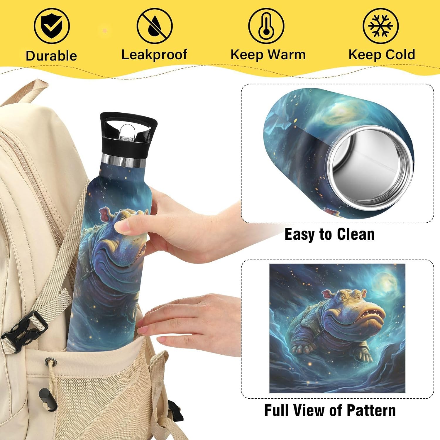 Spazio Blu Universo Ippopotamo Borraccia per Bambini in Acciaio Inossidabile Termica a Vuoto per Ragazzi e Ragazze (600 ml)