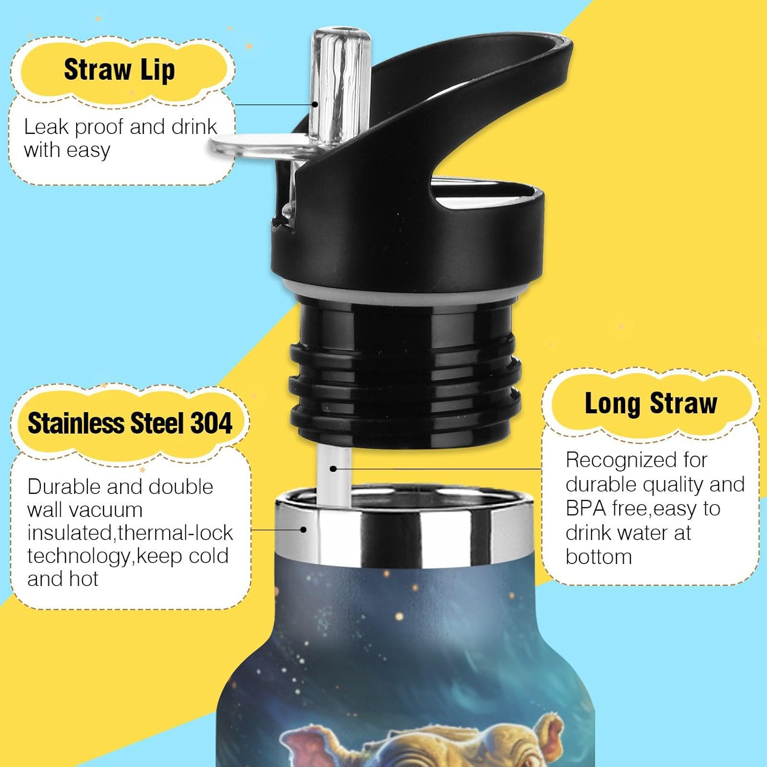 1. Materiali Di Alta Qualità e Utilizzo Sicuro: Realizzati in acciaio inossidabile 304 di alta qualità per uso alimentare, PP e silicone. Per garantire che le bevande del tuo bambino rimangano pure, sicure e prive di sostanze chimiche nocive. 2. Tecnologia Di Isolamento Avanzata: Presenta un isolamento sottovuoto a doppia parete con uno speciale strato termoisolante, che mantiene le bevande calde o fredde per lunghi periodi: fino a 10 ore per le bevande calde e 8 ore per quelle fredde. 3. Design Intuitivo: Include un'innovativa cannuccia pieghevole e una valvola di sfiato a prova di perdite, per garantire una bevanda fluida e senza fuoriuscite. Il design rimovibile consente una pulizia igienica completa. 4. Facile Da Trasportare: Dotato di un'impugnatura ergonomica allargata che può contenere comodamente due dita, consentendo ai bambini di trasportare facilmente e in sicurezza la propria bottiglia ovunque. 5. Ideale Per Tutte Le Stagioni e Attività: Progettato perfettamente per soddisfare le esigenze di idratazione dei bambini durante tutto l'anno, adatto per la scuola, lo sport, i picnic, le escursioni, i viaggi e l'uso quotidiano.