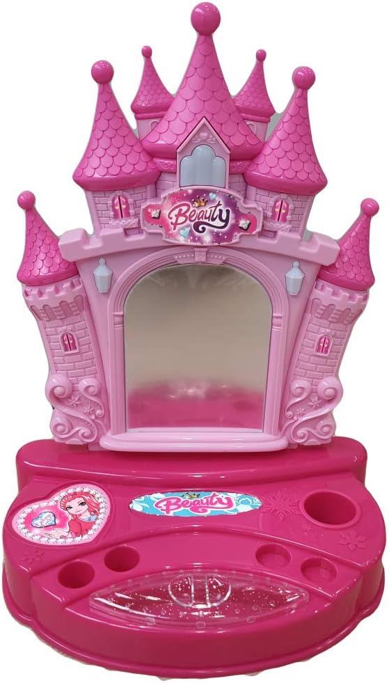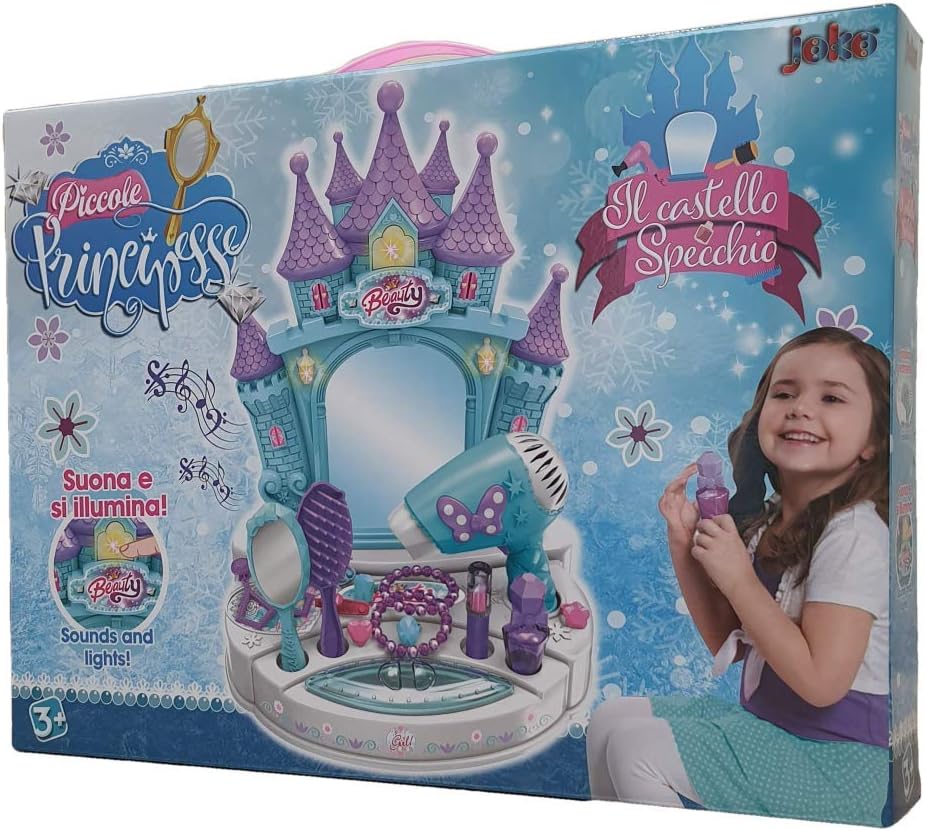 Specchiera corredata di gioielli per le nostre piccole principesse! La specchiera, dalla forma di un castello, si illumina e suona. Completa di: un paio di orecchini, quattro anelli, due mollettine, un rossetto, un lucidalabbra, due profumi, due bracciali, uno specchio, una spazzola e un asciugacapelli. Puoi personalizzare il prodotto grazie agli adesivi di cui è corredato il set. Dimensioni scatola: 45 x 33 x 6 cm Dimensioni specchiera: 33 x 28 x 18 cm