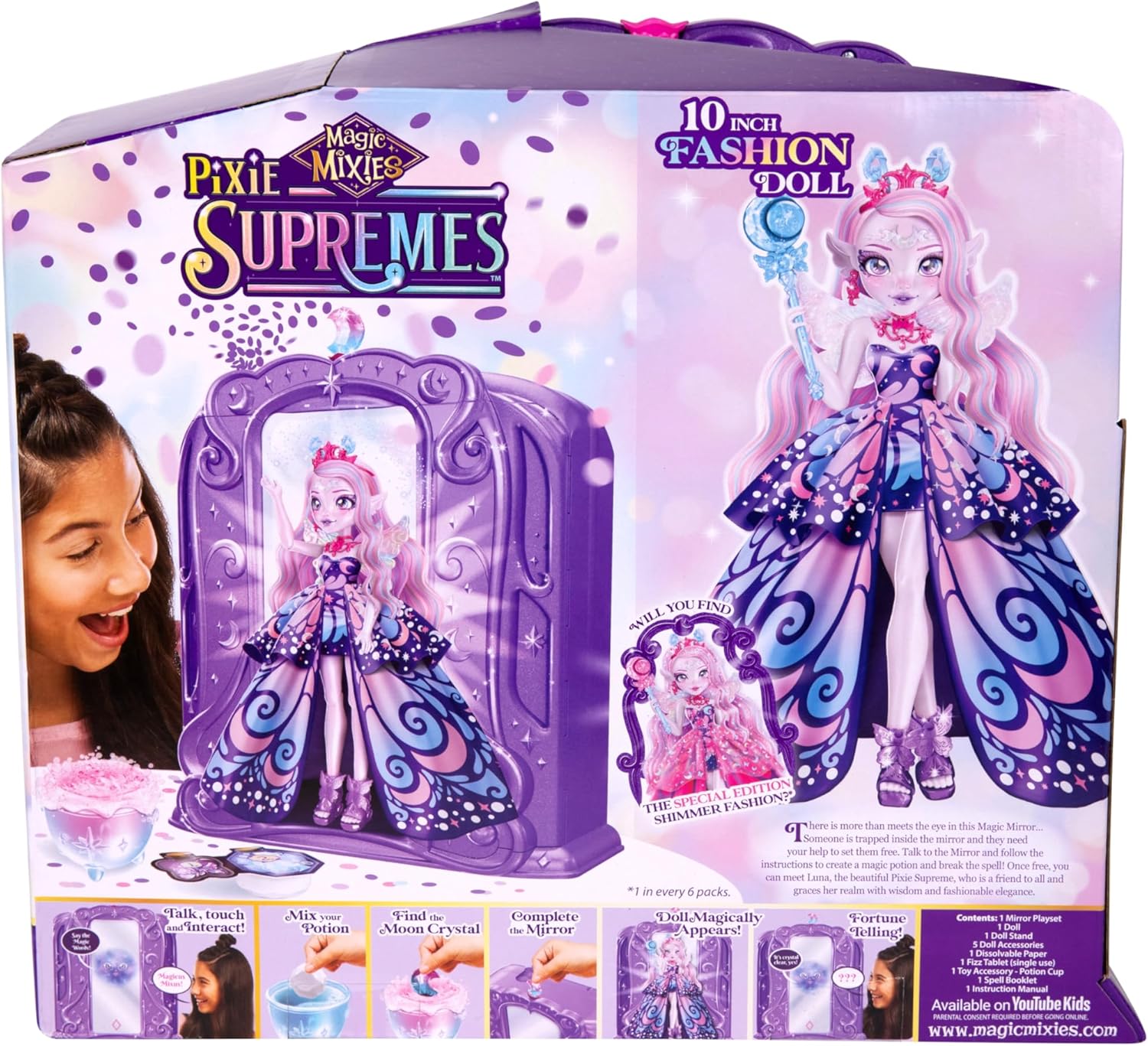 Risveglia lo specchio magico e crea una pozione magica per liberare una bambola Magic Mixies Pixie Supreme. Lo specchio magico ha oltre 50 luci e suoni con cui il tuo bambino può interagire e durante la rivelazione magica, con 5 minuti di gioco per il suo divertimento. La bambola Magic Mixies Pixie Supreme è alta 10,5 pollici ed è posizionabile con 9 punti di articolazione e viene fornita con uno speciale supporto per bambola, che la rende super divertente da modellare ed esporre. Luna è una bambola fashion snodabile di grandi dimensioni con 5 diversi accessori moda con cui il tuo bambino può giocare. Il tuo bambino adorerà anche giocare con la "modalità fortuna" dello specchio giocattolo ponendo domande allo specchio magico per vedere cosa riserva il suo futuro. La bambola Pixie Supreme di tuo figlio può essere posizionata nello specchio in modo che la magica rivelazione possa essere ripetuta ancora e ancora. Forse tuo figlio troverà la bambola "Shimmer" in edizione speciale. C'è una possibilità su 6 di trovare questa incredibile bambola.