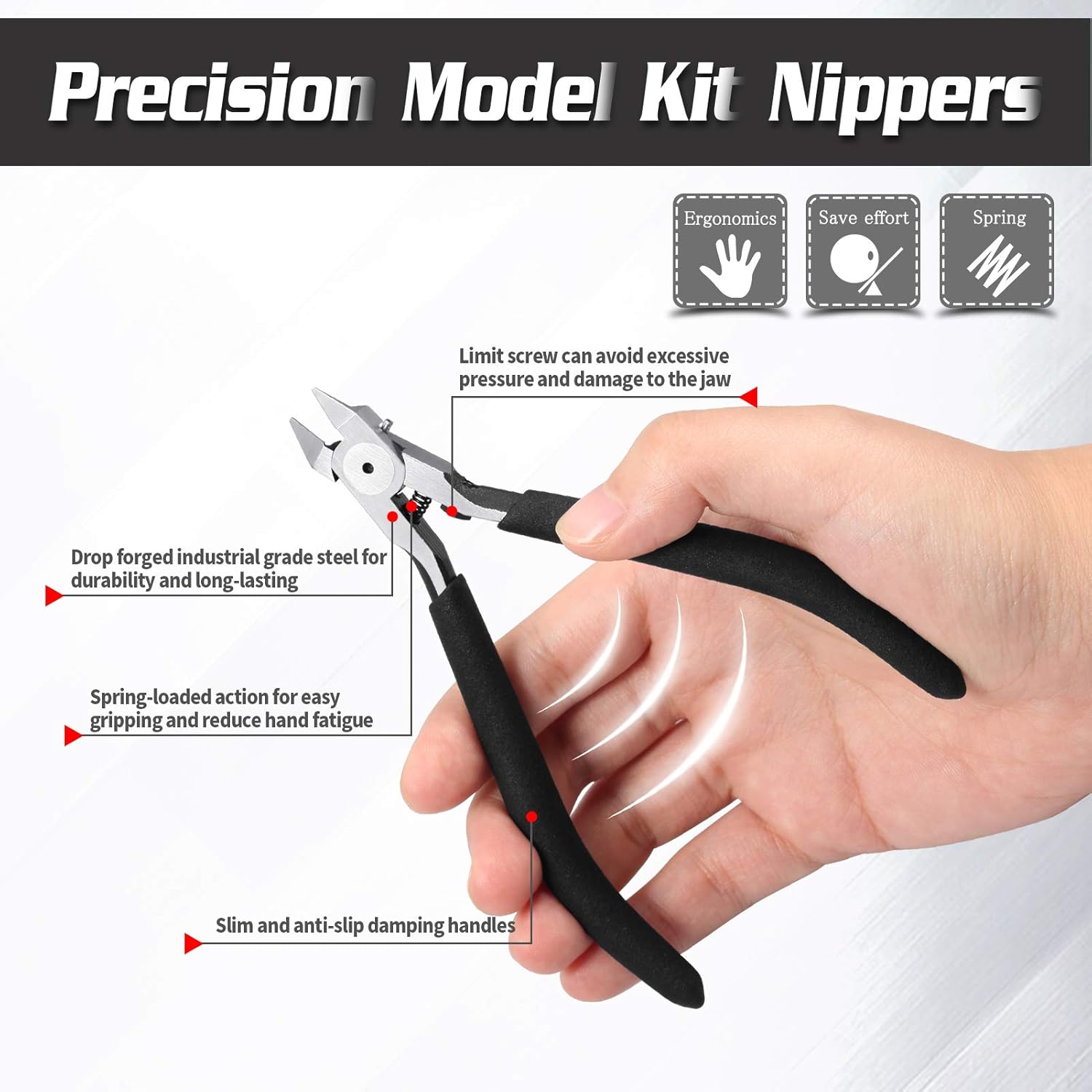 Contenuto della confezione: 1 tronchese da 12,7 cm. Blocco di lucidatura x 1. 1 scatola di plastica. 1 tappo di protezione. Pinza per modellini: realizzata in acciaio al cromo vanadio. Acciaio di grado industriale forgiato a goccia per una maggiore durata e durata. Ampiamente usato su resine PS, PP, PE e ABS. Puoi usarlo per riparare e riparare molti modelli, come auto, robot, edifici Gundam, aerei e altri mestieri. Design: con un bordo singolo e la punta del bordo è di soli 0 cm, la lama sottile può chiudersi alla parte per tagliare in modo pulito, riducendo il tempo di macinazione e la resistenza della taglio. La vite limite può evitare una pressione eccessiva e danni alla mascella. L'azione a molla riduce l'affaticamento della mano e del polso per un facile utilizzo con una sola Manici ammortizzanti in Plastisol per antiscivolo. Tutte le pinze sono rifinite con superficie lucida. Altri articoli: il blocco di lucidatura può essere utilizzato per rifinire i bordi del modello, adatto per legno, plastica, metalli morbidi. Con lucidatura grossolana e lucidatura fine, adatto a diverse situazioni. Con tappo di protezione di sicurezza per proteggere la lama. Con una scatola di plastica, facile da trasportare e riporre. Olio antiruggine: l'olio antiruggine può apparire sulle pinze, può proteggere le pinze dalla ruggine. Non è sporco o prodotti usati, è possibile pulirlo con un asciugamano e non influirà sulla funzione.