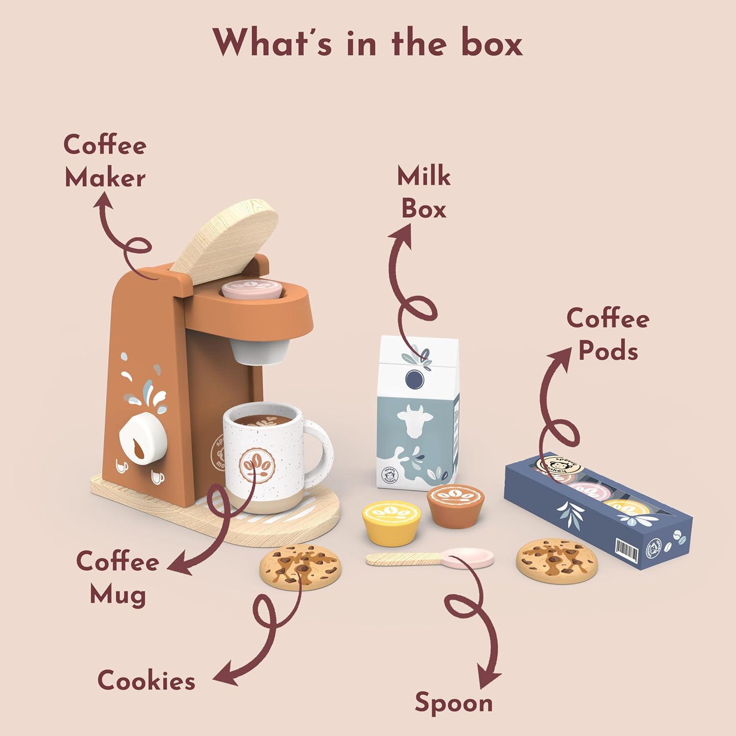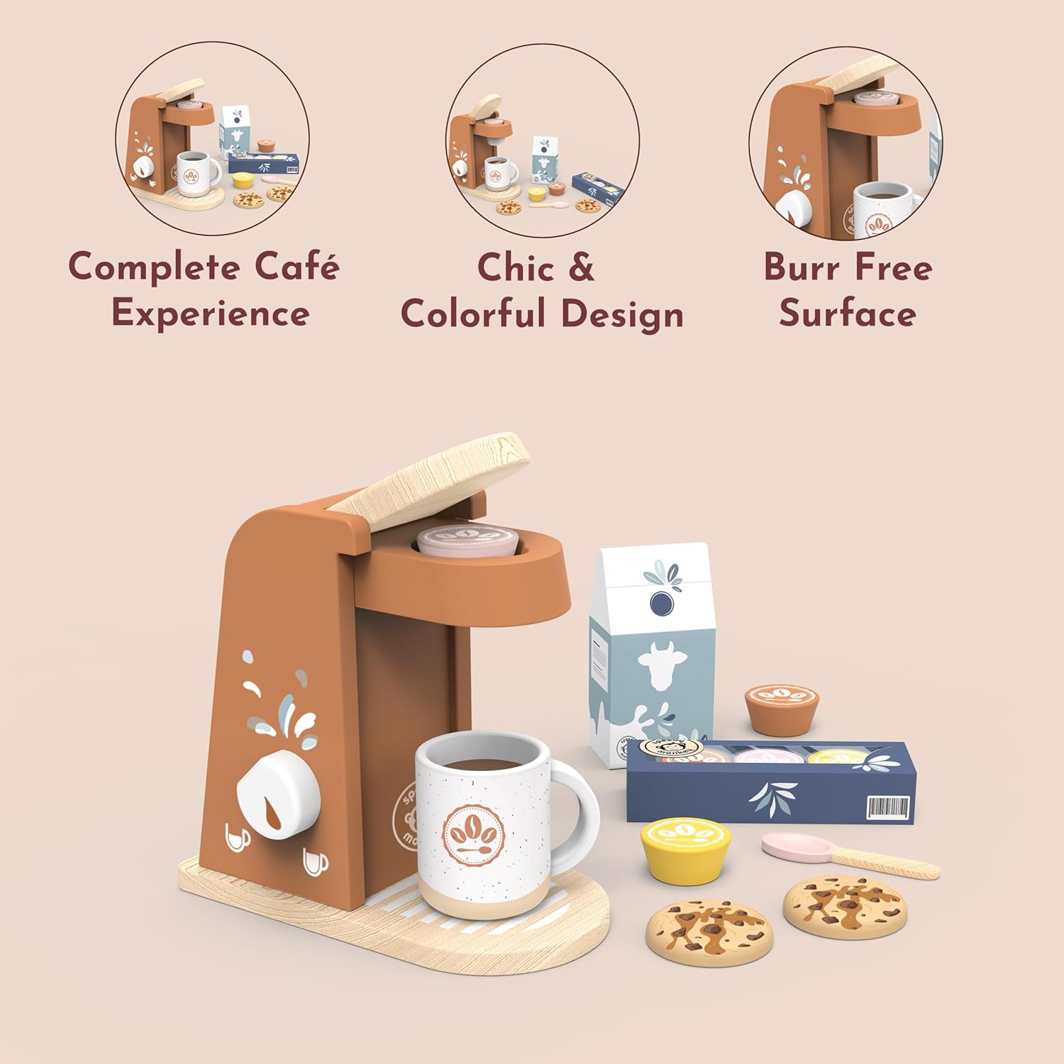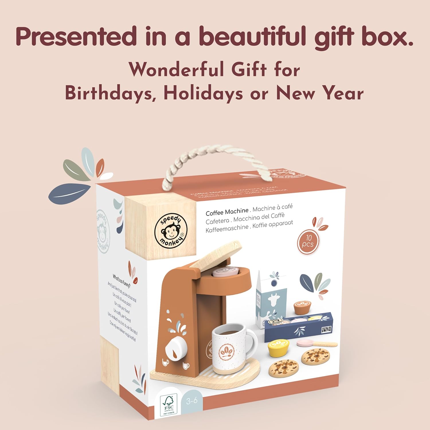 Bellissimo design: questa macchina da caffè giocattolo affascina con il suo bel design, perfetta per i giocattoli dei bambini dai 3 anni. Si abbina a qualsiasi cucina per bambini, stimolando il gioco fantasioso con giocattoli per ragazzi e ragazze dai 2 anni Sicuro: la sicurezza è fondamentale in Speedy Monkey. Con bordi lisci e vernice atossica, questa è una scelta ideale per giocattoli per ragazze e accessori da cucina giocattolo. Ideale per giocattoli alimentari in legno e migliorare le cucine dei bambini con giocattoli in legno per bambini. Sostenibile e facile da pulire: realizzata in legno certificato FSC, questa macchina da caffè giocattolo da cucina in legno per bambini garantisce un gioco ecologico ed è facile da pulire con un panno umido, rendendo la pulizia un gioco da ragazzi per genitori impegnati Educativo: incoraggia la creatività con accessori da cucina in legno. Questo giocattolo per bambini dai 3 anni favorisce l'apprendimento attraverso il gioco, ideale per sviluppare abilità di gioco di ruolo nei giocattoli per ragazze dai 2 anni in su Perfetto per giochi di ruolo: migliora l'immaginazione del tuo bambino con questa cucina in legno. Perfetto per accessori da cucina per bambini, è una meravigliosa aggiunta a qualsiasi collezione di giocattoli da cucina in legno per i più piccoli.
