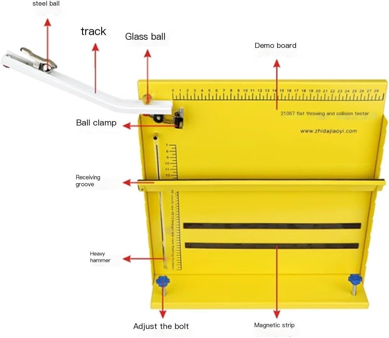 Lo strumento può descrivere accuratamente la traiettoria del moto del paraboloide e misurare la velocità iniziale del paraboloide. La struttura dello strumento è semplice e il funzionamento è comodo, il che è utile per gli studenti che sperimentano in gruppo. Lo strumento è sostenuto dalla barra di lancio piatta (per sostenere la palla da lancio piatta); la posizione e l'altezza della palla da lancio piatta possono essere regolate. E lancia la palla orizzontalmente), cattura la palla (cattura la palla lanciata in orizzontale e fai in modo che la palla tracci automaticamente il punto di tracciamento); Martello pesante (regolare il dispositivo sperimentale per raggiungere la posizione orizzontale), bulloni di livellamento (regolazione di quattro bulloni di livellamento, cooperare con il martello pesante per raggiungere la posizione orizzontale); sfere di acciaio, strisce magnetiche, pannelli, basi, ecc. Fissare la guida di lancio piatta alla posizione anteriore del pannello mediante viti; la parte orizzontale dell'estremità della guida deve essere perpendicolare alla linea del peso.