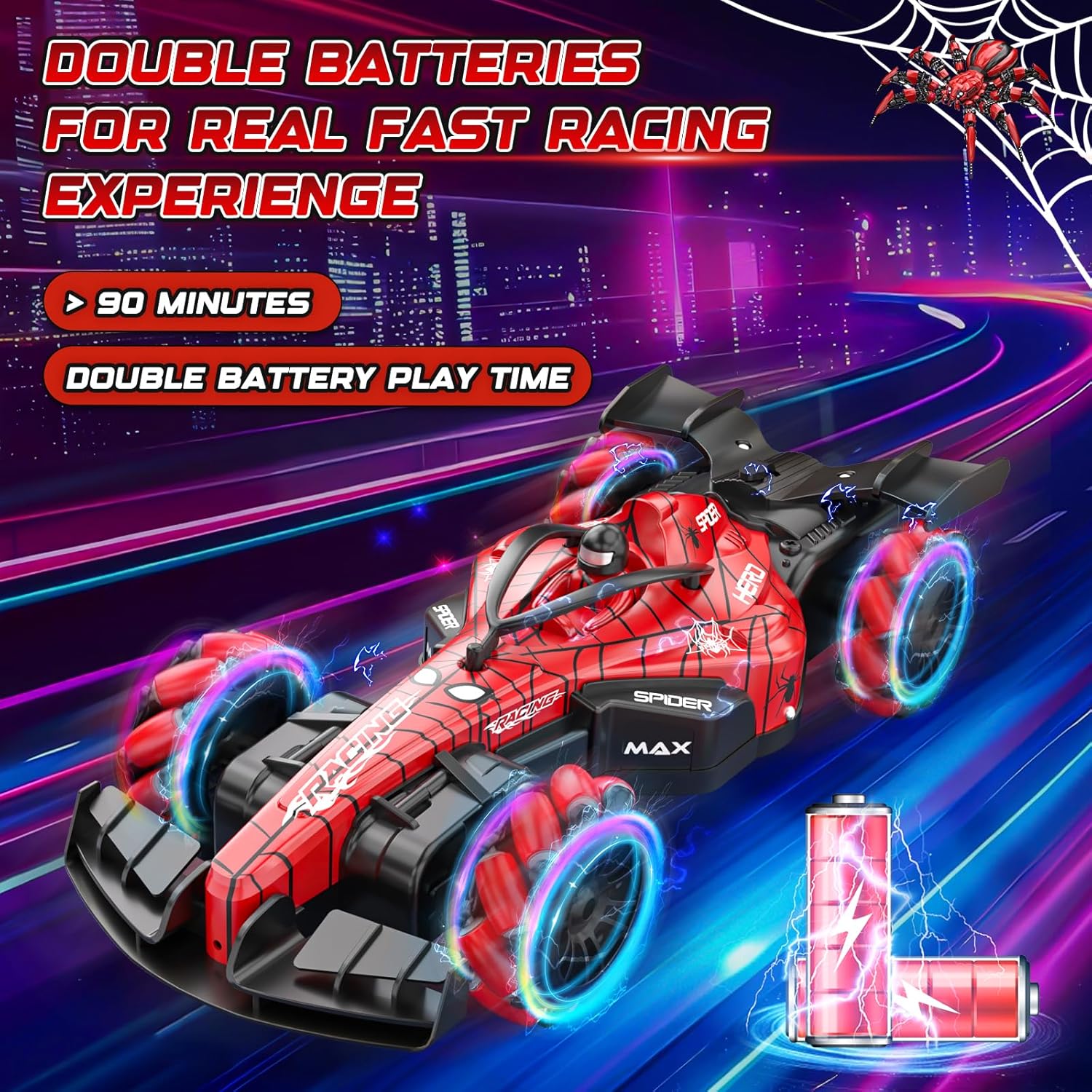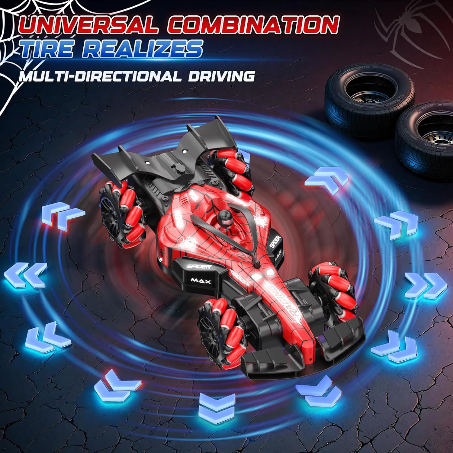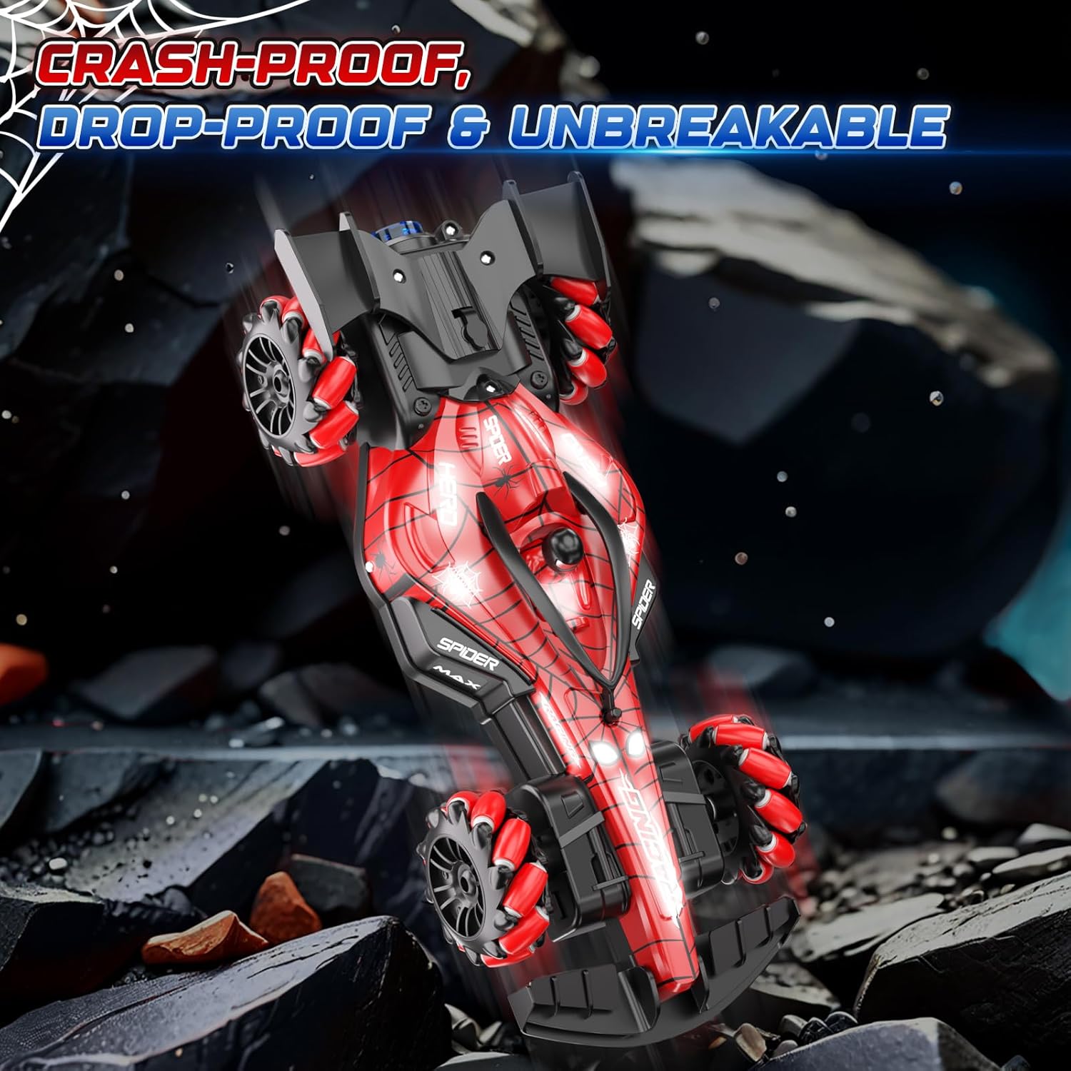 [Spider-Action Deluxe] - Provate le spettacolari manovre di Spider! Questa Spider macchina telecomandata per bambini 3 4 5 6 7 8 9 Anni avanza, arretra e si sposta lateralmente alla velocità della luce, esegue virate mozzafiato e acrobazie agili. Con le fantastiche luci LED Spider e gli effetti sonori accattivanti, ogni avventura diventa un'esperienza ricca di azione per i piccoli eroi [Design e prestazioni Potenti Spider] - Ispirato alla mobilità di Spider! L'auto telecomandata Spider convince con il suo design robusto a tema ragno. La potente batteria da 2 V garantisce fino a 80 minuti di divertimento per ogni ricarica e velocità superiori a 10 km/h. Il telecomando ha una portata fino a 30 metri (100 piedi) [Controllo Spider Anti-interferenza a 2,4 GHz] - Divertimento Spider senza interferenze per tutti! Il telecomando a 2,4 GHz garantisce un controllo preciso della tua macchina radiocomandata Spider. Più auto Spider possono guidare contemporaneamente senza ostacolarsi a vicenda: perfetto per gare e avventure di squadra con amici o fratelli [Potenza Spider su Tutti i Terreni] - Conquista qualsiasi terreno come un eroe Spider! Realizzata in robusta plastica ABS, questa Spider macchina telecomandata per bambini con trazione 4WD e pneumatici ad alta aderenza affronta senza sforzo interni, tappeti, erba, sabbia e terreni irregolari. Pronta all'azione sia all'interno che all'esterno [Il Regalo Spider Definitivo] - La modalità demo con un solo pulsante mostra tutte le acrobazie Spider! Un regalo perfetto per compleanni, feste Spider, la festa dei bambini o Natale. Ideale per bambini e bambine dai 3 anni in su che amano il divertimento Spider ricco di azione