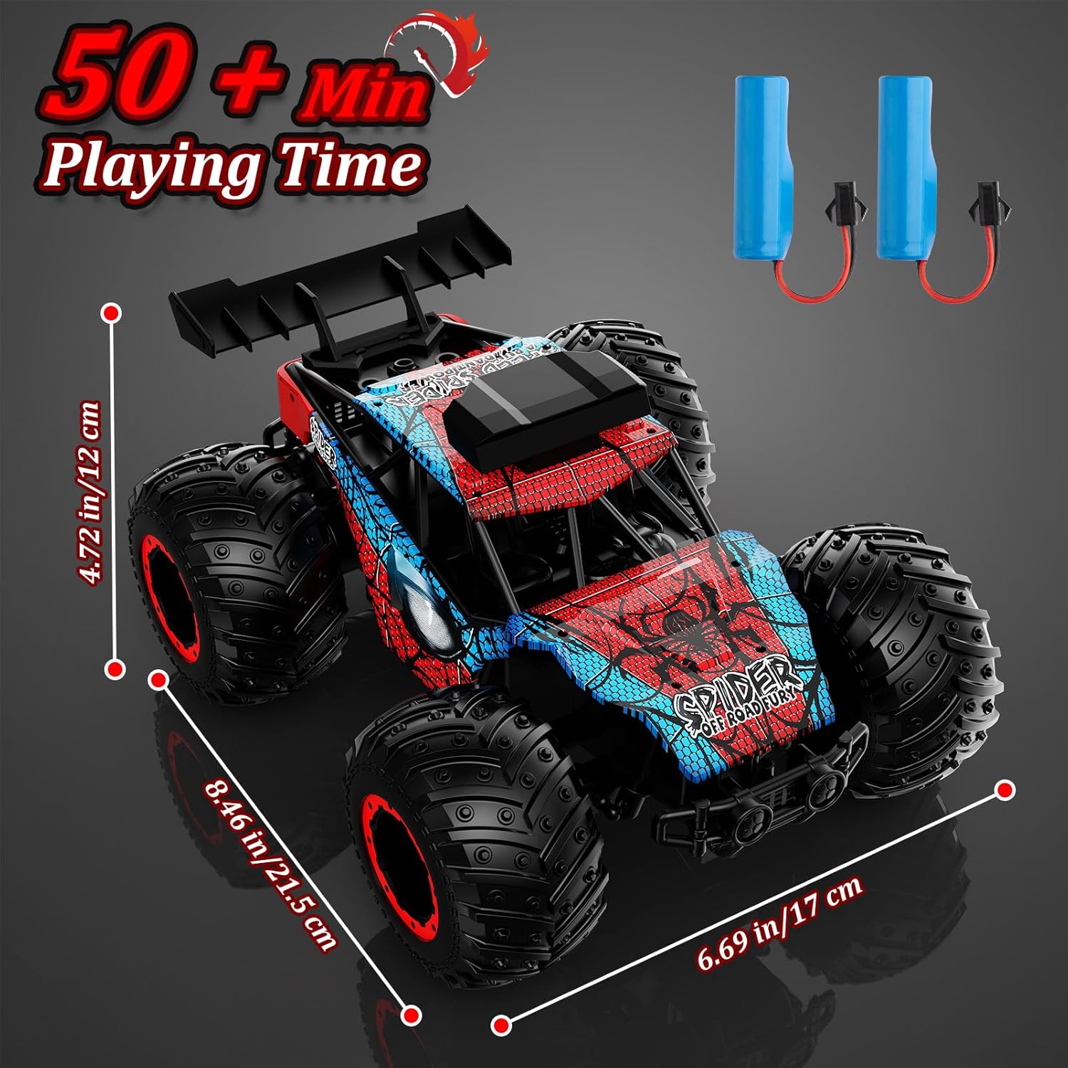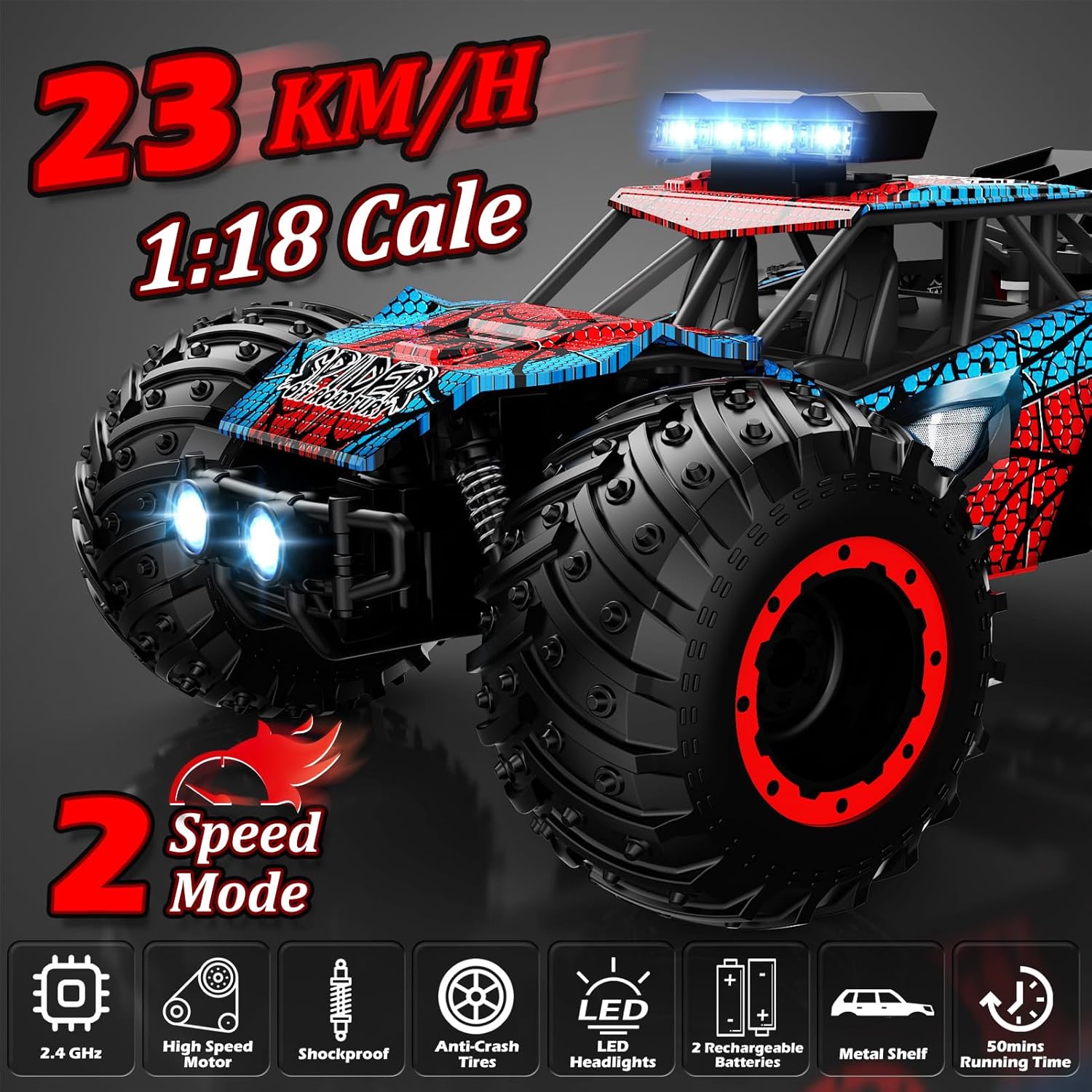 🚗 CARROZZERIA IN LEGA DI ALLUMINIO, RESISTENTE E PREMIUM La scocca di questa macchina telecomandata è realizzata in lega di alluminio resistente agli urti. Leggera ma solida, offre una sensazione di alta qualità e un design moderno, ideale per chi cerca una macchina radiocomandata durevole e sicura. 🦸♂️ DESIGN ISPIRATO AI SUPEREROI, ADORATO DAI BAMBINI Con uno stile unico a tema supereroe, questa macchinina telecomandata bambino è perfetta per stimolare l'immaginazione. Ottima scelta per giocattoli bambina 6 anni o giochi bambino 7 anni maschio. ⚡ ALTA VELOCITÀ E CONTROLLO PRECISO FINO A 60 M Dotata di un motore potente, la macchina raggiunge i 23 km/h. Il radiocomando a 2,4 GHz garantisce un controllo proporzionale fluido e senza interferenze. Ideale per corse all’aperto con più macchine telecomandate o rc car contemporaneamente. 🔋 DOPPIA BATTERIA INCLUSA, AUTONOMIA PROLUNGATA Fornita con due batterie ricaricabili, offre fino a 40 minuti di gioco. Una scelta pratica per chi cerca un regalo utile e duraturo, perfetta come macchina telecomandata per bambini o regali per bambini di 11 anni. 🌙 LUCI LED + SOSPENSIONI 4X4, PERFETTA ANCHE DI NOTTE Grazie alle sospensioni indipendenti 4x4 e alle 10 luci LED integrate, questa macchina telecomandata 4x4 affronta facilmente sabbia, erba e terreno irregolare. Ideale anche come camion telecomandato compatto per giochi notturni.