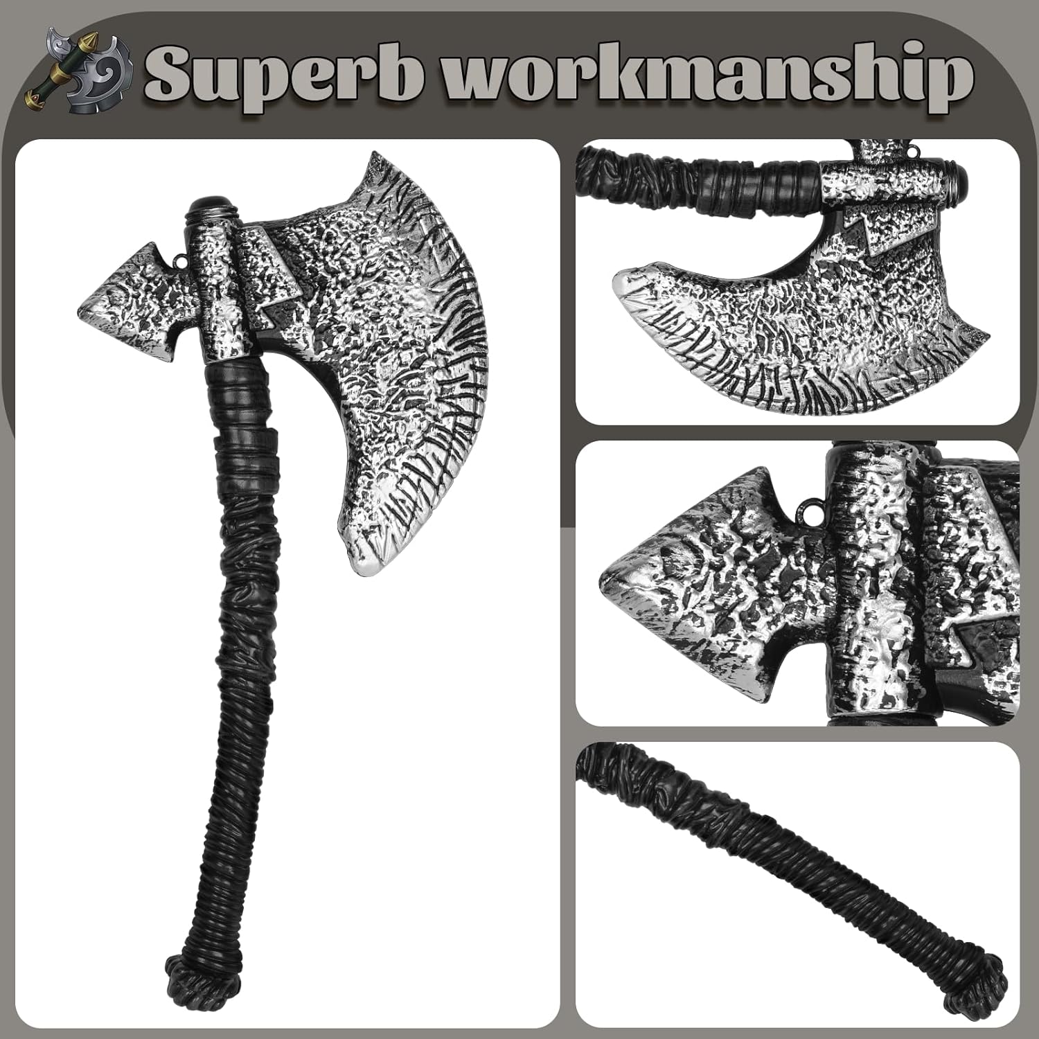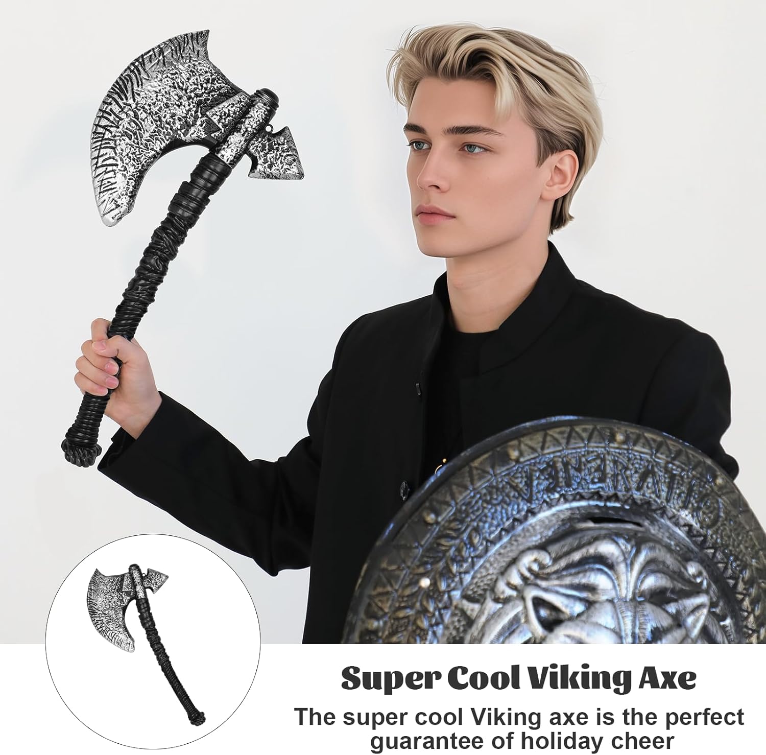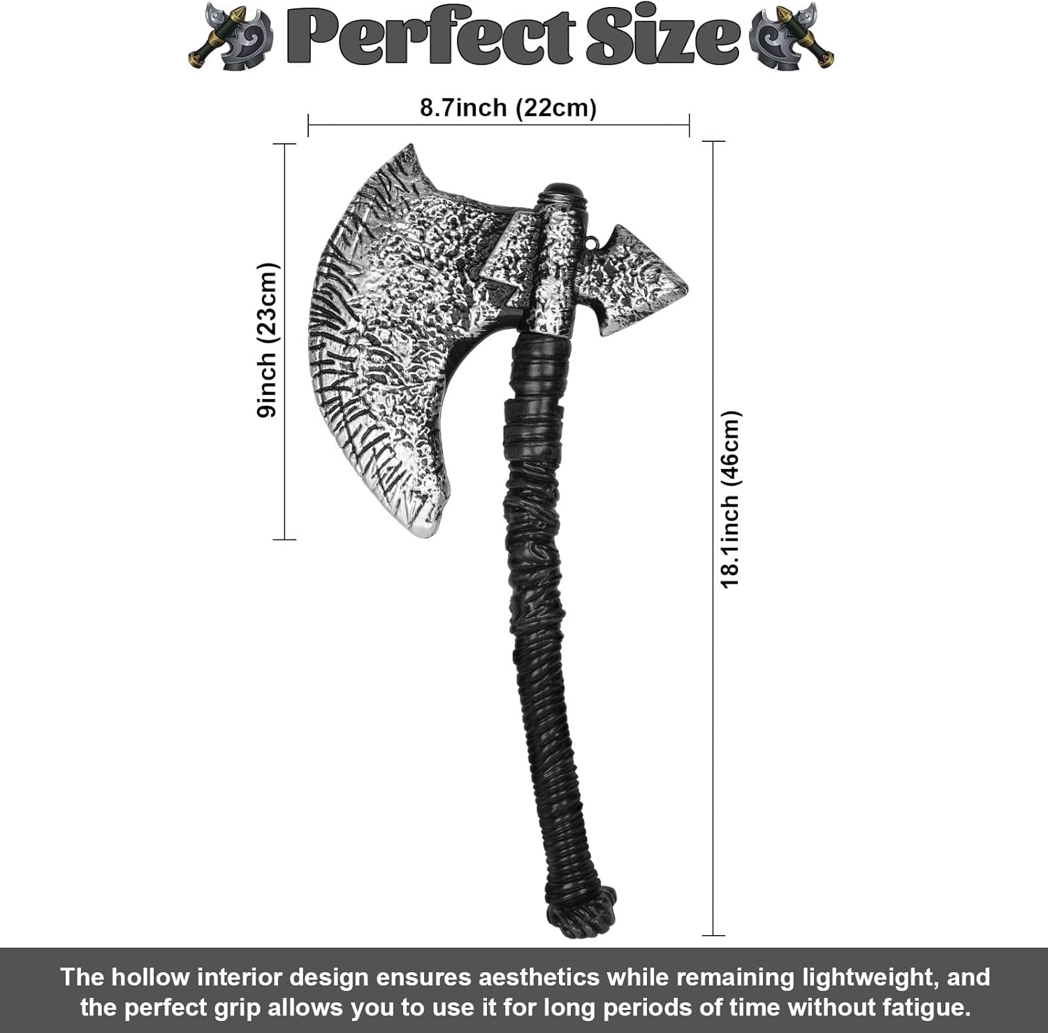【Divertenti oggetti di scena per asce vichinghe】 I nostri oggetti di scena per asce presentano un design unico a doppio taglio, costituito da una grande testa d'ascia in argento metallizzato strutturato e un manico d'ascia molto resistente (il manico curvo è il design normale), che puoi facilmente mettere insieme per creare un'esperienza di travestimento coinvolgente ed essere coraggioso come un vero guerriero vichingo. Dimensioni dell'ascia vichinga: lunghezza dell'ascia: 47 cm, larghezza dell'ascia: 22 cm. Le dimensioni e l'ottima maniglia ti consentono di usarlo a lungo senza stancarti durante le vacanze, e il design interno cavo offre estetica mantenendo il peso sotto controllo. 【Materiali dell'ascia vichinga】 Questa ascia vichinga è realizzata in plastica per garantire un gioco sicuro. Potresti usare questo costume con i tuoi bambini per divertirti con le battaglie vichinghe, sviluppare l'immaginazione dei bambini e lasciare che creino le proprie storie di gloria e coraggio vichinghi. Significativo per gli appassionati di travestimenti: se stai ancora pensando ai regali di festa per i tuoi figli, amanti e amici, allora questa nostra ascia vichinga potrebbe essere adatta a te. È una grande aggiunta ai tuoi accessori per costumi di Halloween e alla tua collezione di armi. Crediamo che la persona che riceverà questo regalo durante le vacanze sarà felice, questa sorpresa è così bella. Sii il vincitore della vacanza: presentati davanti a tutti al festival con questa ascia in mano vestito come il temibile pirata, il coraggioso cavaliere, il barbaro nordico e il guerriero vichingo che vuoi interpretare. Questo accessorio per costumi super divertente ti farà sicuramente guadagnare molti applausi e sarà al centro dell'attenzione durante la festa, e sono sicuro che riceverai molte richieste di foto.