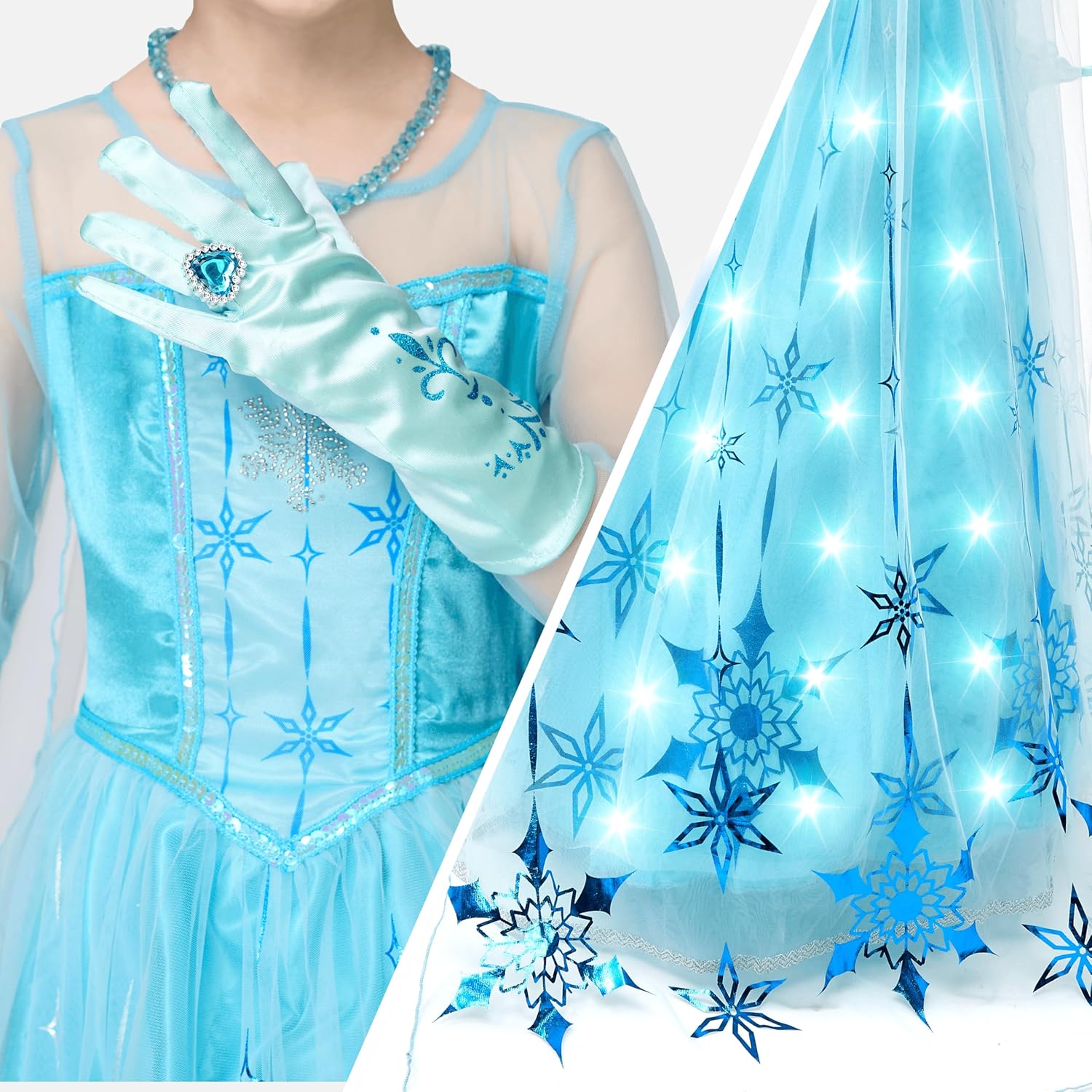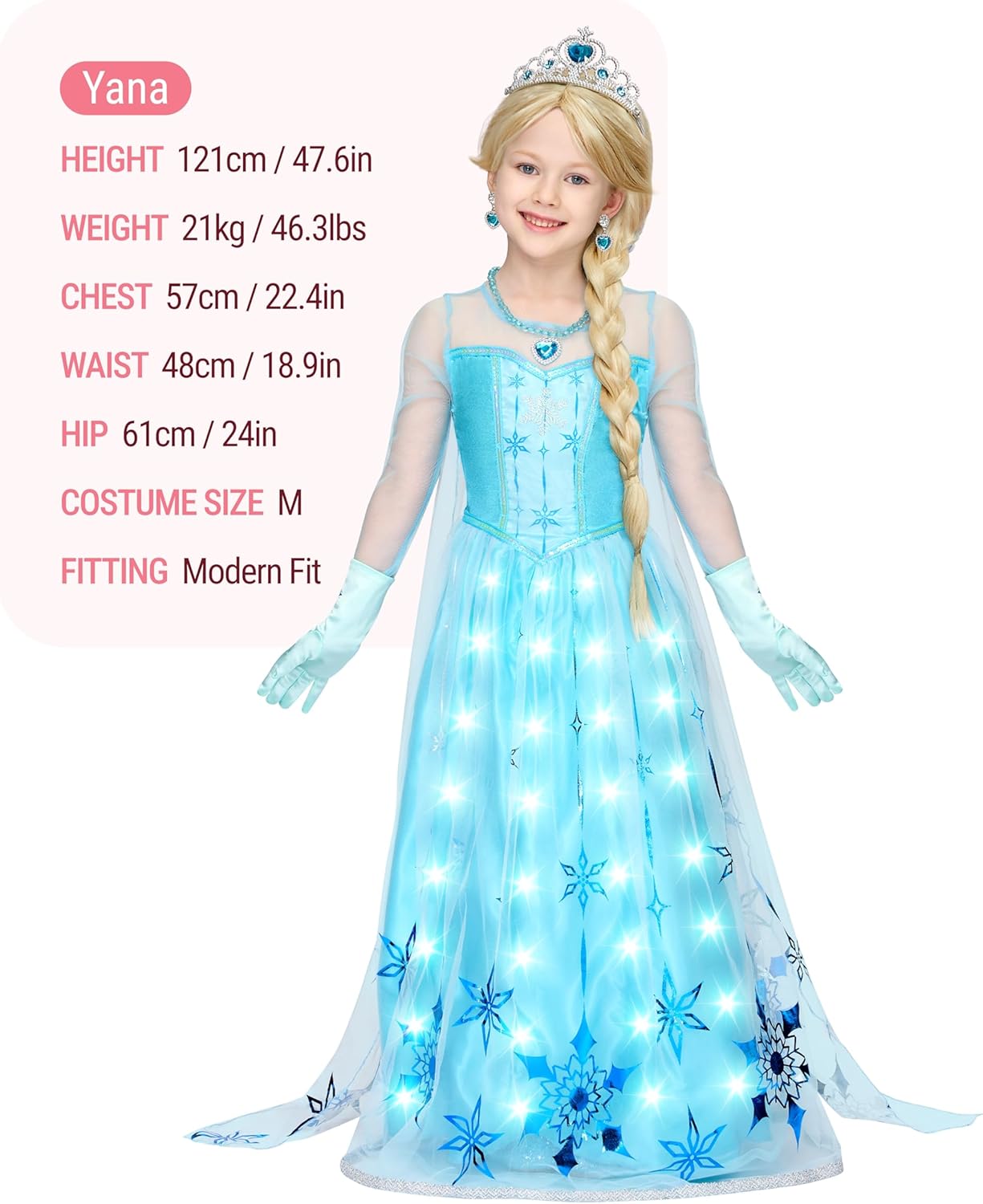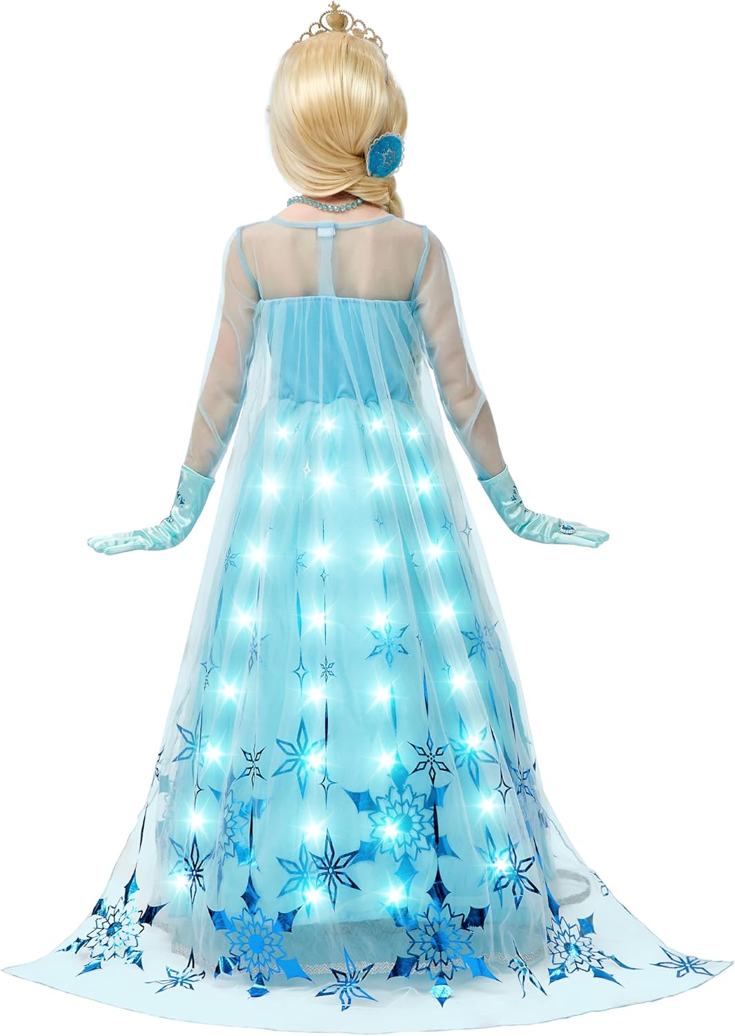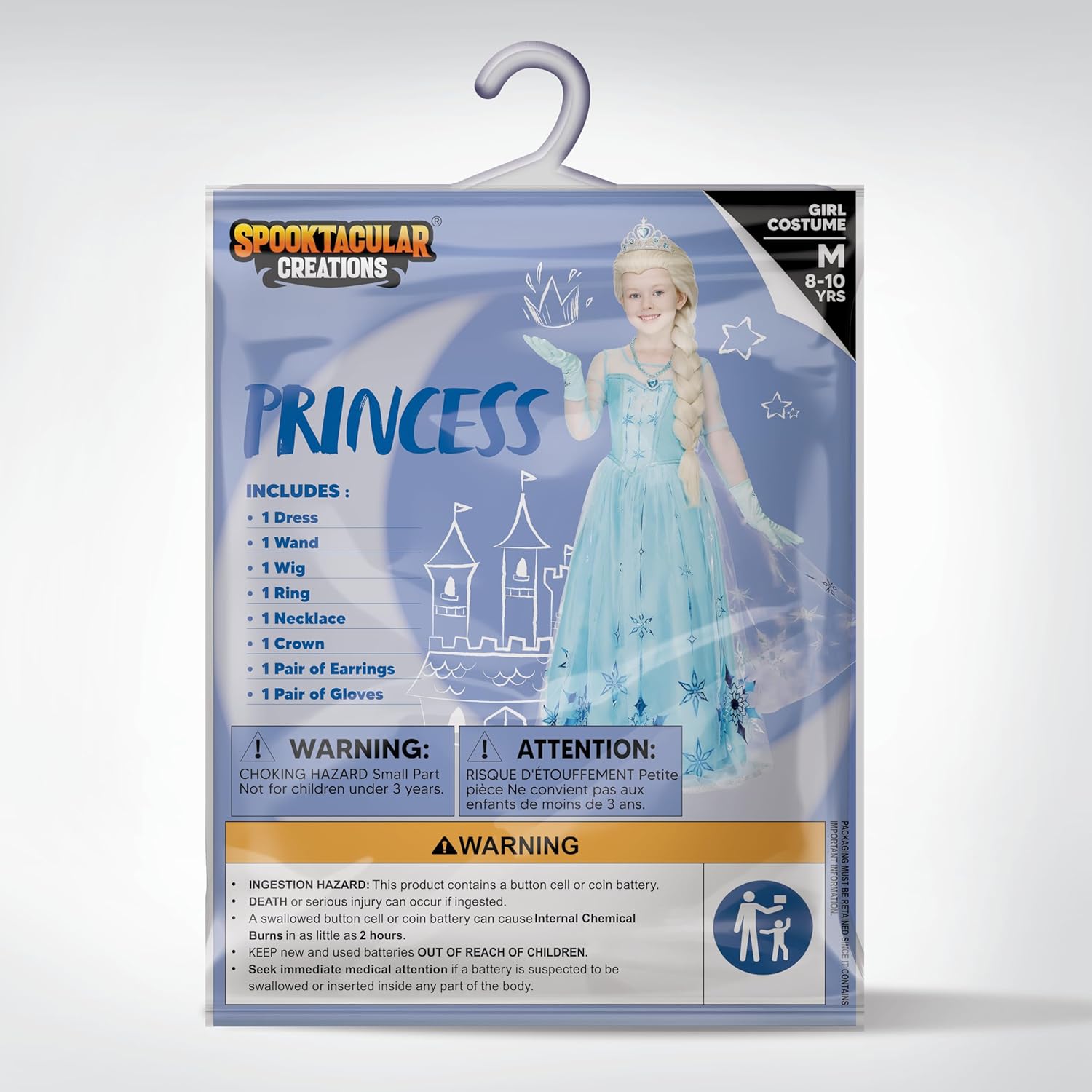 Spooktacular Creations 8 Pezzi Abito da Principessa del Ghiaccio Illuminato per Ragazze, Costume da Principessa con Mantello Lungo, Abito da Neve con Paillettes e LED per Compleanno di Bambini, Cosplay, Festa di Halloween SET FANTASTICO: Questa principessa del ghiaccio illuminata con completo in stile blu è composta da 1 vestito con un lungo mantello, 1 bacchetta magica, 1 anello a cuore, 1 collana di perline, 1 corona splendente, 1 paio di orecchini blu, 1 paio di guanti lunghi e 1 parrucca a coda di cavallo (parrucca non a testa intera), fornendo tutto il necessario per ottenere il look perfetto da principessa. (*Nota: la parrucca sarà diversa da quella mostrata nell'immagine) MATERIALI DI ALTA QUALITÀ: Realizzato al 100% in poliestere, il vestito con orlo multistrato a vita alta presenta una sottile elasticità. Il colletto in rete e le maniche lunghe, insieme alla gonna in rete e raso decorata con motivi di fiocchi di neve in paillettes spalmate, aggiungono un tocco incantevole. È dotato di velcro sul retro per indossarlo e rimuoverlo facilmente, garantendo un'esperienza luminosa e confortevole. Il nostro abito da tea party per ragazze è perfetto per una vasta gamma di occasioni, incluse feste in costume di Halloween, giochi di ruolo, feste cosplay, compleanni, tea party e spettacoli teatrali. Con un tocco magico aggiunto dall'illuminazione sulla gonna, diventa la star dello spettacolo! FACILE CURA: la manutenzione di questo costume da principessa azzurro è semplice, si consiglia di pulire con una spugna. Evitare il lavaggio in lavatrice, lo sbiancamento, l'asciugatrice e la stiratura per preservarne la qualità e l'aspetto. Disponibile nelle taglie 3T (3-4 anni), Small (5-7 anni) e Medium (8-10 anni), l'abito da principessa del ghiaccio LED offre una vestibilità moderata per adattarsi alla maggior parte delle figure femminili. Controlla la tabella delle taglie per trovare quella adatta.