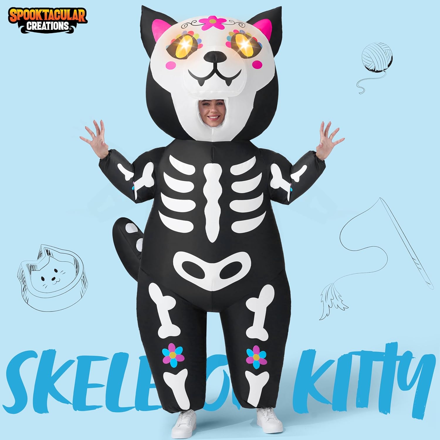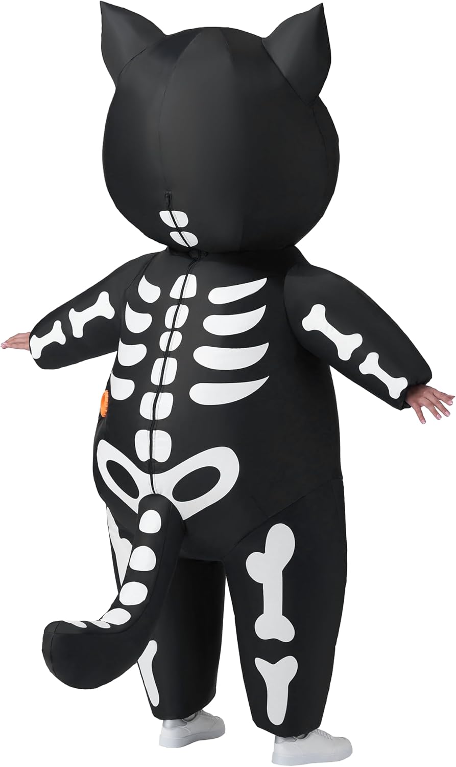 Set completo: il nostro set di costumi gonfiabili deluxe include 1 costume gonfiabile per cane scheletro, 1 strumento gonfiabile, 1 foglio di istruzioni dettagliate e 1 alimentatore portatile (richiede 7 batterie AA, batterie non incluse nel set). È dotato di occhi illuminati e orecchie gonfiabili con motivo a scheletro, coda e colletto con denti di lupo, creando una fantastica immagine di un cucciolo nero, aggiungendo molto divertimento alle tue feste a tema Halloween. Occasioni versatili: è un modo divertente e unico per stare in piedi esci in qualsiasi evento con il nostro costume gonfiabile per cani da cavalcare, perfetto per varie occasioni, tra cui feste in costume di Halloween, feste in costume, eventi cosplay, feste a tema, spettacoli teatrali, giochi di ruolo, eventi notturni di Halloween. Materiale di qualità: il nostro set di costumi gonfiabili per cuccioli è realizzato al 100% in fibra di poliestere ed è stato sottoposto a test di sicurezza approvati. Inoltre è morbido, confortevole e resistente per tutte le avventure che avrai. C'è una cerniera qualificata sul retro per indossarla facilmente e mantenerla sempre gonfia, facile da rimuovere. Presenta un cordoncino elastico intorno alla vita per una vestibilità sicura e confortevole, assicurati che sia stretto correttamente prima di gonfiarlo. Facile manutenzione: questo costume gonfiabile di Halloween non è facile da macchiare, inoltre la pulizia è un gioco da ragazzi poiché è facile da mantenere, semplicemente si consiglia di pulire con una spugna. Ricordarsi di rimuovere gli strumenti di gonfiaggio e la scatola di alimentazione prima della pulizia. Evita il lavaggio in lavatrice, il candeggio, l'asciugatrice e la stiratura. Taglia perfetta: il costume da cane scheletro di Halloween è appositamente progettato per la taglia degli adulti, il costume si adatta fino a 6 piedi di altezza, garantendo una vestibilità perfetta per i più adulti!