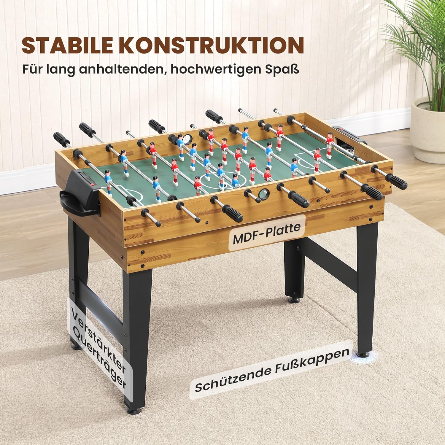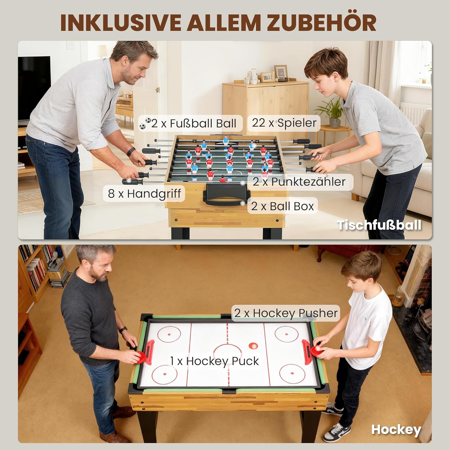 Tavolo multifunzionale 13 in 1: sperimenta 13 giochi diversi con un solo tavolo grazie ai piani del tavolo facilmente intercambiabili, dal calcio balilla agli scacchi. Senza tavoli aggiuntivi. Un tavolo, divertimento infinito in famiglia e competizione amichevole. Design impilabile: la sofisticata funzione di impilamento consente di riporre in modo compatto il biliardino. Quando non vuoi giocare, devi solo impilare i biliardi per risparmiare spazio. Casa più pulita e ordinata. Costruzione stabile: realizzato in robusto MDF e rifinito con una superficie liscia, questo tavolo da gioco garantisce una superficie di gioco stabile. Le gambe sono dotate di poggiapiedi che impediscono lo scivolamento e proteggono il pavimento dai graffi, per un divertimento senza eguali. Divertimento condiviso per tutta la famiglia: variate i giochi e assicuratevi un divertimento duraturo. Questo tavolo da biliardo multigioco trasforma ogni serata in un'indimenticabile serata di gioco con la famiglia e assicura risate e momenti divertenti che avvicinano tutti. Dimensioni complessive del tavolo da gioco: 121 L x 109 L x 80 A cm (con maniglie e scatole). Dimensioni del calcio balilla: 121 L x 67 L x 80 A cm. È richiesto il montaggio