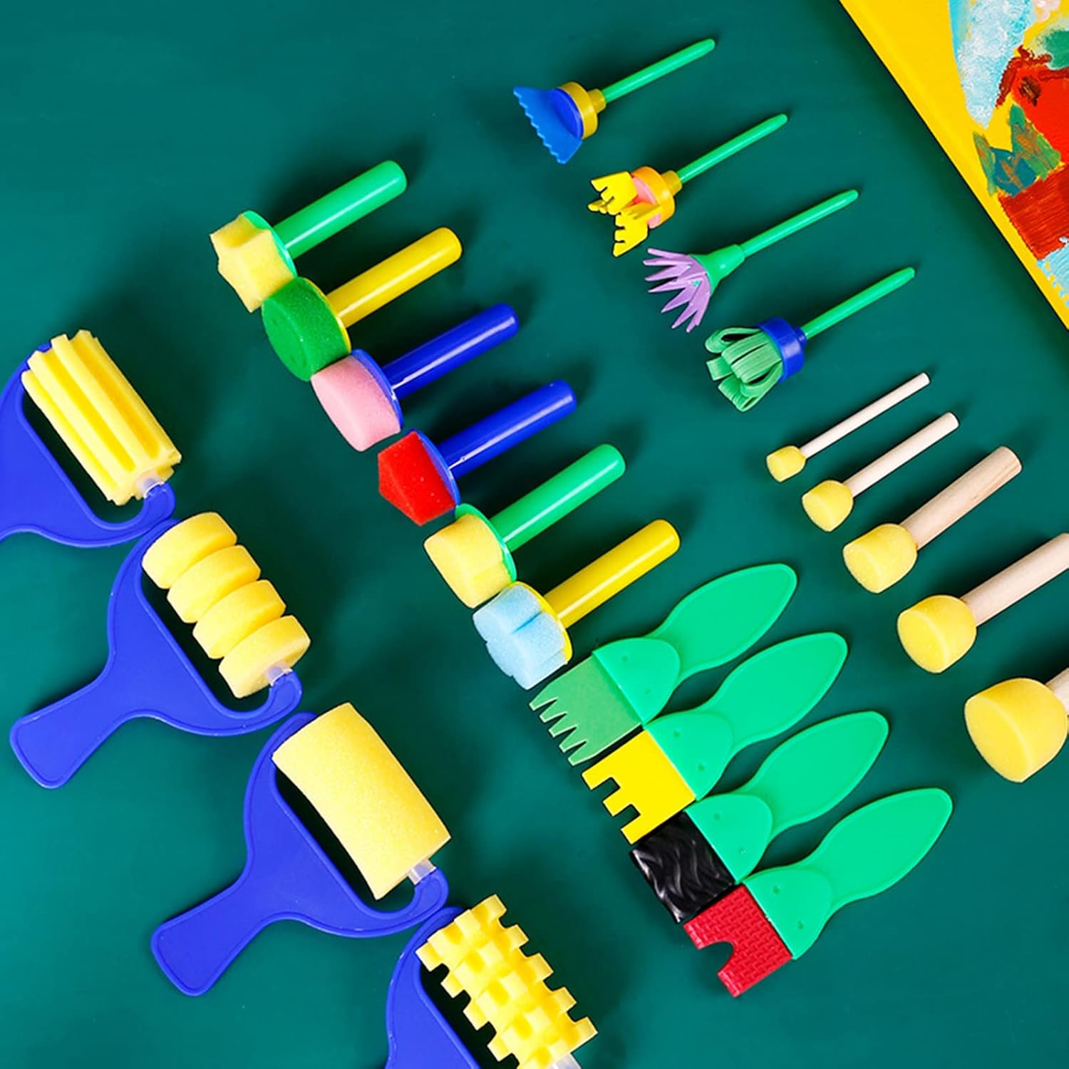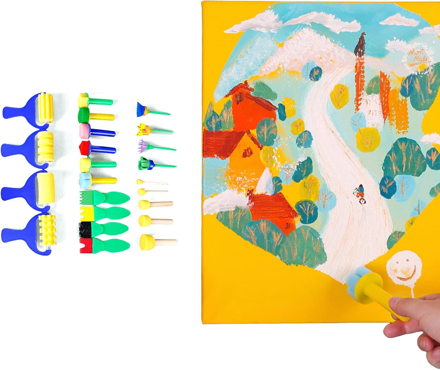 Le teste di questi pennelli da pittura sono in spugna, schiuma ed EVA che assorbono l'acqua, e i manici sono sicuri in legno e facili da afferrare e utilizzare Divertiti con il disegno, questo set di pennelli in spugna è di diverse dimensioni e forme. i bambini possono utilizzare questi strumenti per dipingere, disegnare, realizzare progetti artigianali e così via, libereranno la creatività e l'immaginazione illimitate e miglioreranno la loro cognizione del colore Muti-funzione, questi pennelli facili da usare e divertenti saranno tutti i bambini in età prescolare delizia! con l'assortimento di forme e colori dei pennelli, le possibilità per la creatività individuale sono infinite. I pennelli sono anche perfettamente dimensionati per bambini di questa età, in modo che possano posizionare correttamente le mani e le dita, affinando così le capacità motorie fini Contenuto della confezione: il set di vernici per bambini per l'apprendimento precoce offre una varietà di 4/5 strumenti di pittura, spugne per pittura sagomate, rulli per dipingere per bambini per soddisfare le diverse esigenze dei tuoi bambini sul disegno Nota calda: non mettere in bocca, non adatto a bambini di età inferiore ai 3 anni; è necessaria la supervisione di un adulto