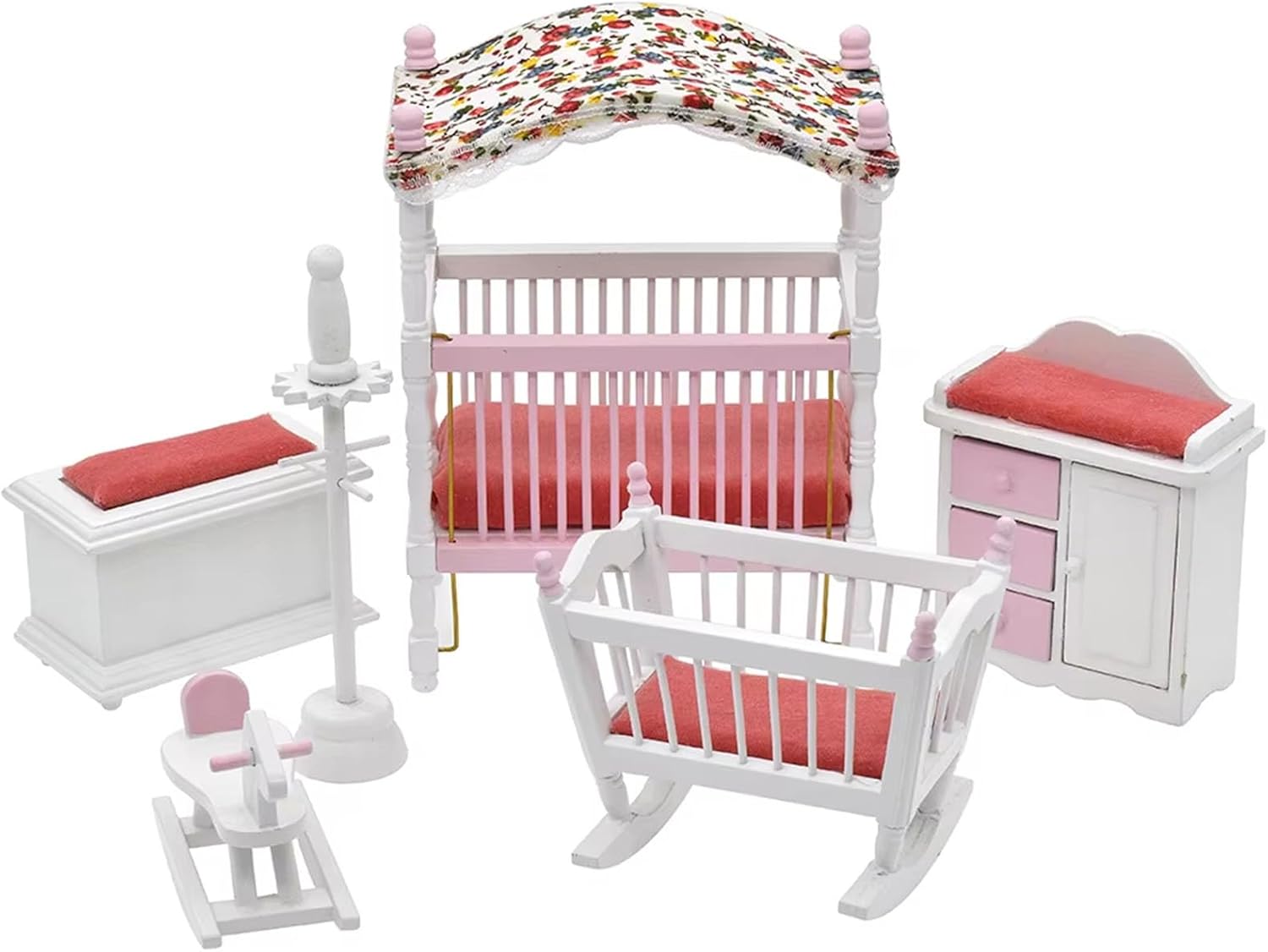 Il nostro set di culla per case delle bambole è adatto per case delle bambole 1:12 L'eccellente modello di aspetto è molto vicino alla realtà. Ottimi oggetti di scena fotografici Gli accessori per case delle bambole in miniatura dall'aspetto realistico, aggiungono facilmente più fascino e divertimento alle tue case delle bambole Un set di modellini giocattolo, non mobili veri Include un letto singolo, un cavallo in legno, un cassetto portaoggetti, una scatola per giocattoli, un appendiabiti e una culla