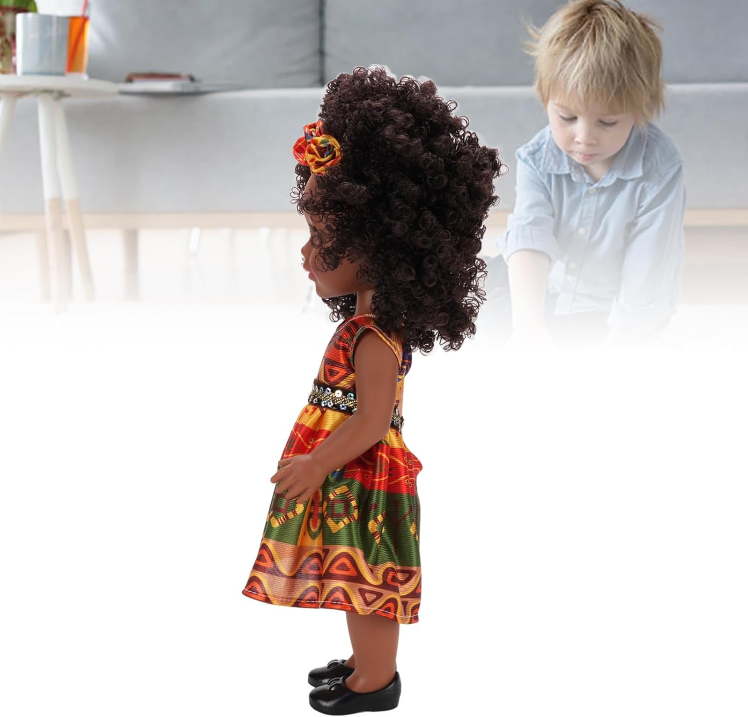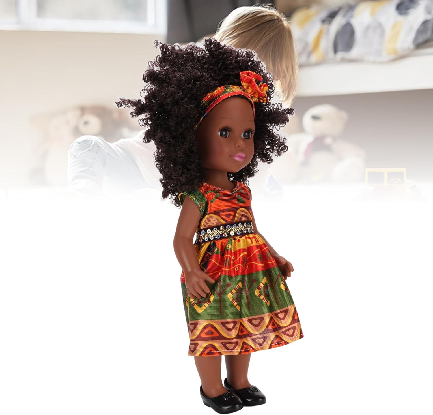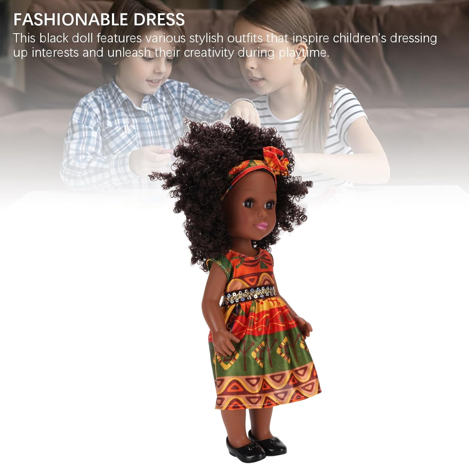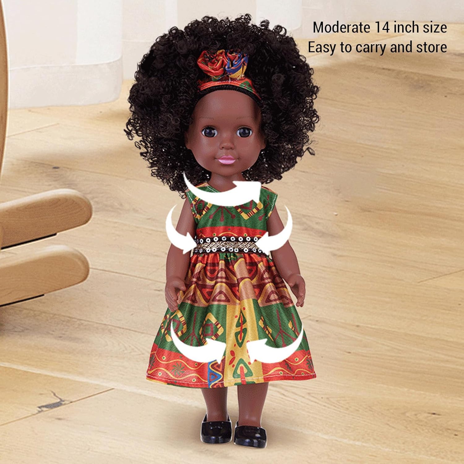 Abito alla moda: questa bambola nera dispone di vari abiti eleganti che ispirano gli interessi di vestirsi dei bambini e scatenano la loro creatività durante il gioco. Afro Design: la distintiva acconciatura afro mette in mostra la rappresentazione multiculturale, migliorando il fascino unico della bambola e consentendo ai bambini di celebrare la diversità. Materiale sicuro: realizzato in plastica morbida e robusta, questa bambola è adatta a piccole mani, offrendo un'esperienza di gioco che è divertente per i bambini. Conveniente dimensione di 14 pollici: la dimensione di 14 pollici è giusta per un facile trasporto e spazio, rendendo questa bambola un compagno ideale per le avventure domestiche e di viaggio. Companion meraviglioso: questa bambola può fungere da giocattolo confortante, aiutando ad alleviare le emozioni dei bambini e offrendo loro un amico e un compagno di giochi durante i loro anni formativi.