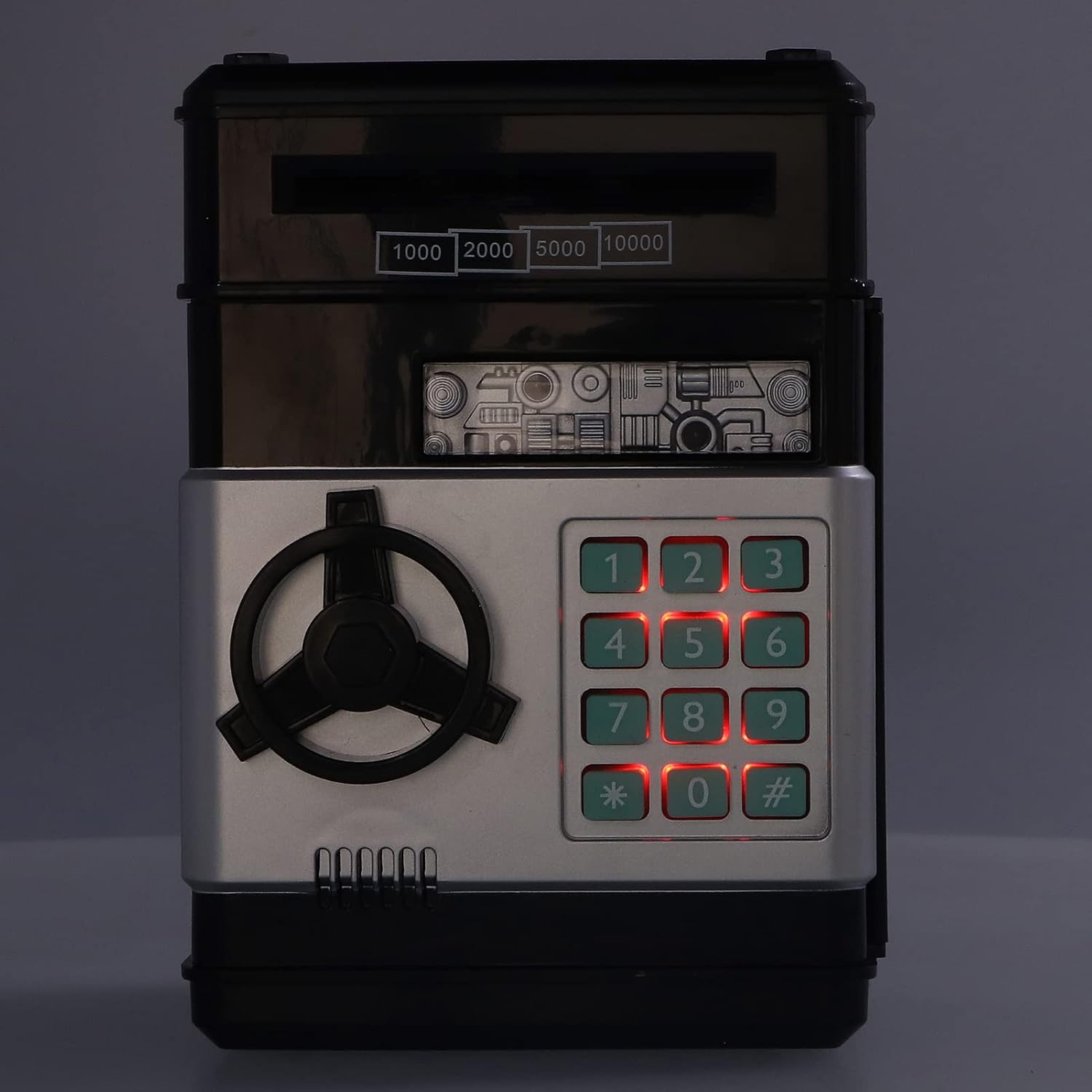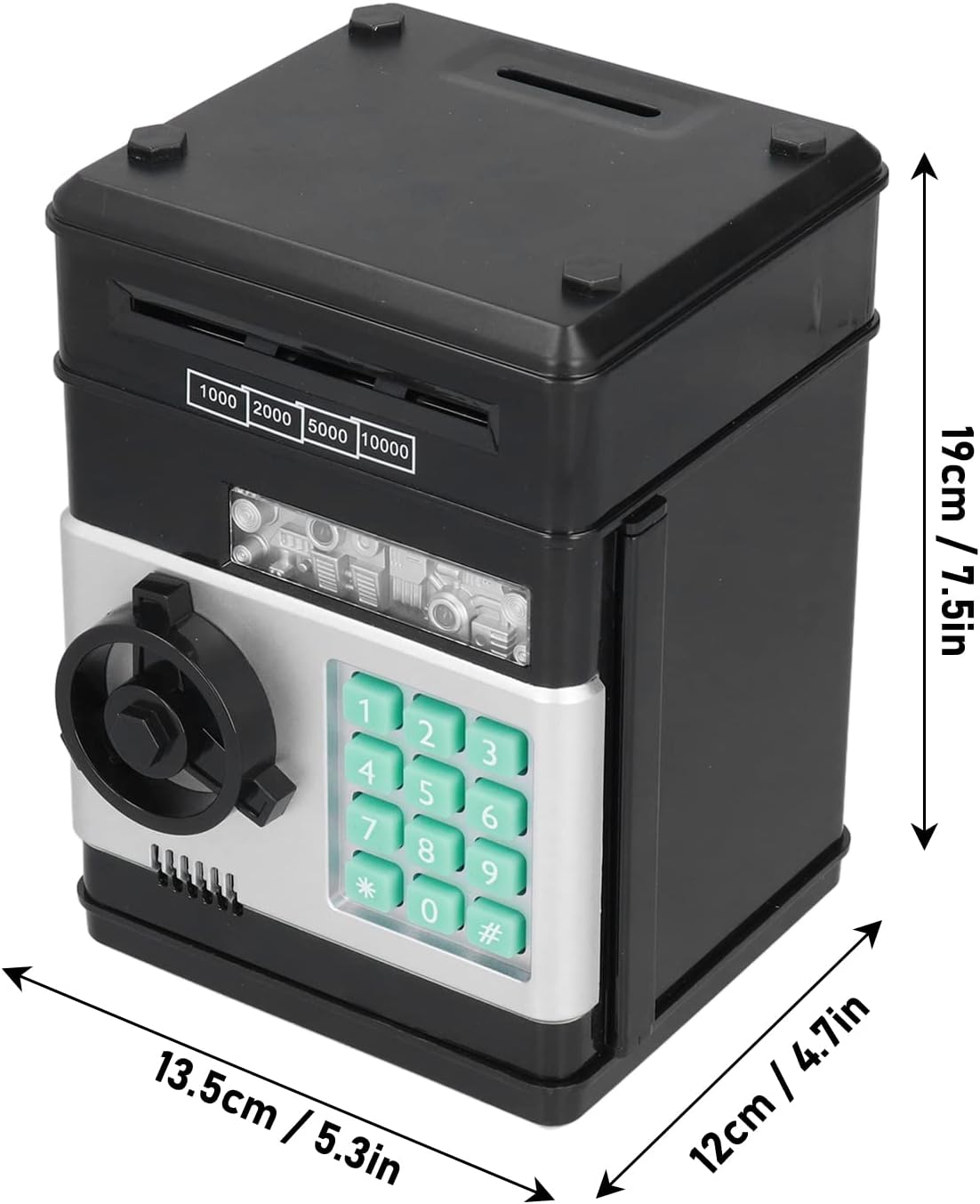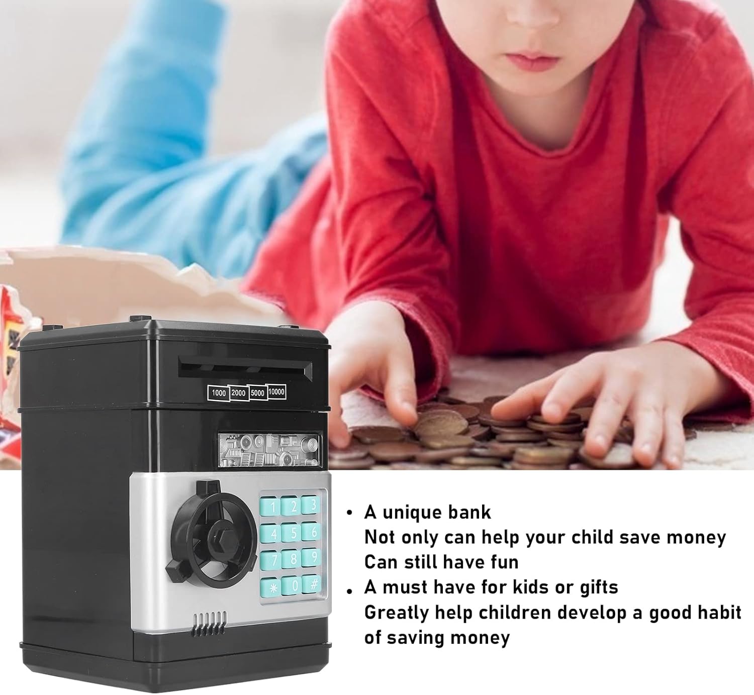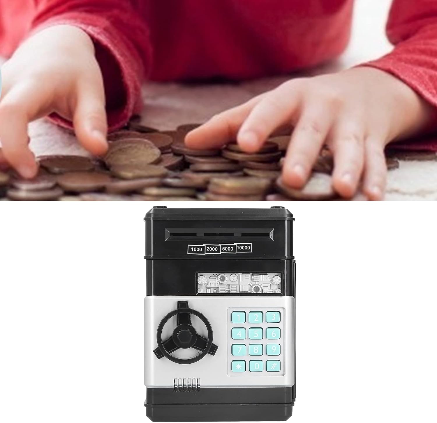 ABS ecologico: cassetto elettronico di cassa in plastica per ABS ecologicamente ecologicamente ecologici, inodore, indice di invecchiamento, durevole e può essere utilizzato da adulti e bambini. Slot di denaro: c'è anche slot di denaro nella parte superiore della cassa elettronica, dove è possibile collocare vari soldi. Bill Roll automatico: metti la fattura nello slot del bill roll, la cassa elettronica avvolgerà automaticamente la fattura nella scatola di carta. Funzione 2 in 1: casella di risparmio di denaro e password sicure, una banca unica, non può aiutare tuo figlio a risparmiare denaro, ma anche divertirsi. Essenziale: essenziale per i bambini o i regali, la cassa elettronica aiuta notevolmente tuo figlio a sviluppare una buona abitudine di risparmiare denaro.