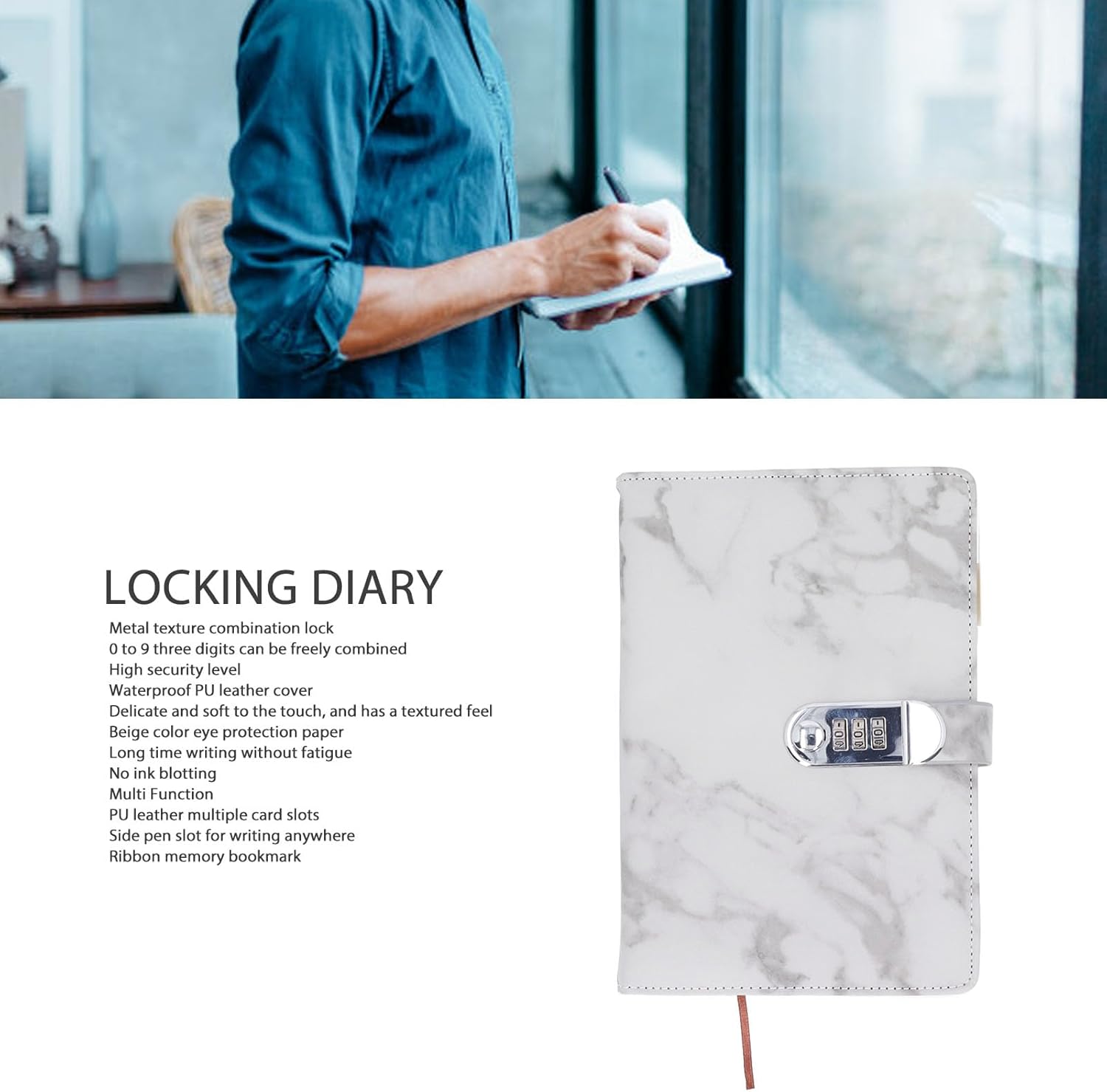 Con blocco password: notebook con blocco password con struttura in metallo, da 0 a 9 tre cifre possono essere combinate liberamente, alto livello di sicurezza. Copertina: la copertina del taccuino con lucchetto è realizzata in pelle PU, delicata e morbida al tatto e con una sensazione ruvida. Carta premium: questo taccuino adotta carta beige per la cura degli occhi, scrive a lungo senza fatica, cura per gli occhi, senza inchiostro assorbente. Multifunzionale: il notebook è dotato di slot multischeda in pelle PU. Posizione di inserimento della penna laterale per registrare sempre e ovunque. Con segnalibro di memoria a nastro. Multiapplicazione: questo taccuino con lucchetto a combinazione è ampiamente utilizzato e può essere utilizzato per l'inserimento nel diario, appunti di lavoro, pianificazione e bozze.
