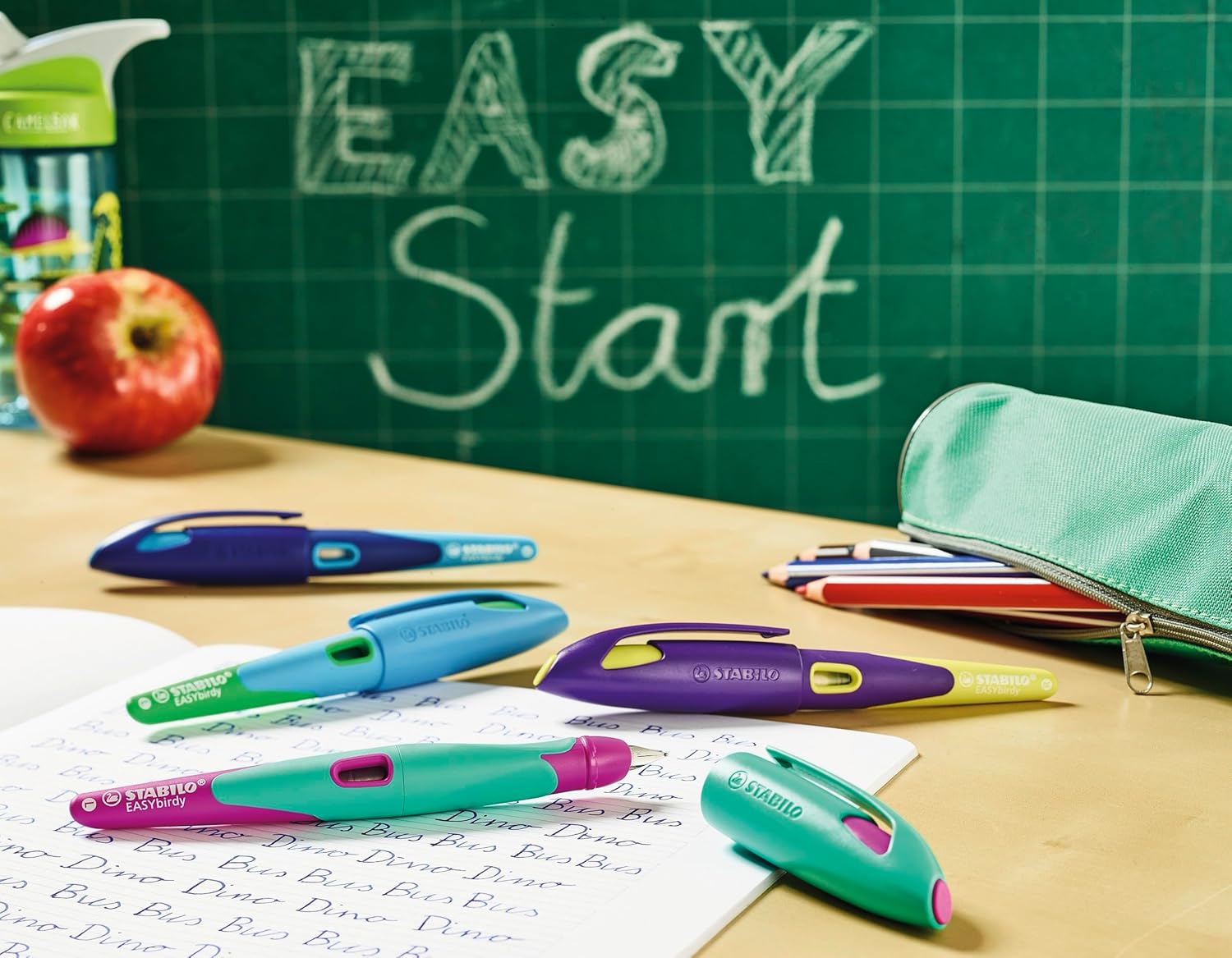 Manico per penna stilografica ergonomica per la scuola STABILO EASYbirdy Zona di presa ergonomica e antiscivolo, in versioni speciali per mancini e destrimani Angolo della punta regolabile individualmente per una scrittura morbida e un carattere pulito Pennino con grana di iridio per una facile guida nella scrittura e un carattere pulito - non macchia, non si graffia Disponibile in diverse combinazioni di colori