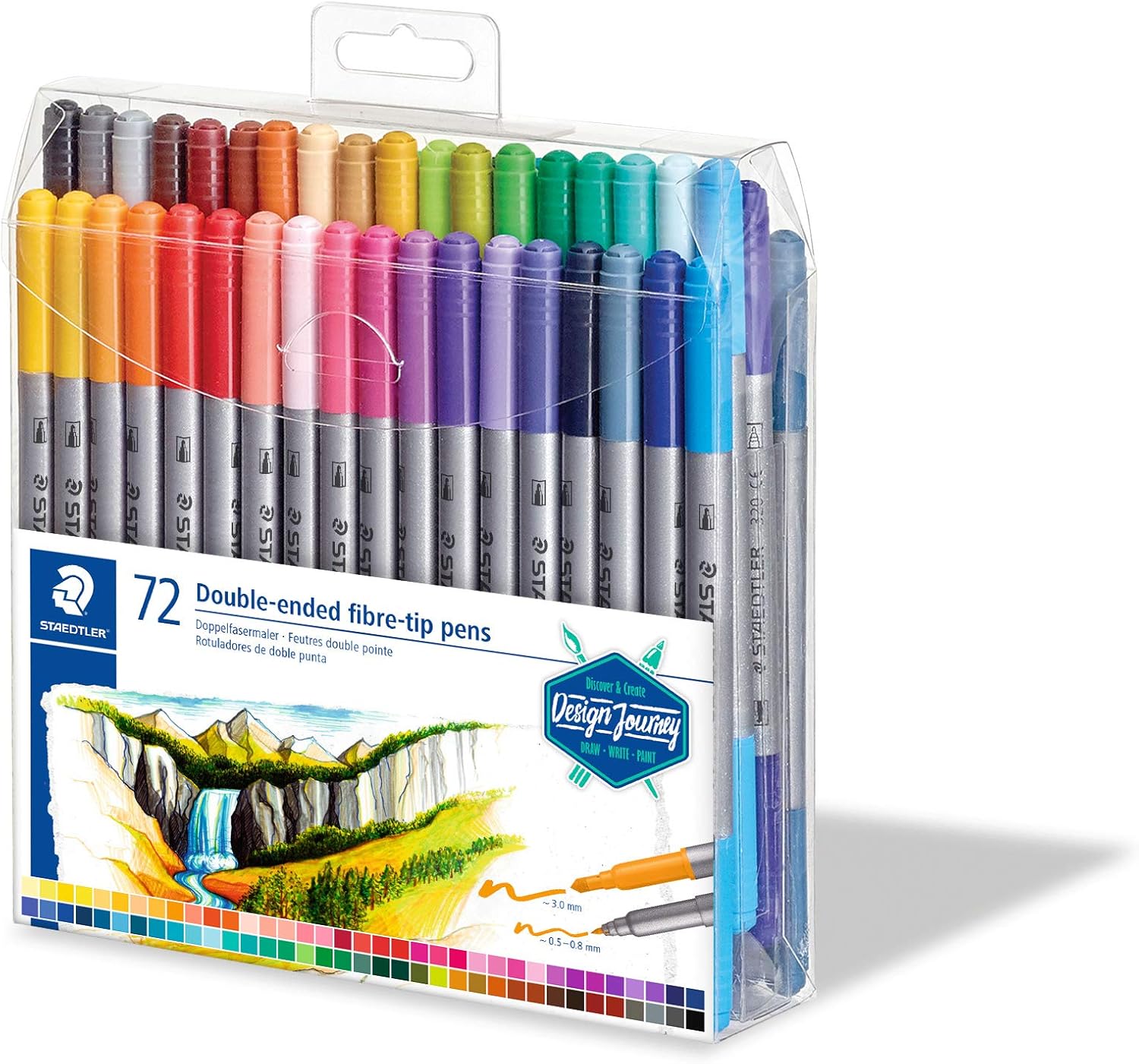 SET DI PENNARELLI A DOPPIA PUNTA: Set di 72 pennarelli a doppia punta sintetica in colori assortiti, ideali per schizzi, disegni, scrittura e colorazione con un'ampia varietà di tecniche artistiche DUE FUNZIONI IN UNA SOLA PENNA: Ogni pennarello è dotato di due punte, una fine da 3 mm per tratti precisi e riempimenti e una ultra sottile per tratti da 0,5-0,8 mm ideale per dettagli minuziosi, offrendo massima flessibilità nell'uso COLORI BRILLANTI E DURATURI: Con 72 colori vivaci, questi pennarelli a base d'acqua garantiscono una resa cromatica intensa e uniforme, perfetta per creare schizzi e disegni colorati e accattivanti PUNTA RESISTENTE ALLA PRESSIONE: Le punte dei pennarelli sono progettate per essere stabili e resistenti alla pressione, permettendo un utilizzo confortevole e sicuro, senza rischio di deformazione delle punte durante l'uso ASTUCCIO TRASPARENTE E PRATICO: Il set di 72 pennarelli è confezionato in un astuccio trasparente, che non solo protegge i pennarelli, ma consente anche di visualizzare facilmente tutti i colori, rendendo l'organizzazione e la selezione dei colori rapida e semplice
