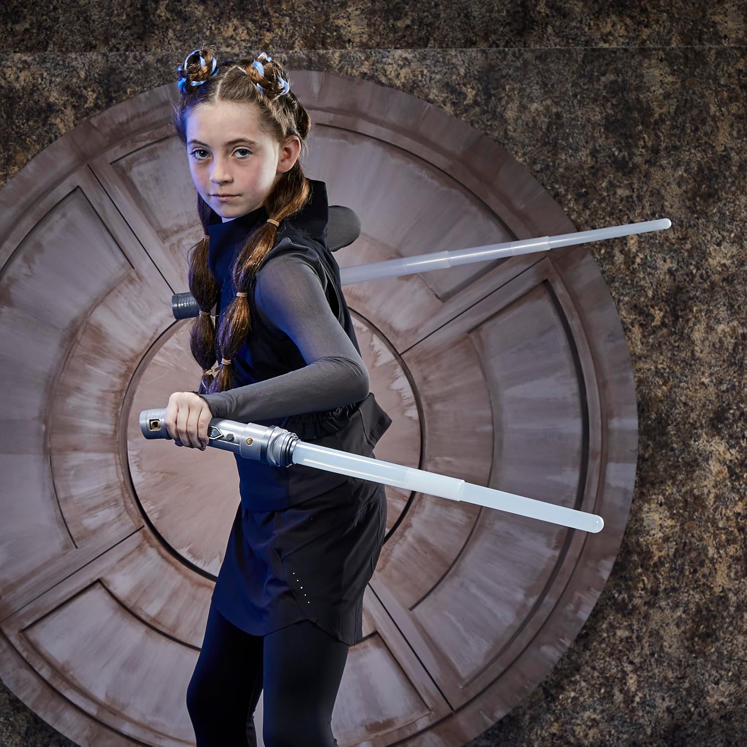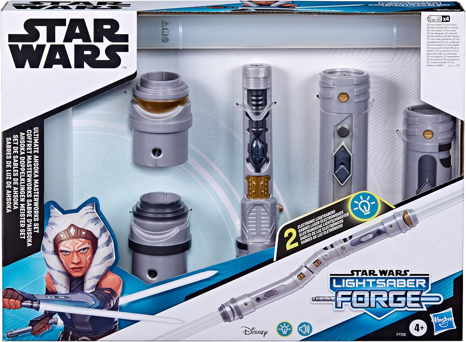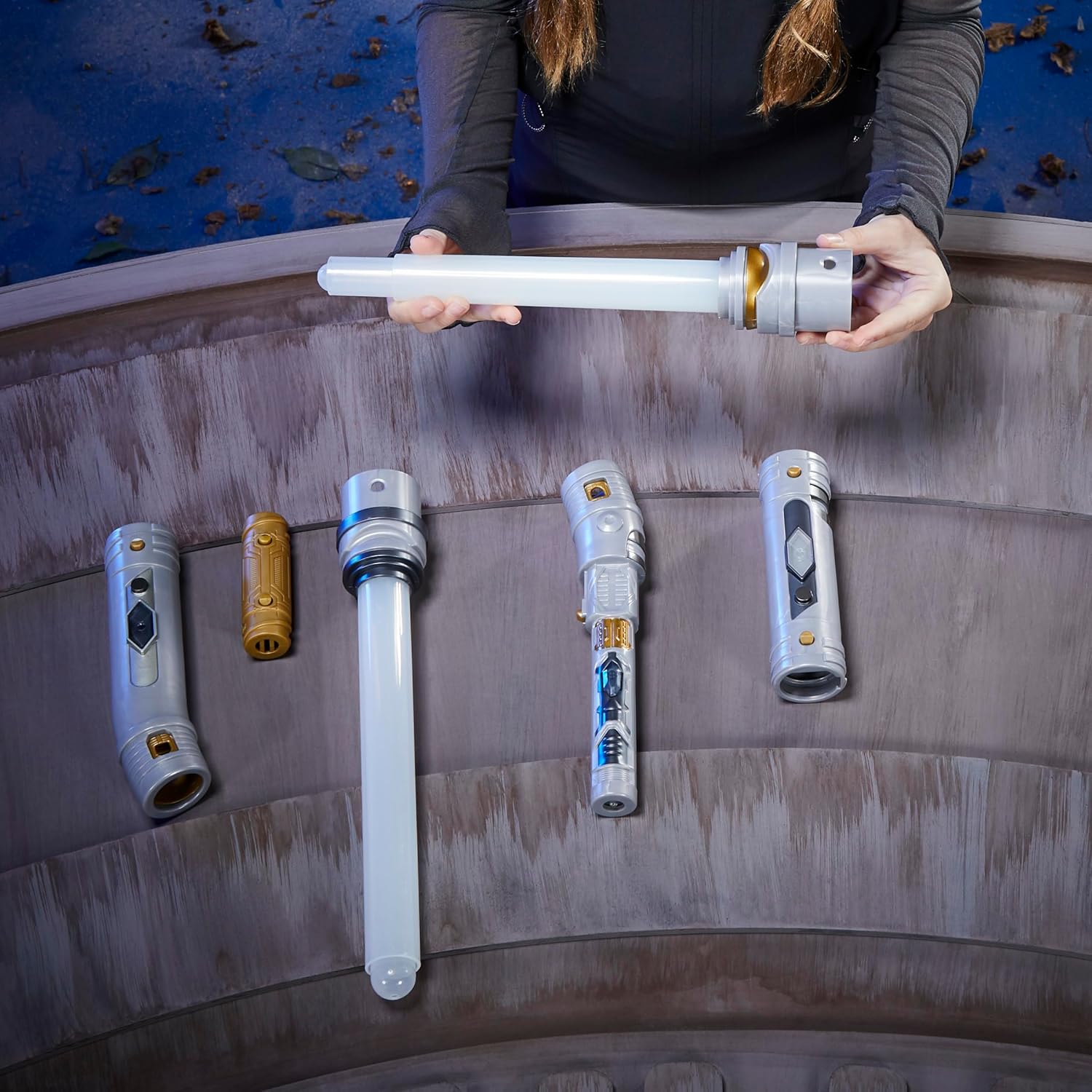 2 spade laser in 1: il set Masterworks Ahsoka Star Wars Lightsaber Forge include 2 spade laser elettroniche che possono essere utilizzate separatamente o combinate per creare un'epica spada laser a doppia lama Crea la tua versione: questa spada laser contiene 8 pezzi, incluse 2 lame estendibili bianche, così i bambini possono assemblare la propria spada laser per divertirsi a combattere Effetti luminosi e sonori: puoi premere i pulsanti su ciascuna delle spade laser per creare spade laser ispirate alla galassia Attiva effetti sonori ed effetti luminosi. SCIABELLA LASER PERSONALIZZABILE di Star Wars: utilizza il connettore per collegare un'altra spada laser Lightsaber Forge e creare ancora più spade laser a doppia lama (vendute separatamente fino a esaurimento scorte). Migliaia di combinazioni: migliaia di incredibili combinazioni possono essere create con Lightsaber Forge. (Il numero totale di combinazioni include tutti i prodotti Lightsaber Forge. Venduto separatamente. Fino a esaurimento scorte.)
