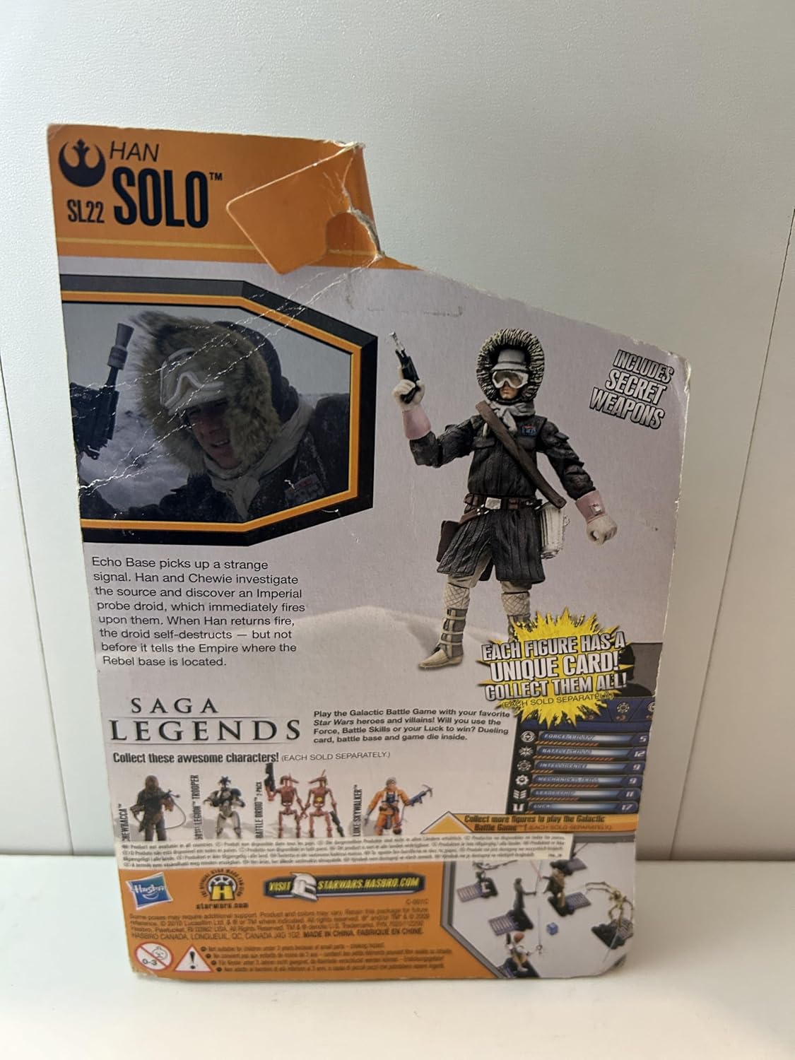 Echo Base cattura uno strano segnale. Han e Chewie esplora la fonte e scopre un droide della sonda imperiale, che spara immediatamente su di esso. Quando Han torna al fuoco, il droide si distrugge – ma non prima che indichi all'Impero dove si trova la base ribelle. Una battaglia "intergalattica" fa battere – e tu e la tua action figure Han Solo stanno per entrare nello sfilacciamento. Armate il vostro guerriero con i suoi accessori armi segrete in modo che sia pronto a combattere contro i suoi nemici più violenti. Sia che tu stia lottando per il destino dell'universo o che tu sia attento nella tua collezione, questa splendida statuetta mette tutta l'emozione della saga di Star Wars nel palmo della tua mano. La statuetta viene fornita con una carta da gioco galattica, una base da combattimento e un dado da gioco.