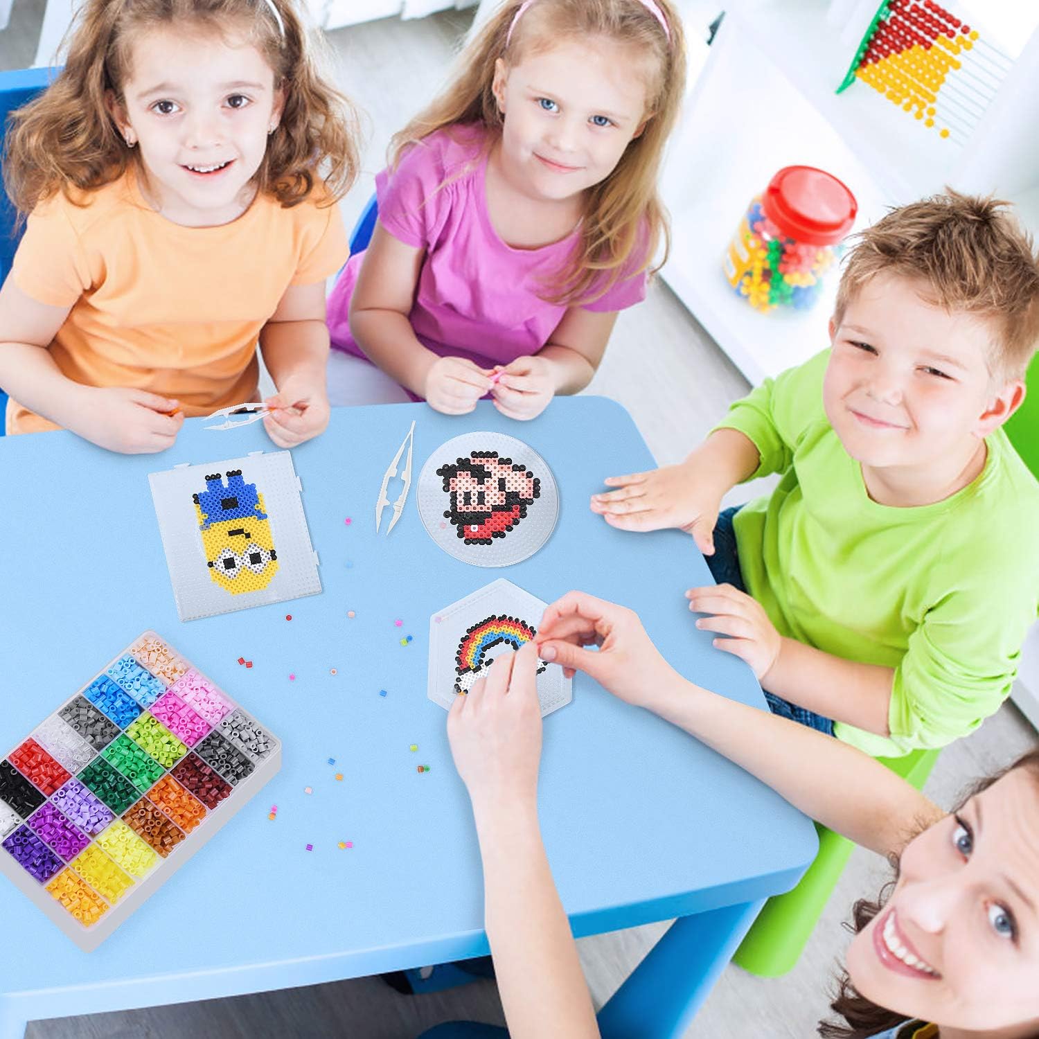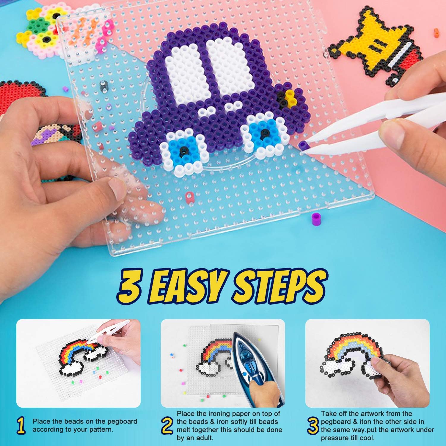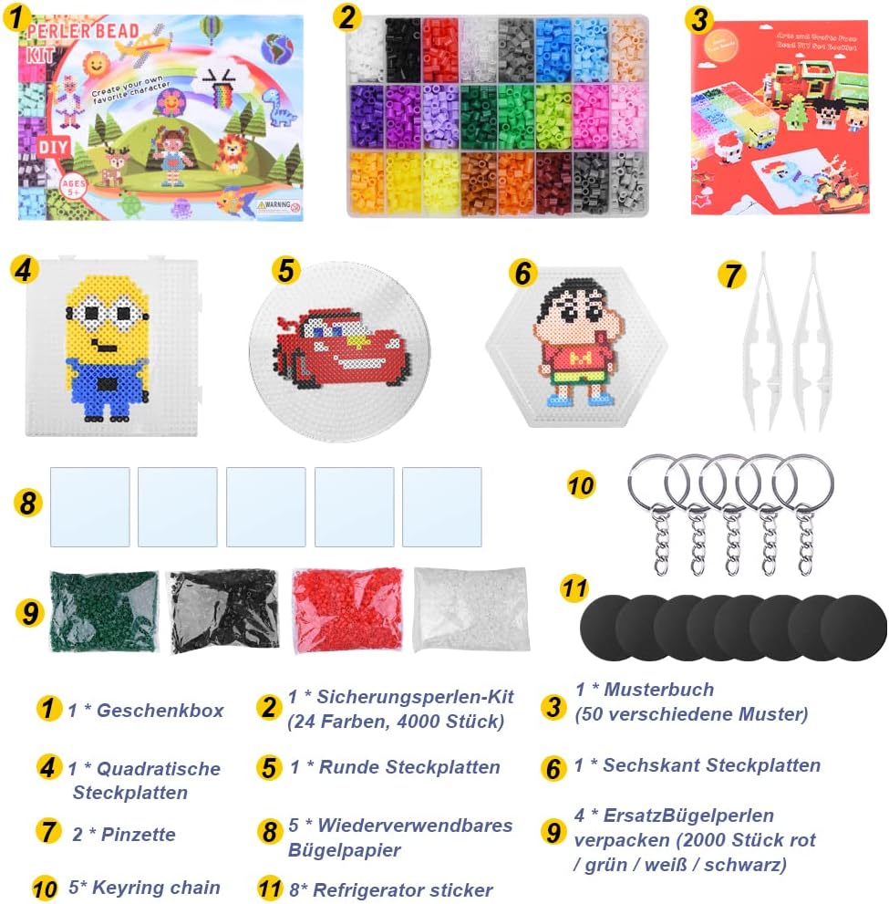 Perline a Fusione Set: 12000 perline da stirare 5mm 24 colori libro di 50 modelli, carta da stiro riutilizzabile, pinzette, 3 pegboard per perline da stirare, strumenti e accessori, contiene tutto il necessario per realizzare le proprie perline da stiro Giocattoli puzzle: l'attività manuale conset di perline stirare fai da te può migliorare le abilità pratiche dei bambini,sviluppare la coordinazione occhio mano e la capacità di riconoscimento dei colori, perline pixel art per Creazioni, stimolare la creatività e l'immaginazione dei bambini Perline a Fusione kit: posizionare le perline da stiro in un vassoio,coprire le perline con la carta da stiro e stirare delicatamente finché le perline non si sciolgono,quindi stirare l'altro lato,lasciare raffreddare e terminare il lavoro Perline per Bigiotteria Fai Da Te: Perline da stirare sono atossiche e adatte ai bambini,sicure e salutari,NOTA: non adatto a bambini di età inferiore ai 6 anni,deve essere utilizzato sotto la supervisione di un adulto,piccole parti: rischio di soffocamento Perline da Stirare Kit Completo: Tutto l'occorrente è fornito in una pratica scatola, facile da riporre e trasportare. Questo gioco creativo è pensato per sviluppare la concentrazione e la motricità fine di ragazzi e ragazze in età scolare, rendendolo una scelta popolare per compleanni, Natale e le vacanze.