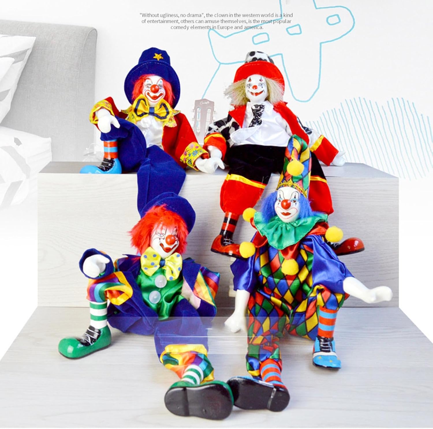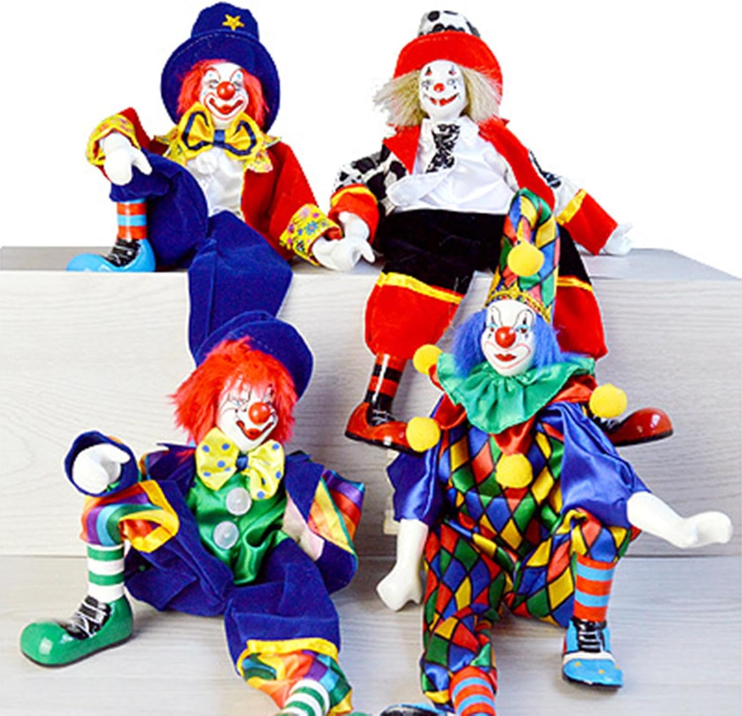 Aspetto: le action figure adottano un design dall'aspetto pagliaccio, pregevole fattura, dettagli squisiti, volti dipinti a mano e costume dai colori vivaci, carino e divertente. Ampio utilizzo: le statuette di clown possono essere utilizzate come decorazione, creando un'atmosfera retrò ed elegante, perfette per soggiorno, camera da letto, libreria, comodino, tavolo, bar, ristorante, ecc. Caratteristiche: la bambola di porcellana è mobile, è possibile cambiare la posa a piacimento e mettere la forma che ti piace. Regalo innovativo: gli ornamenti in miniatura sono un bel regalo per famiglie, bambini e amici per compleanni, festival, feste, inaugurazione della casa o qualsiasi altra occasione. Materiale: bambole realizzate in ceramica (testa, mani, piedi) e tessuto, ecologico, robusto e durevole.