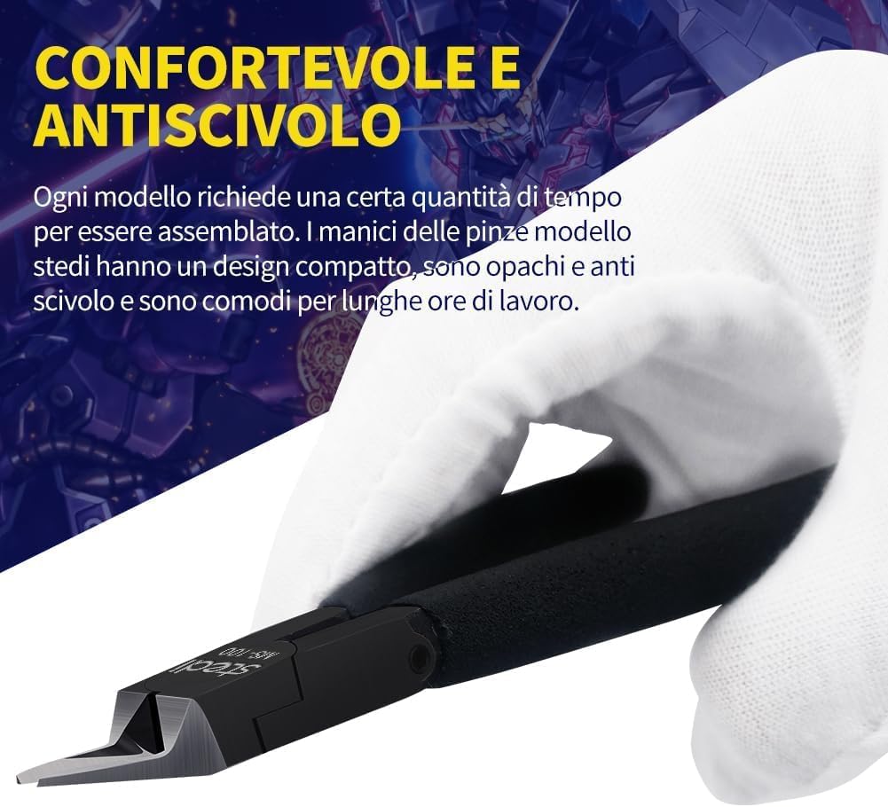【Lama sottile a doppio taglio】Il vantaggio della lama sottile è che può essere vicina al pezzo. Le lame affilate e appuntite facilitano la rimozione delle parti in plastica più piccole del kit di modellismo. 【Acciaio di alta qualità】Il tronchese utilizza acciaio in lega ad alto tenore di carbonio di alta qualità, il trattamento termico complessivo migliora la durezza e conferisce una straordinaria sensazione di taglio. 【Comodo e antiscivolo】 I manici delle pinze modello Stedi hanno un design compatto, una struttura opaca e antiscivolo, e sono comodi per lunghe ore di lavoro. 【Facile da usare】 La resistenza della molla è moderata, il che rende l'operazione di cesoiatura più facile e meno faticosa. Allo stesso tempo, il fermo di fine corsa può evitare efficacemente una forza eccessiva e danni alle ganasce. 【Supporto clienti】Stedi model tool è uno strumento eccellente per gli hobbisti che si concentrano sulla costruzione di kit di modellismo. Apprezziamo ogni singolo feedback dei clienti. Se avete qualche domanda sul nostro Modle nipper, vi preghiamo di contattarci.