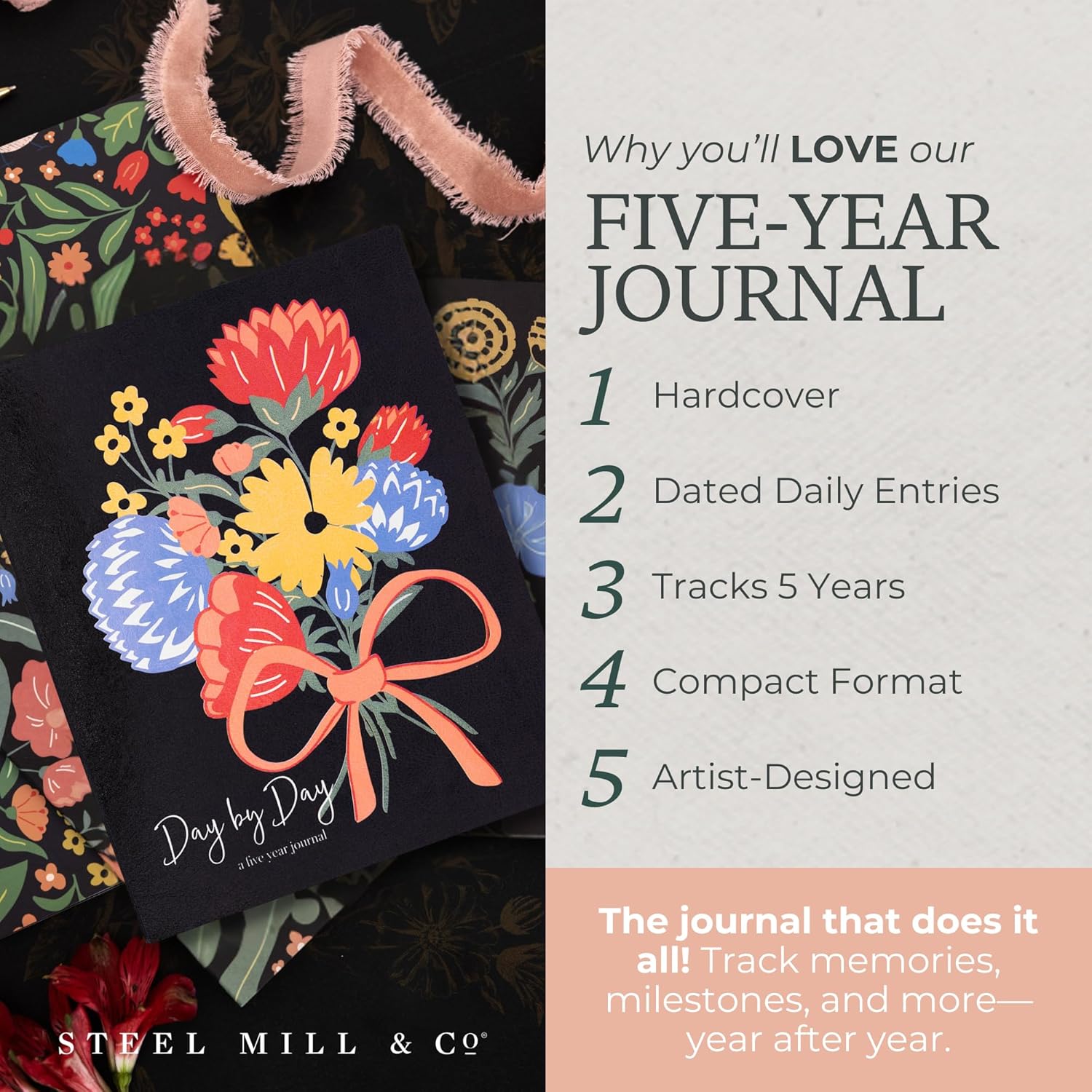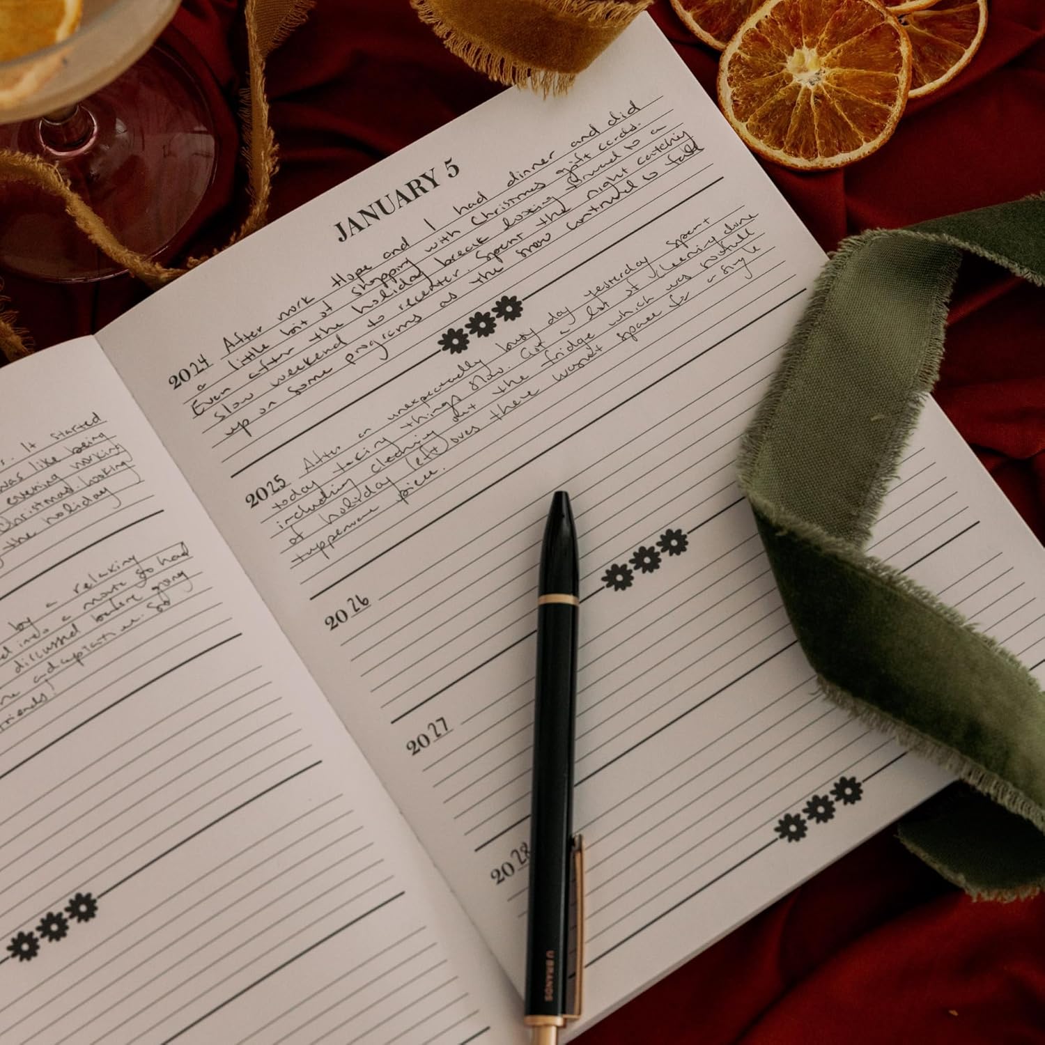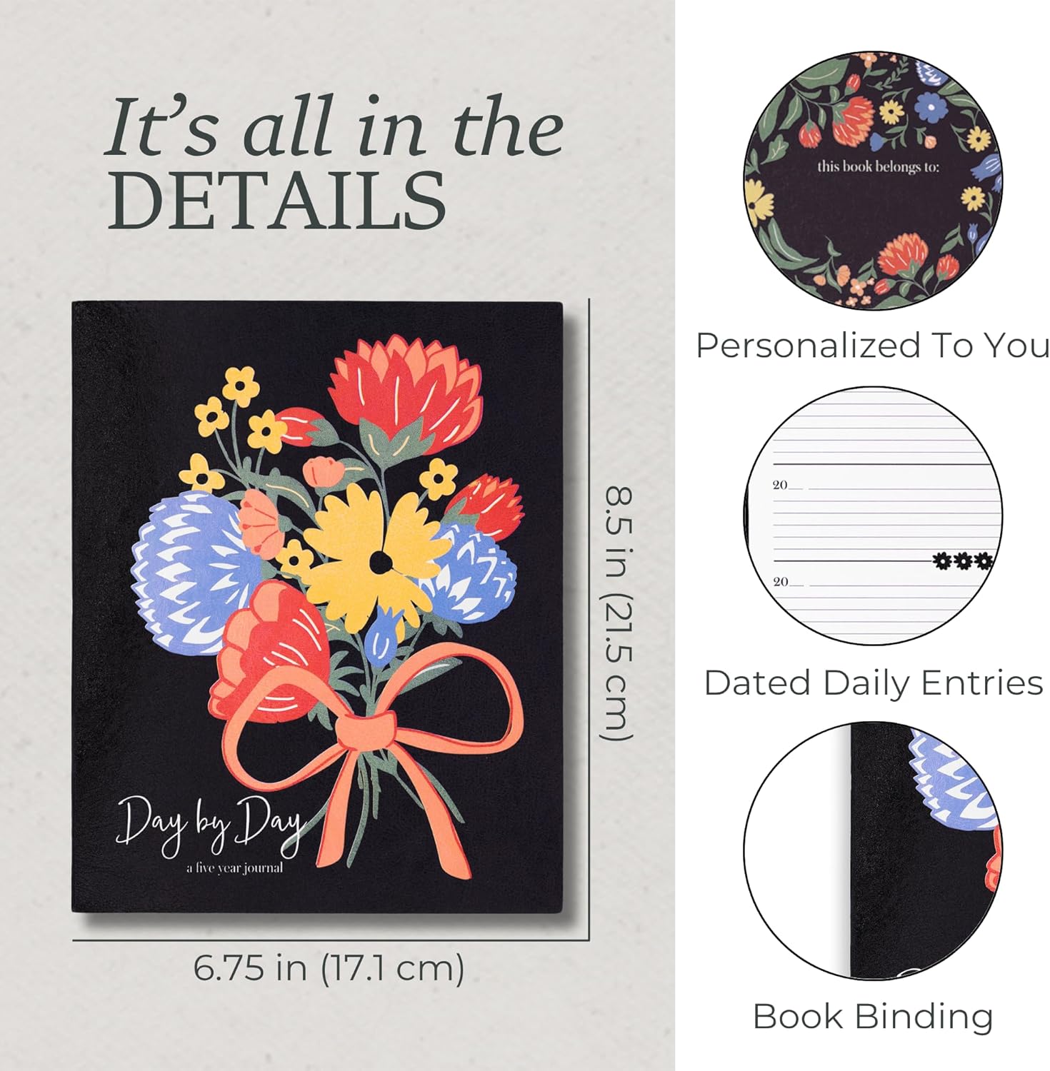 Aggiornamento senza tempo: una versione aggiornata del nostro amato mini diario vecchio di cinque anni, questa edizione più grande conserva caratteristiche preziose fornendo allo stesso tempo un'esperienza di diario più ampia e raffinata. Il diario misura circa 21,59 x 19,05 x 3,43 cm Design elegante: Decorato con un delicato design di bouquet Wanderlust e una spirale dorata, questo diario combina bellezza senza tempo con funzionalità pratica, rendendolo un piacere da usare ed esporre Costruzione durevole: La rilegatura a spirale dorata nascosta garantisce una copertina elegante che è allo stesso tempo resistente e flessibile, progettata per resistere all'uso quotidiano pur mantenendo il suo fascino estetico. Inoltre, la spirale consente a questo diario di appiattirsi consentendo un'esperienza di scrittura facile. Layout accurato: ogni pagina datata è meticolosamente organizzata per catturare senza sforzo cinque anni di momenti, pensieri e traguardi quotidiani, fornendo ampio spazio per voci dettagliate. Ogni data ha cinque sezioni a righe, una per ogni anno. Uso versatile: perfetto per riflessioni personali, scrittura creativa o come ricordo prezioso, questo diario è costruito per durare, permettendoti di rivisitare e celebrare i tuoi ricordi e la tua crescita nel corso degli anni.