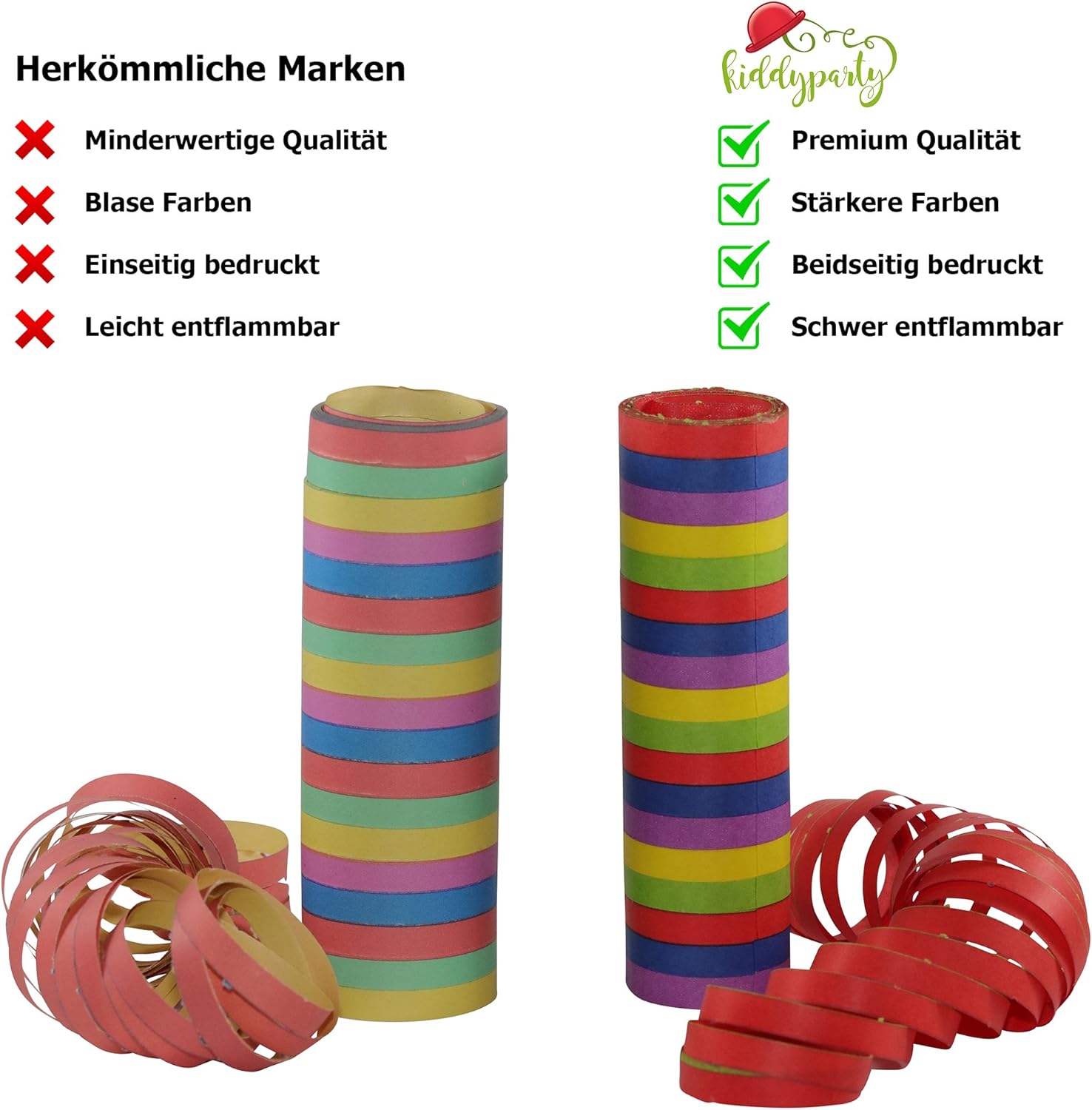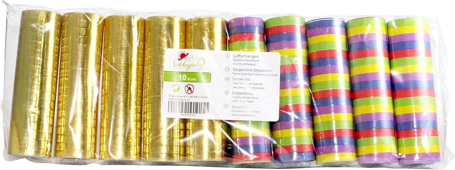 INFIAMMABILE: le stelle filanti di carta colorate sono ignifughe. Ma non strisce di carta metallizzata dorata. AMBITO DI CONSEGNA: Confezione da 10 set di stelle filanti composto da: 5 rotoli di strisce di carta metallizzata dorata e 5 stelle filanti colorate, le stelle filanti colorate sono stampate su entrambi i lati in verde, giallo, blu e viola SUPER SEMPLICE: Le stelle filanti di carta consentono una decorazione facile e veloce e, con i loro motivi colorati, sono un vero arricchimento per ogni celebrazione. VERSATILE: Ideale per alberghi, ristorazione, scuole, asili e strutture pubbliche. Gli streamer possono essere utilizzati per ogni occasione, che si tratti di feste di compleanno, feste per bambini, matrimoni o feste/celebrazioni come carnevale, giorno del Ringraziamento, Pasqua, carnevale, Capodanno, Natale, Halloween, Oktoberfest, discoteca ecc. COLORI BRILLANTI E STAMPATI SU ENTRAMBI I LATI: Realizzato con carta di alta qualità, il che significa che i colori brillano più forti e luminosi. Stampato su entrambi i lati! OPZIONI DI DECORAZIONE: Ideale per tutti i tipi di decorazioni. Per decorazioni da tavola (spargere sul tavolo della festa) o come decorazioni murali (decorare pareti). Gli streamer possono anche essere semplicemente appesi alla pedana e decorati con ghirlande o palloncini. La tua creatività non ha limiti!