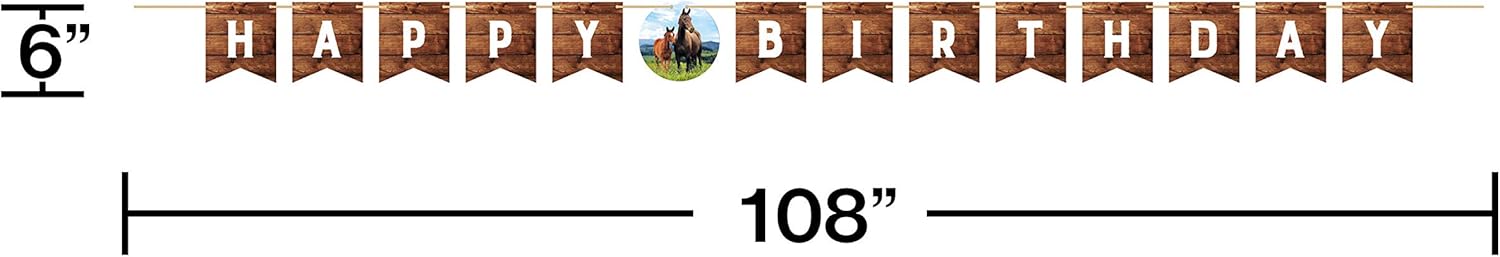 Il pacchetto include 1 striscione per festa di compleanno. Questo striscione presenta una riga di script "Buon compleanno" con l'immagine di un cavallo e di un pony tra ogni parola. Questo banner completa la decorazione del luogo della tua festa. Questo banner è realizzato in materiale di alta qualità. Questo banner misura 6" x 108" quando eretto.