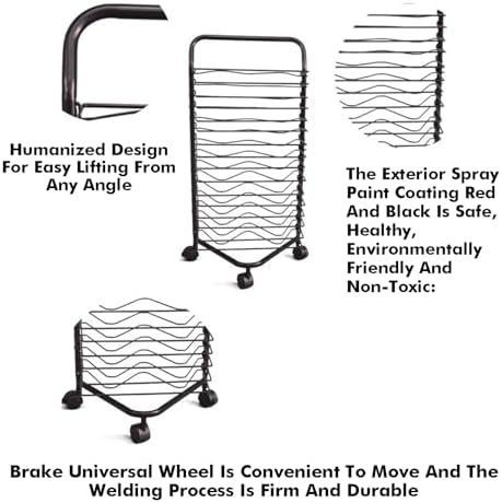 Struttura in acciaio resistente: lo scolapiatti Art è realizzato in acciaio di alta qualità, offre 16 strati di stoccaggio con 3 cm di distanza tra ogni strato, accogliendo una varietà di opere d'arte garantendo una lunga durata per l'uso quotidiano. Ripiani girevoli facili da usare: i ripiani rimovibili possono essere sollevati fino a 90°, consentendo un facile accesso e stoccaggio. Il montaggio è semplice senza bisogno di attrezzi, basta collegare i telai superiore e inferiore e inserirli nel rack. Compatibilità versatile delle dimensioni: con 16 stendibiancheria rimovibili, lo stendibiancheria è progettato per gestire tavole di tela che vanno da 2,4 m a 4,9 m. Il suo design compatto lo rende ideale per piccoli spazi a casa o in studio, asciugare e riporre in modo efficiente più pezzi d'arte. Ventilazione ottimizzata: caratterizzato da un design cavo multistrato, lo stendibiancheria per arte favorisce un flusso d'aria uniforme intorno alle opere, mentre la struttura a griglia aperta migliora la circolazione dell'aria e riduce al minimo l'accumulo di umidità. Uno spazio di ventilazione nella parte inferiore migliora l'efficienza di asciugatura, rendendolo adatto a varie forme d'arte tra cui pittura e ceramica. Ampia applicazione: questo cavalletto per asciugatura artistica con ruote offre un'eccellente soluzione di archiviazione per tutti i tipi di opere d'arte. Conserva in modo efficiente tele, pannelli, tavole da disegno, cornici per foto e altro ancora, massimizzando lo spazio fornendo un modo organizzato per visualizzare e gestire la tua collezione d'arte.