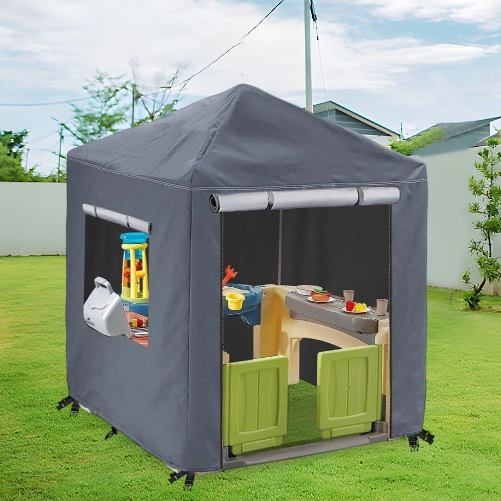 Protezione dalle intemperie: realizzata in tessuto Oxford 210D con rivestimento in PU impermeabile, protegge la casetta del bambino dalla pioggia e dalle intemperie, prolungandone la durata. Comodo accesso: dotata di due robuste cerniere impermeabili, questa copertura consente un facile ingresso e uscita promuovendo la luce e la ventilazione attraverso le finestre su tre lati. Vestibilità sicura: dotato di quattro bottoni a pressione e due corde elastiche sul fondo, mantiene la copertura saldamente in posizione durante le condizioni di vento, salvaguardando la casetta dei giochi. [Esperienza di gioco migliorata] Il design premuroso mantiene un ambiente ben ventilato e ben illuminato, creando un piacevole rifugio all'aperto per il gioco fantasioso dei bambini.