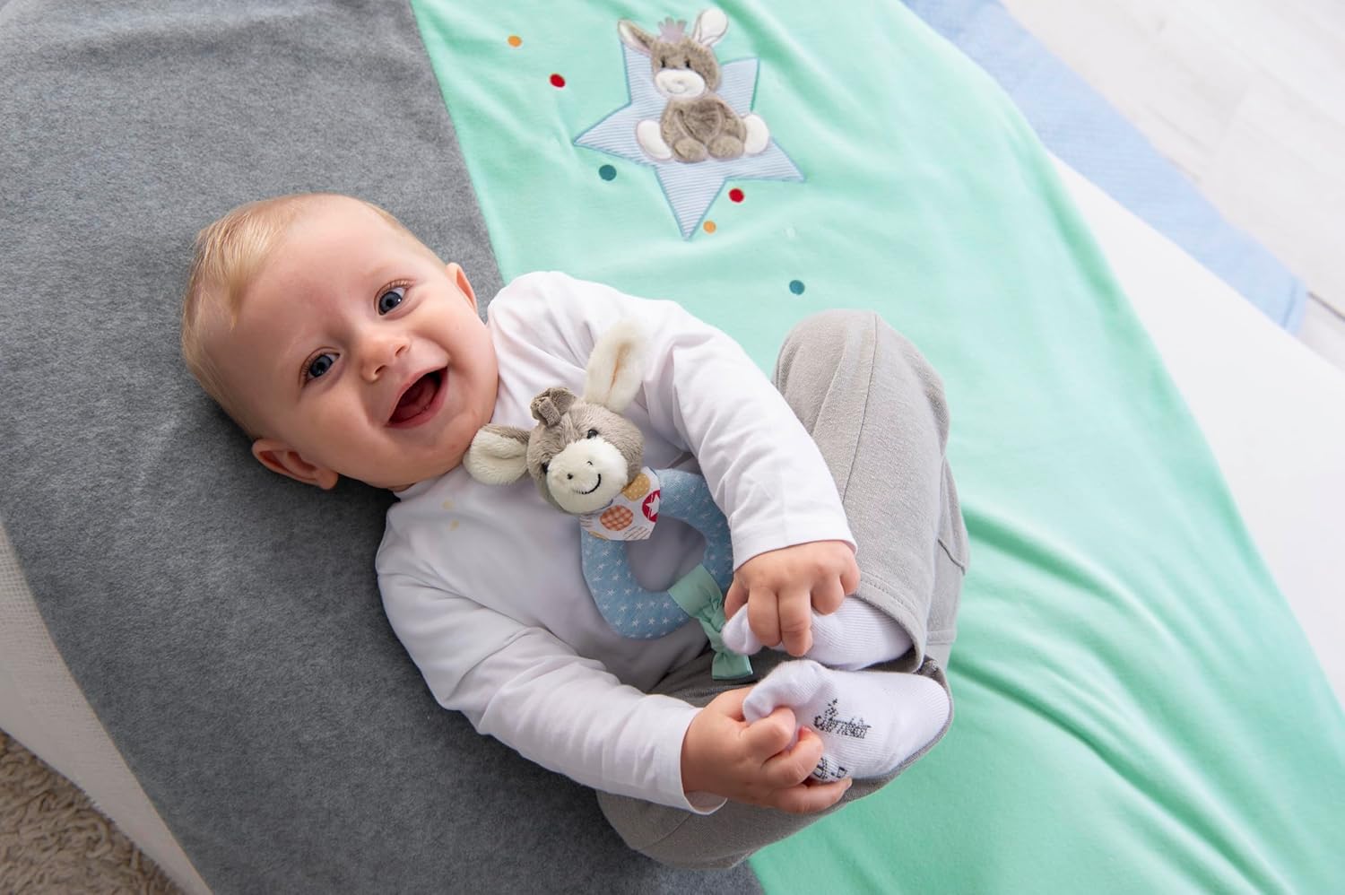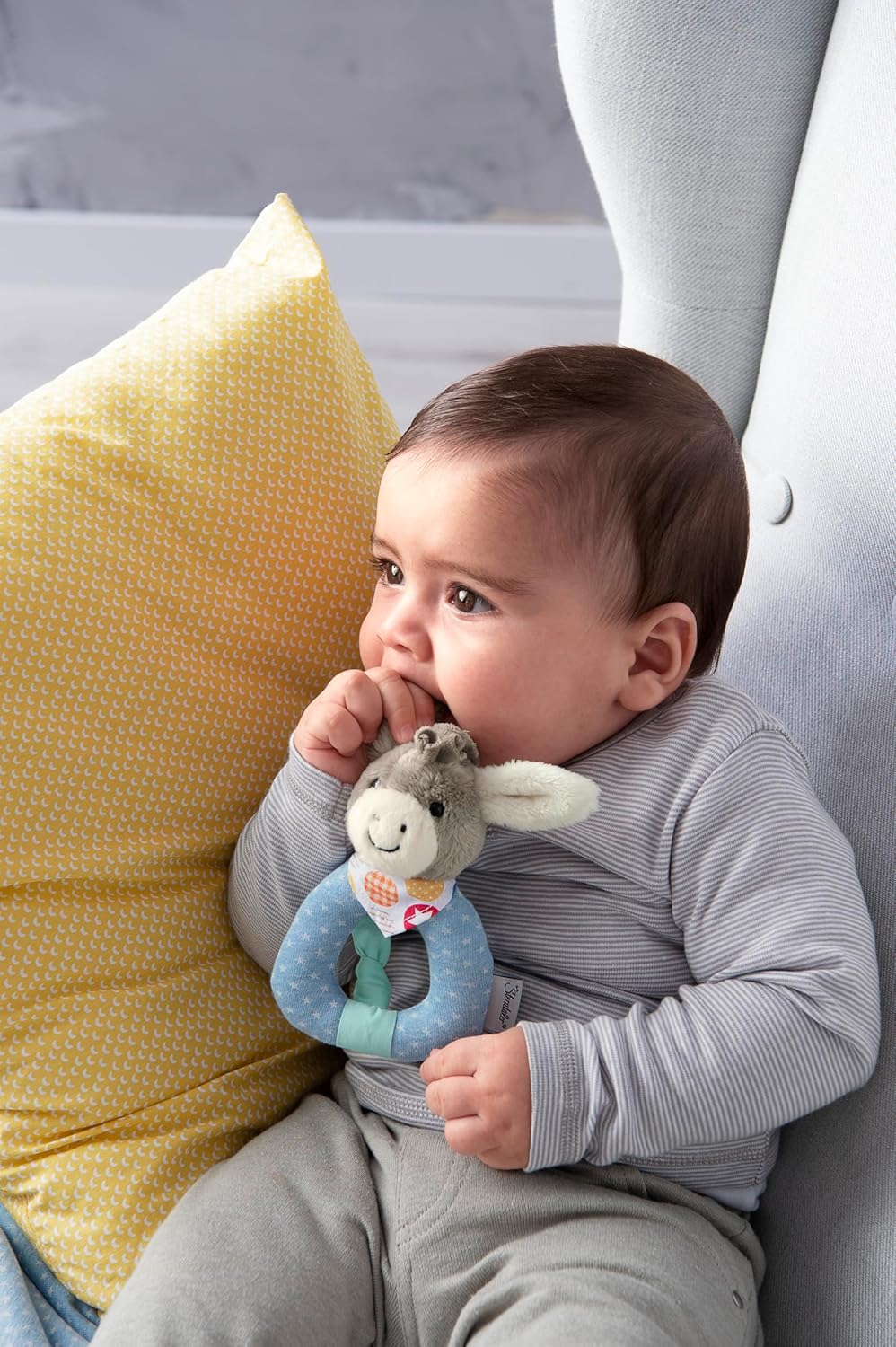 Simpatico asinello con sonaglio integrato per neonati, ideale da afferrare grazie all'apertura rotonda. Ideale a casa e in viaggio, compagno quotidiano per coccolare, giocare o coccolarsi. Ottime opzioni di presa: testa, coda annodata e sciarpa. Lavorazione di alta qualità: pile: 100% poliestere; Policotone: 60% cotone, 40% poliestere; Jersey: 100% cotone Fornitura: 1 giocattolo di presa Sterntaler asino Emmi, età: 0-36 mesi, 20 x 10 cm, azzurro/grigio