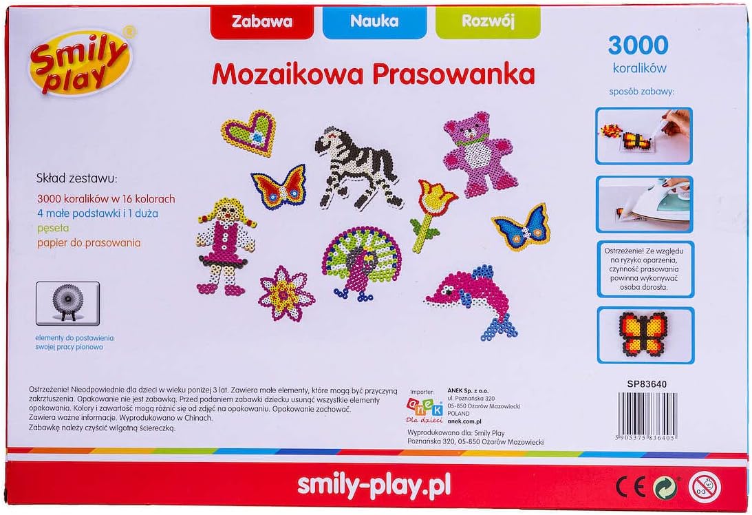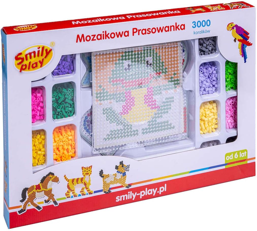 Macchina da stiro per mosaico 3000 perle Questo prodotto è stato sviluppato dalla marca SmilyPlay. L'asse da stiro a mosaico è un divertimento creativo senza fine! Il prodotto permette di creare tantissime immagini o figure che si trasformano da perline in immagini di plastica. Basta premere insieme le perline con l'aiuto di un adulto Il set contiene: 3000 perline in 16 colori diversi, 4 piccoli supporti, base grande, pinzette, carta da stiro Il prodotto è sicuro per i bambini che amano giocare in modo artistico e creativo. Codice produttore: SP83640; Dimensioni imballo: 40 x 27 x 4 cm; adatto a bambini dai 6 anni in su.