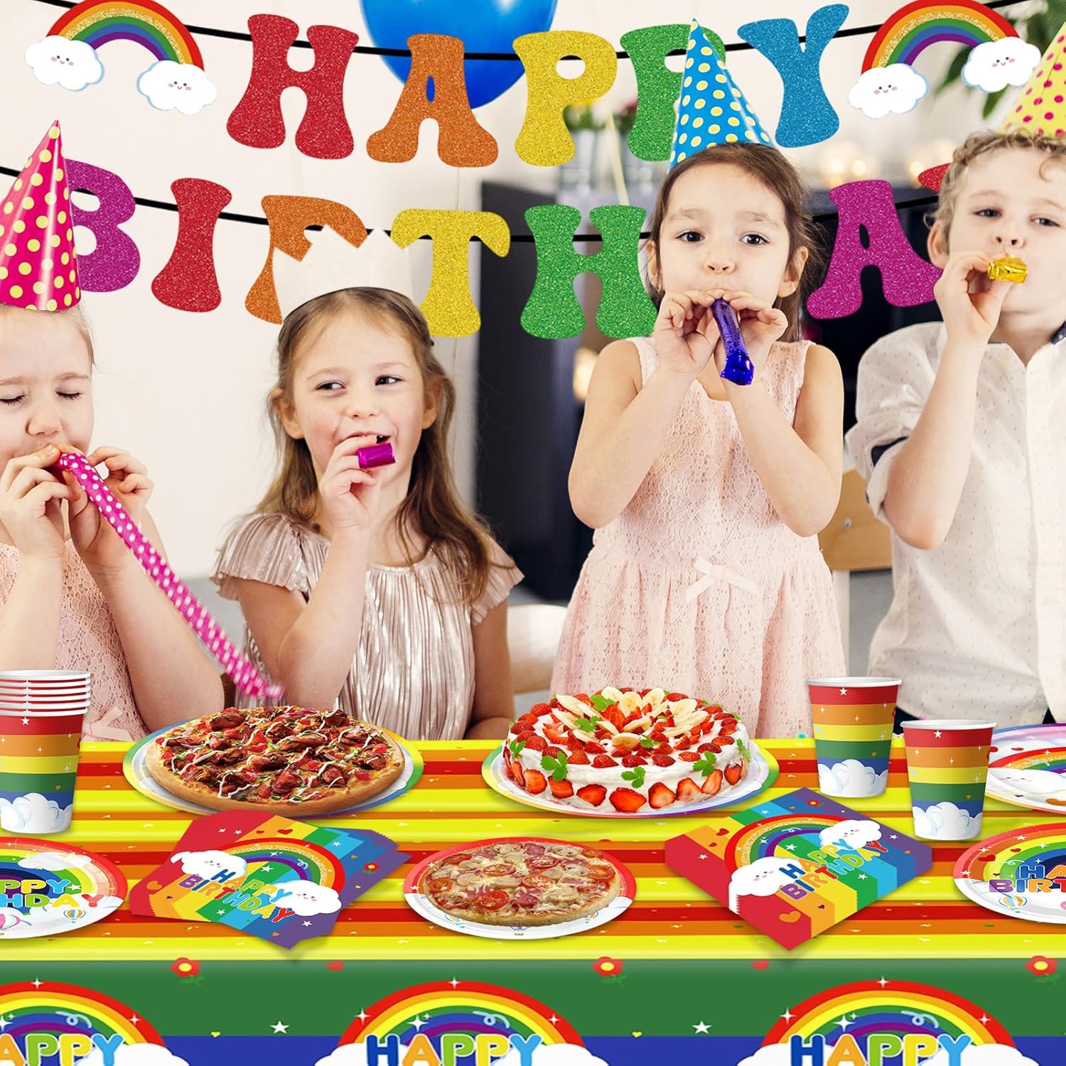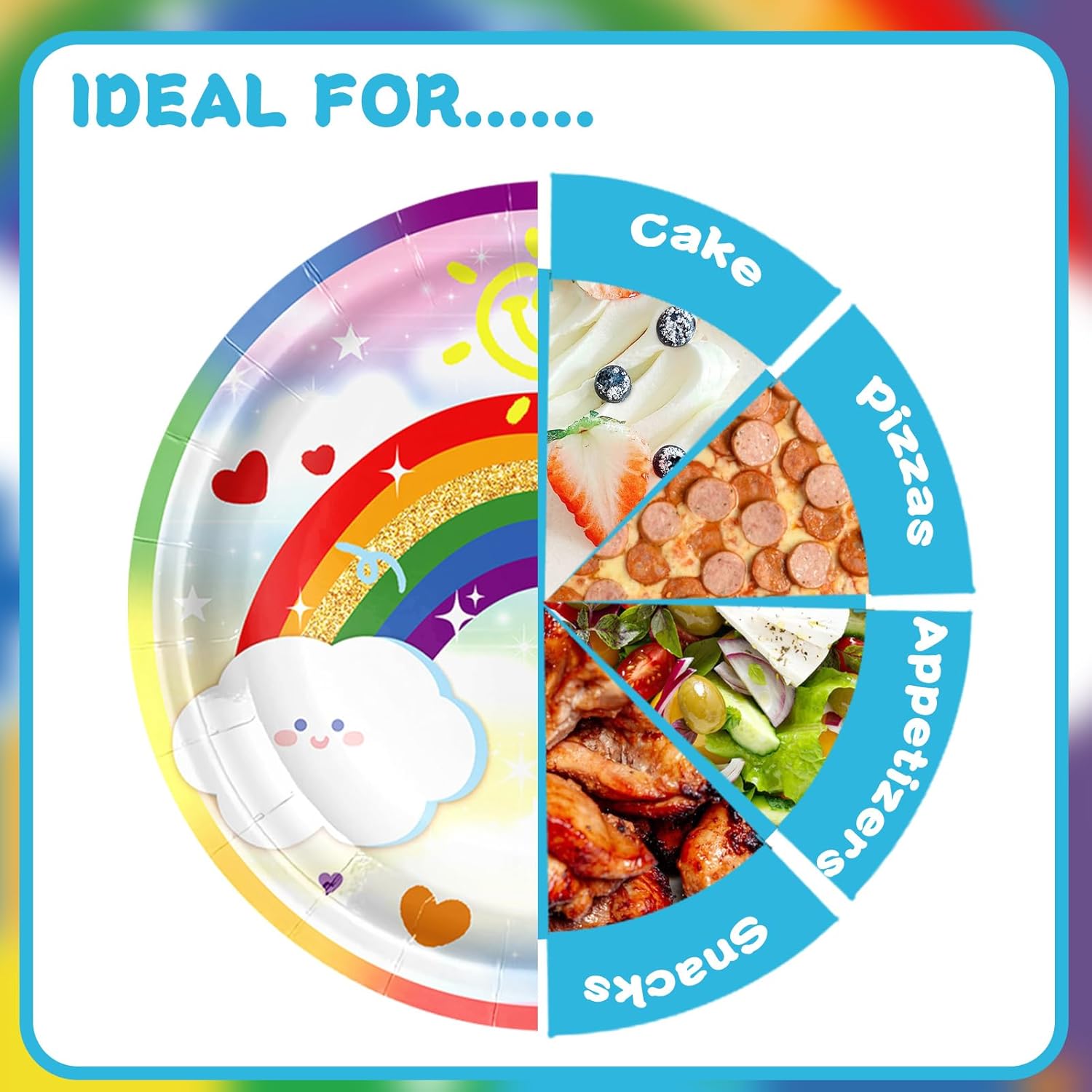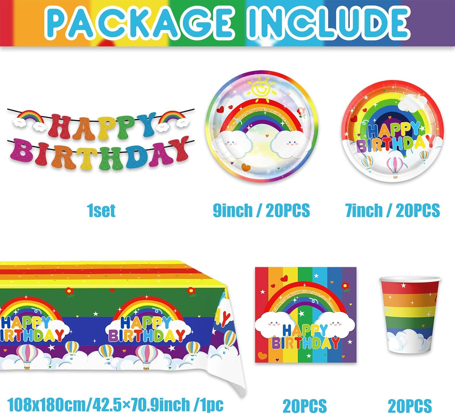 【Set Stoviglie Arcobaleno】 Contiene piatti di carta da 7 pollici * 20, piatti di carta da 9 pollici * 20, bicchieri di carta * 20, tovaglioli di carta * 20, tovaglia * 1, bandiera * 1. Soddisfa varie esigenze della festa, consentendoti di prepararti facilmente per la festa, comodo e veloce. 【Materiali di Alta Qualità】 I nostri set di stoviglie per feste di compleanno realizzato in carta spessa di alta qualità, con stampa chiara e motivi squisiti. Non è facile da deformare o rompere, può sopportare un certo peso di cibo e non perde durante l'uso. 【Facile da usare】Questo piatti carta compleanno non c'è bisogno di lavarlo, può essere gettato via direttamente dopo l'uso, il che offre una grande praticità per la pulizia post-festa, fa risparmiare tempo ed energia e ti consente di goderti più facilmente il processo della festa. 【Design a Tema Arcobaleno】 I nostri set compleanno bambina ha un design unico a tema compleanno, stampato con "Happy Birthday" e nuvole bianche arcobaleno e altri elementi, che possono creare un'atmosfera forte per le feste di compleanno e rendere la festa più cerimoniale. 【Facile da Trasportare】 Se la tua festa si tiene all'aperto o in altri luoghi, il set di stoviglie di carta è leggero e compatto, facile da trasportare e trasportare e non comporterà troppo peso durante gli spostamenti.