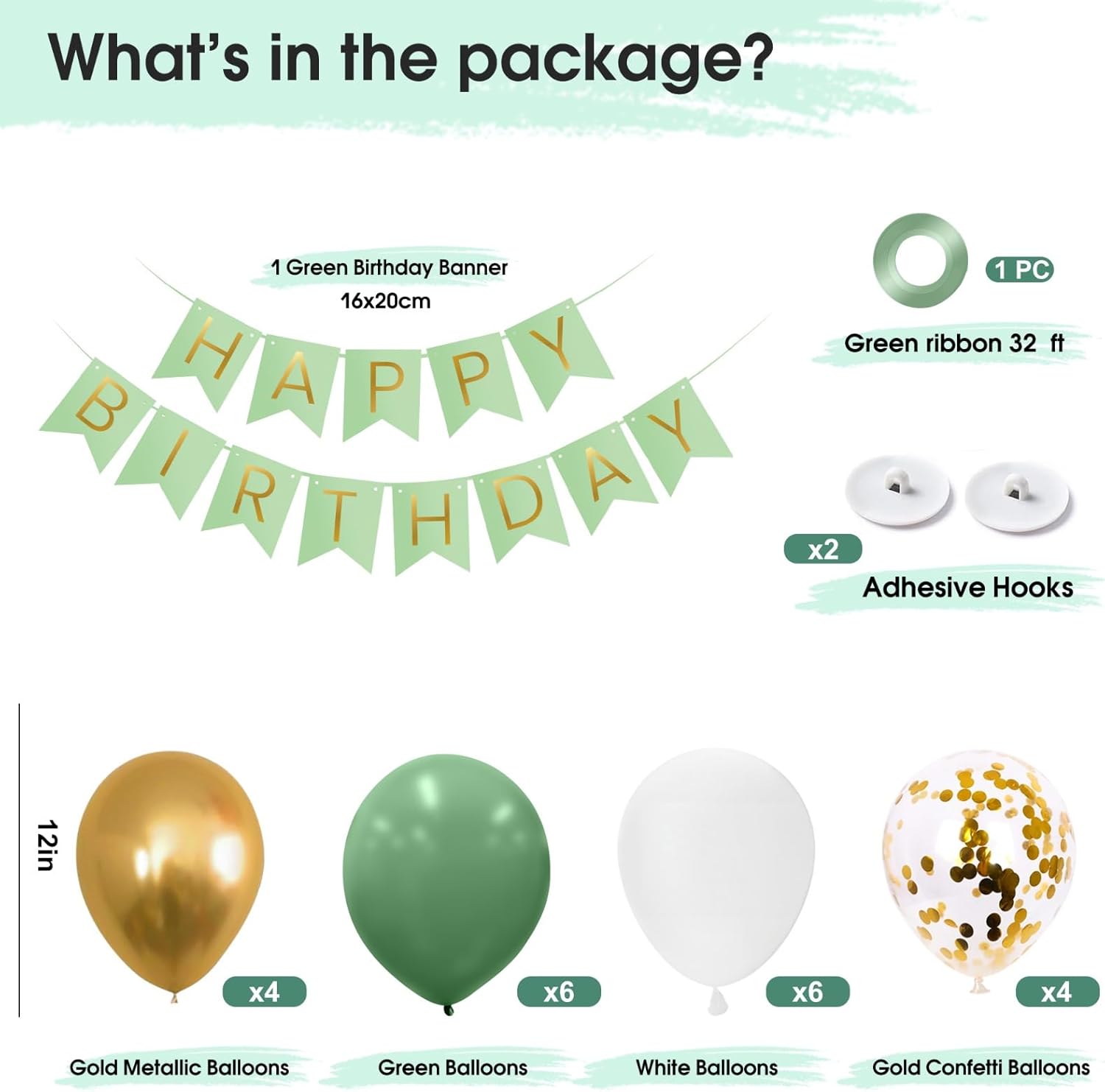 DECORAZIONI DI COMPLEANNO ALLA MODA PER TUTTE LE ETÀ: festeggia con stile con il set di striscioni di buon compleanno verde e oro Ohugs - Perfetto per uomini, donne, ragazzi e ragazze. Una sofisticata combinazione di colori che aggiunge un'atmosfera chic e festosa a qualsiasi celebrazione. 20 palloncini premium da 12 pollici inclusi: include 6 palloncini verdi, 6 palloncini bianchi, 4 palloncini dorati metallizzati e 4 palloncini coriandoli dorati per migliorare la tua decorazione. Palloncini in lattice spessi e vivaci rendono la tua festa lussuosa e fotogenica. FACILE DA APPENDERE CON GANCI E NASTRO: questo pacchetto per feste tutto in uno include 30 piedi di nastro verde e 2 ganci adesivi da parete per un'installazione rapida e senza danni. Trasforma qualsiasi spazio, interno o esterno, in pochi minuti. Scelta riutilizzabile ed ecologica: il banner e i palloncini sono realizzati con materiali durevoli che possono essere riutilizzati. Basta sgonfiare e conservare per la prossima celebrazione, ideale per compleanni importanti anno dopo anno. Garanzia di qualità Ohugs: ci impegniamo per la vostra soddisfazione. Se il tuo set di decorazioni per il compleanno arriva con pezzi mancanti o danneggiati, contattaci per una sostituzione gratuita, la tua celebrazione perfetta è la nostra priorità.