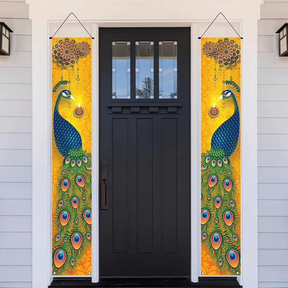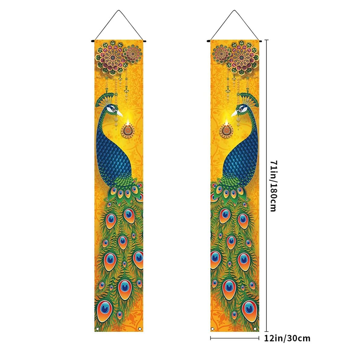 Design del pavone: lo stendardo è decorato con un bellissimo design del pavone che simboleggia bellezza, grazia e prosperità. Gli intricati dettagli e i colori intensi del pavone lo rendono uno splendido centrotavola per le tue decorazioni Diwali. Uso versatile: questo striscione Happy Diwali è perfetto per decorazioni domestiche, feste e altre celebrazioni. Che tu stia organizzando una festa Diwali o desideri semplicemente aggiungere un tocco festoso alla tua casa, questo banner impressionerà sicuramente. Grandi dimensioni: misura 12 x 71 pollici, lo striscione Happy Diwali è abbastanza grande da fare una dichiarazione in ogni stanza. Appendilo a pareti, porte o finestre per creare un'atmosfera festosa per le tue celebrazioni Diwali. Facile da appendere, lo striscione è leggero e facile da spostare in modo da poterlo riposizionare secondo necessità per creare l'esposizione perfetta. Materiale: realizzato in poliestere, questo banner è resistente e di lunga durata. È adatto per uso interno ed esterno, quindi puoi posizionarlo ovunque tu voglia creare l'ambientazione perfetta per Diwali. Colori vivaci: il banner presenta colori vivaci che sicuramente cattureranno l'attenzione e creeranno un'atmosfera gioiosa. Le tonalità luminose del blu, del verde e dell'oro ricordano le tradizionali decorazioni di Diwali e si aggiungono allo spirito festivo.