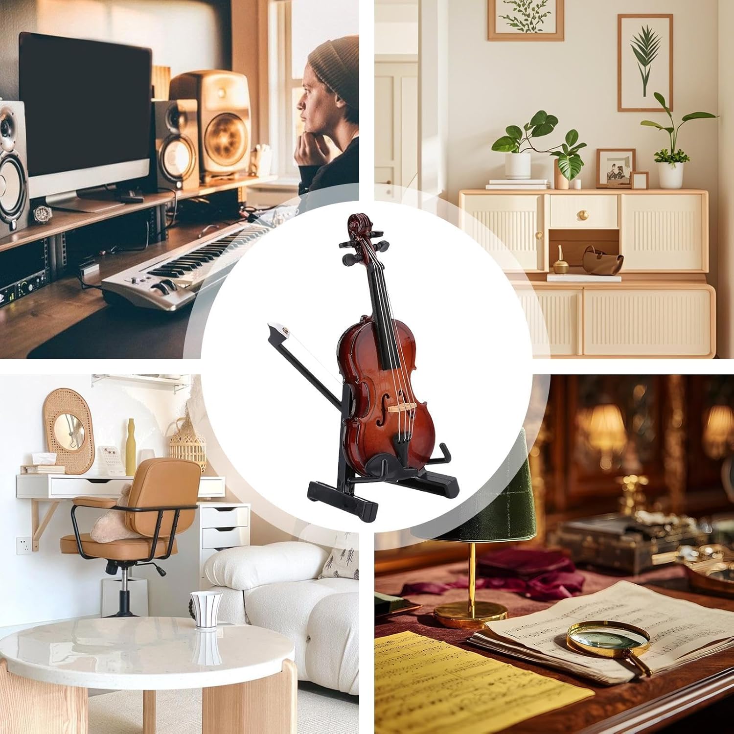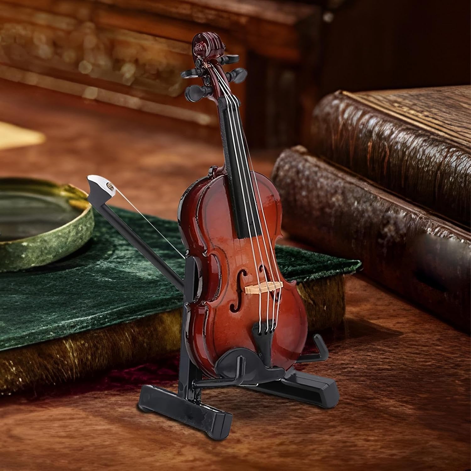 Qualità durevole: grazie al robusto materiale in legno, questo violino in miniatura protegge dalla deformazione e dalla perdita di colore. La finitura opaca uniforme e le superfici perfettamente lisce e prive di spigoli garantiscono un aspetto impeccabile. Decorazione versatile: con un design adattabile, questo violino in miniatura aggiunge fascino artistico a qualsiasi stanza. Crea un'eleganza giocosa e si armonizza facilmente con un'ampia gamma di stili di arredamento per creare un'atmosfera accattivante. Ricordo significativo: perfetto come regalo di compleanno e di festa per trasmettere auguri calorosi, ideale per lauree e traguardi importanti, apprezzato dagli amanti della musica come regalo significativo. Decorazione raffinata: corde e scatola dei piroli chiaramente visibili replicano squisitamente i veri violini, fornendo un oggetto decorativo raffinato che migliora il design degli interni con un'arte dettagliata. Usabilità completa: eccellente per l'istruzione, il collezionismo di passioni e le occasioni per fare regali, il mini violino funge da elemento decorativo e affronta un'ampia gamma di applicazioni grazie al suo design adattabile.