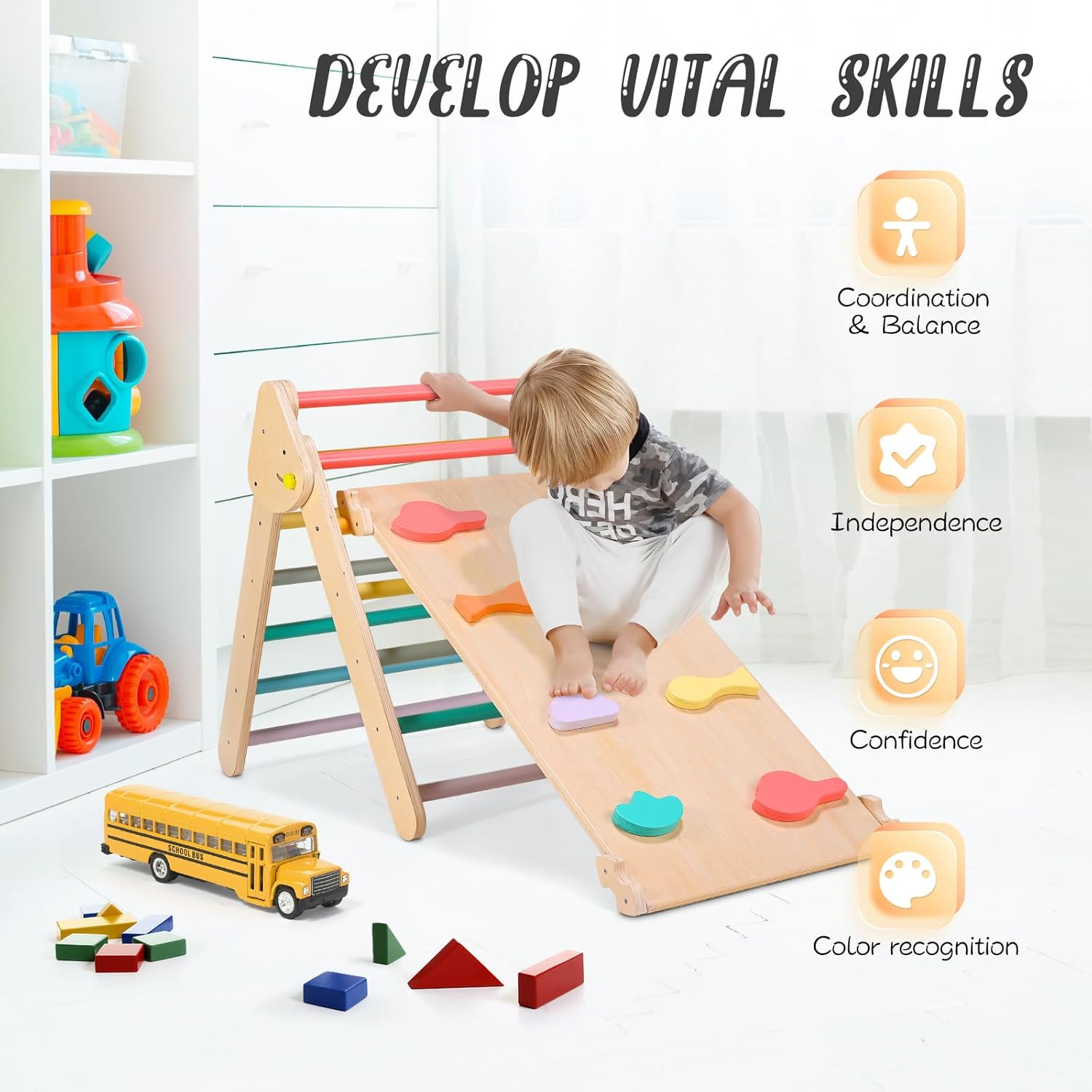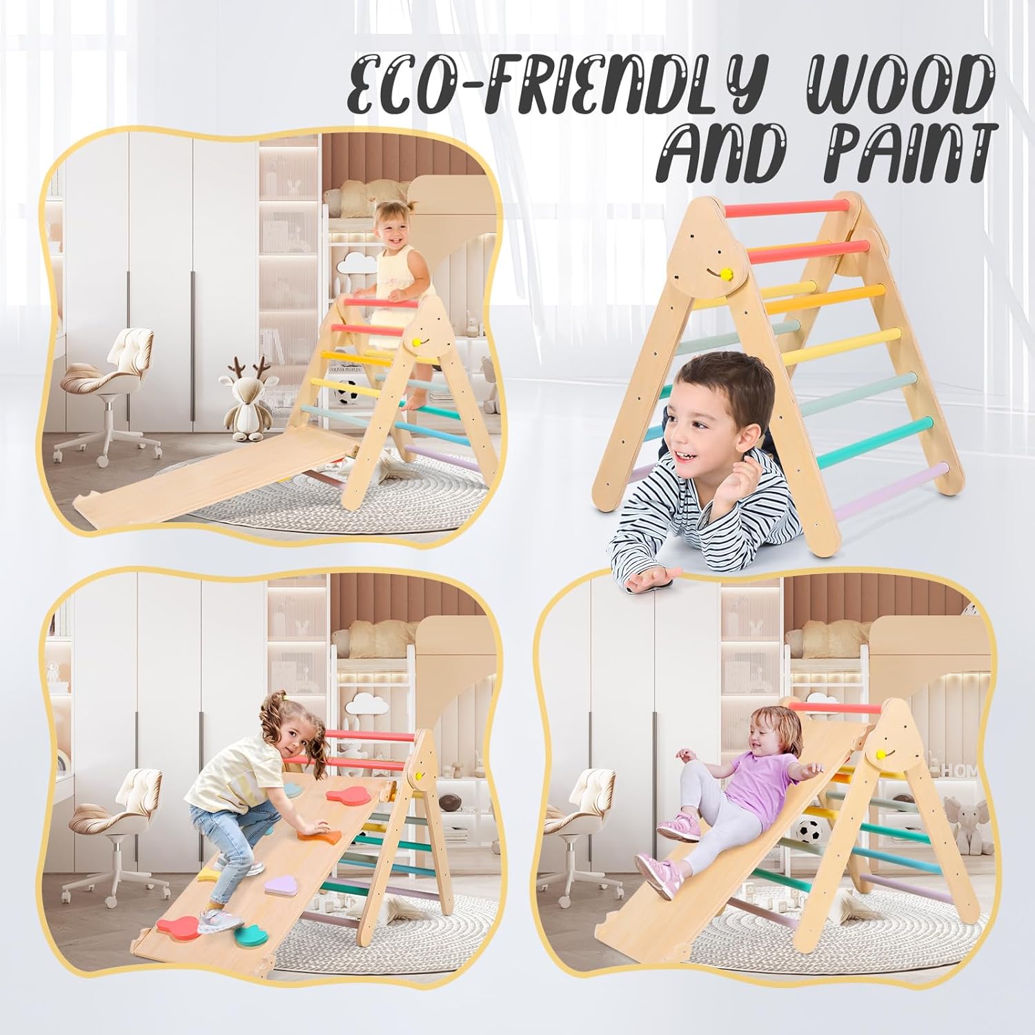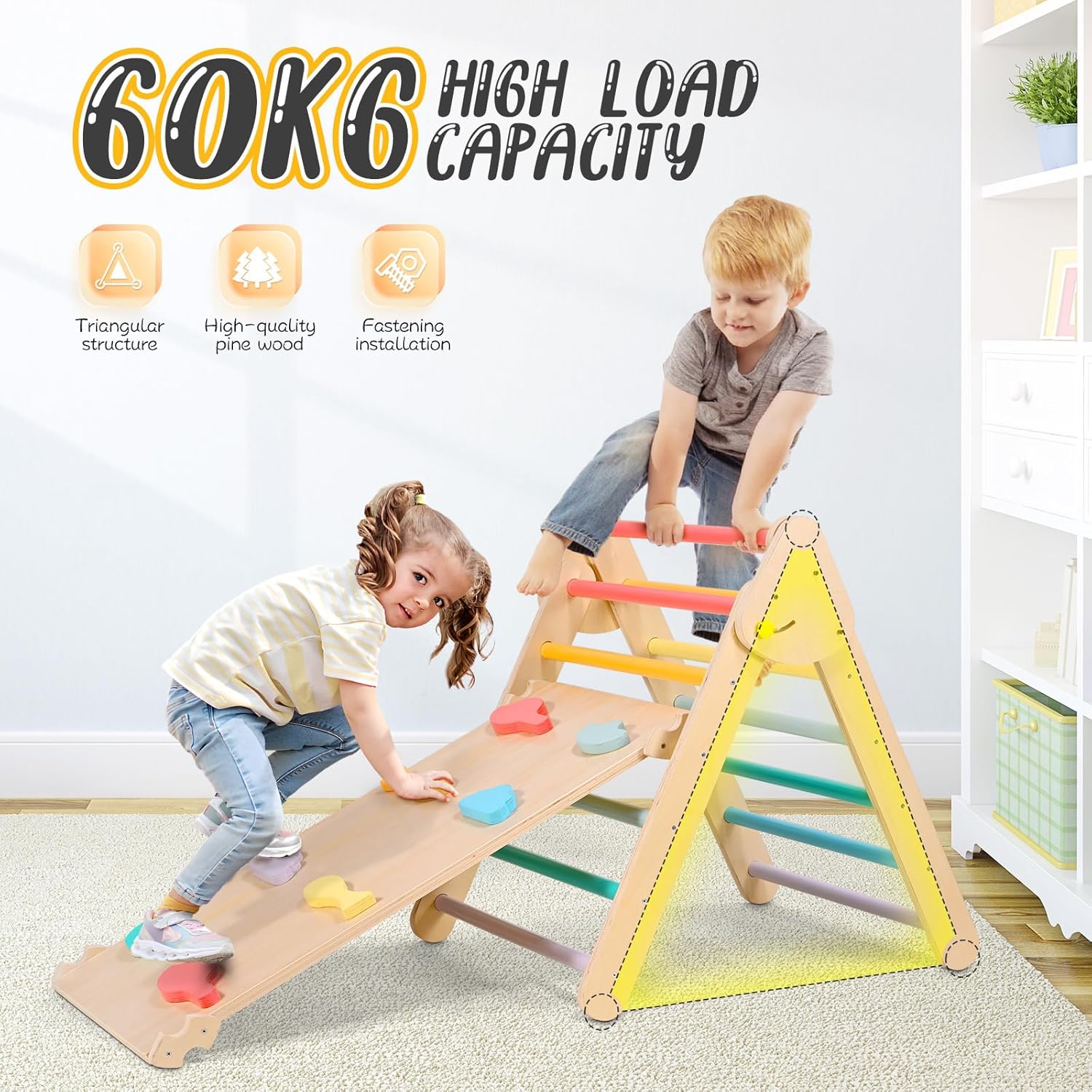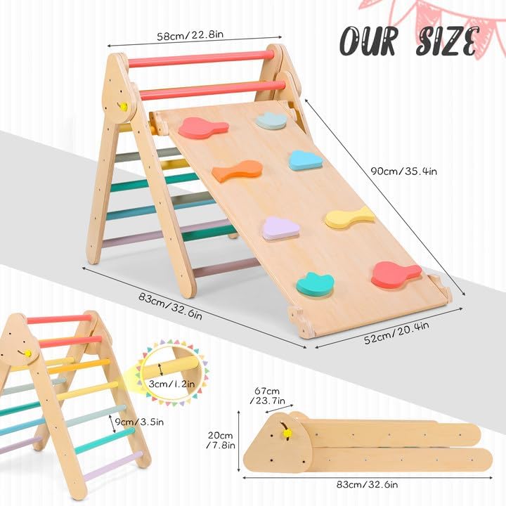 Vantaggi per lo sviluppo: la nostra struttura triangolare combina uno scivolo 2 in 1 (per arrampicarsi e scivolare) e una struttura a forma di triangolo, più di un semplice gioco. Promuove competenze cruciali come la coordinazione, l'equilibrio e le abilità motorie in modo sostenibile. Inoltre, i colori vivaci supportano il riconoscimento dei colori nei bambini, rendendo l'apprendimento attraverso il gioco emozionante. Sicurezza al primo posto: la sicurezza è la massima priorità: questa struttura da arrampicata per bambini è realizzata in legno di pino ecologico, per un tempo di gioco sicuro e sostenibile. Il colore utilizzato è atossico e adatto ai bambini. La comoda impugnatura garantisce una presa sicura durante qualsiasi arrampicata e scivolamento, i genitori possono guardare rilassati. Portata stabile di 60 kg: grazie alla solida struttura triangolare e alle articolazioni saldamente collegate, il ponteggio offre la massima stabilità. Supporta fino a 60 kg e consente a due bambini di giocare insieme. Ulteriori rinforzi per unghie rafforzano ulteriormente la costruzione, durevole e affidabile. Scivolo bilaterale con 8 blocchi di arrampicata: lo scivolo per bambini su entrambi i lati offre il doppio del divertimento: da un lato i bambini scivolano verso il basso, dall'altro esplorano emozionanti avventure di arrampicata. Gli 8 blocchi da arrampicata ampliano ulteriormente le possibilità di gioco e l'altezza dello scivolo può essere regolata individualmente. Design pieghevole per una facile conservazione: questa struttura triangolare da arrampicata 3 in 1 è pieghevole, in modo che possa essere riposta quando non in uso risparmiando spazio. La dimensione piegata è di 83 × 67 × 20 cm – ideale per mantenere l'area di gioco ordinata senza rinunciare al divertimento e all'avventura per neonati e bambini.