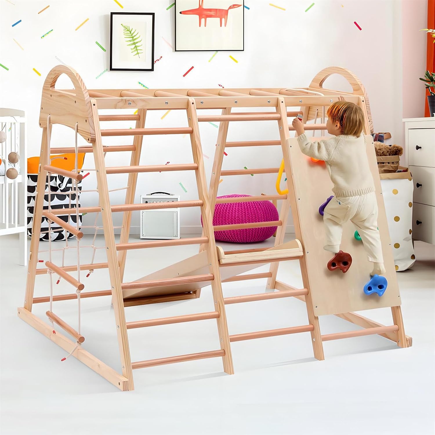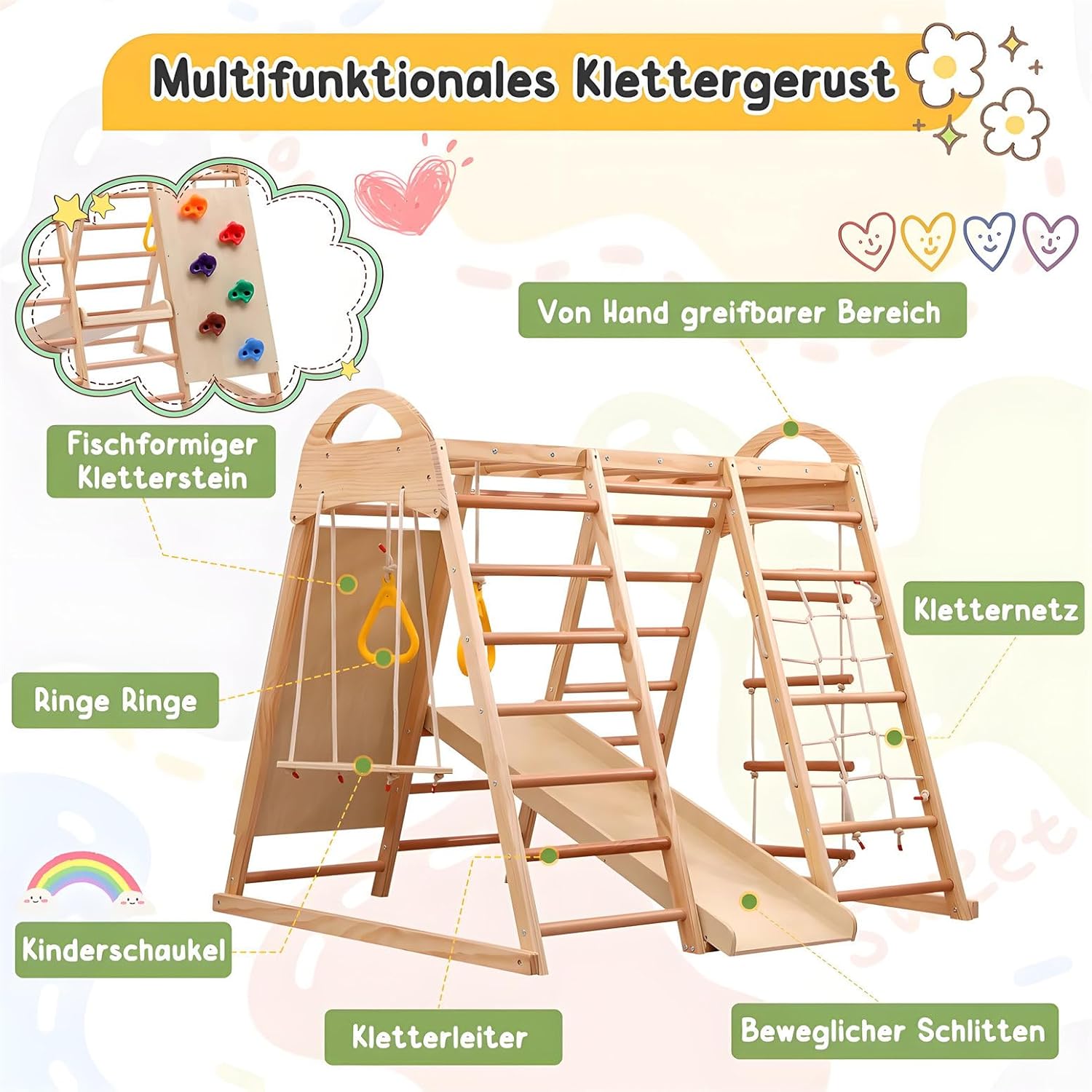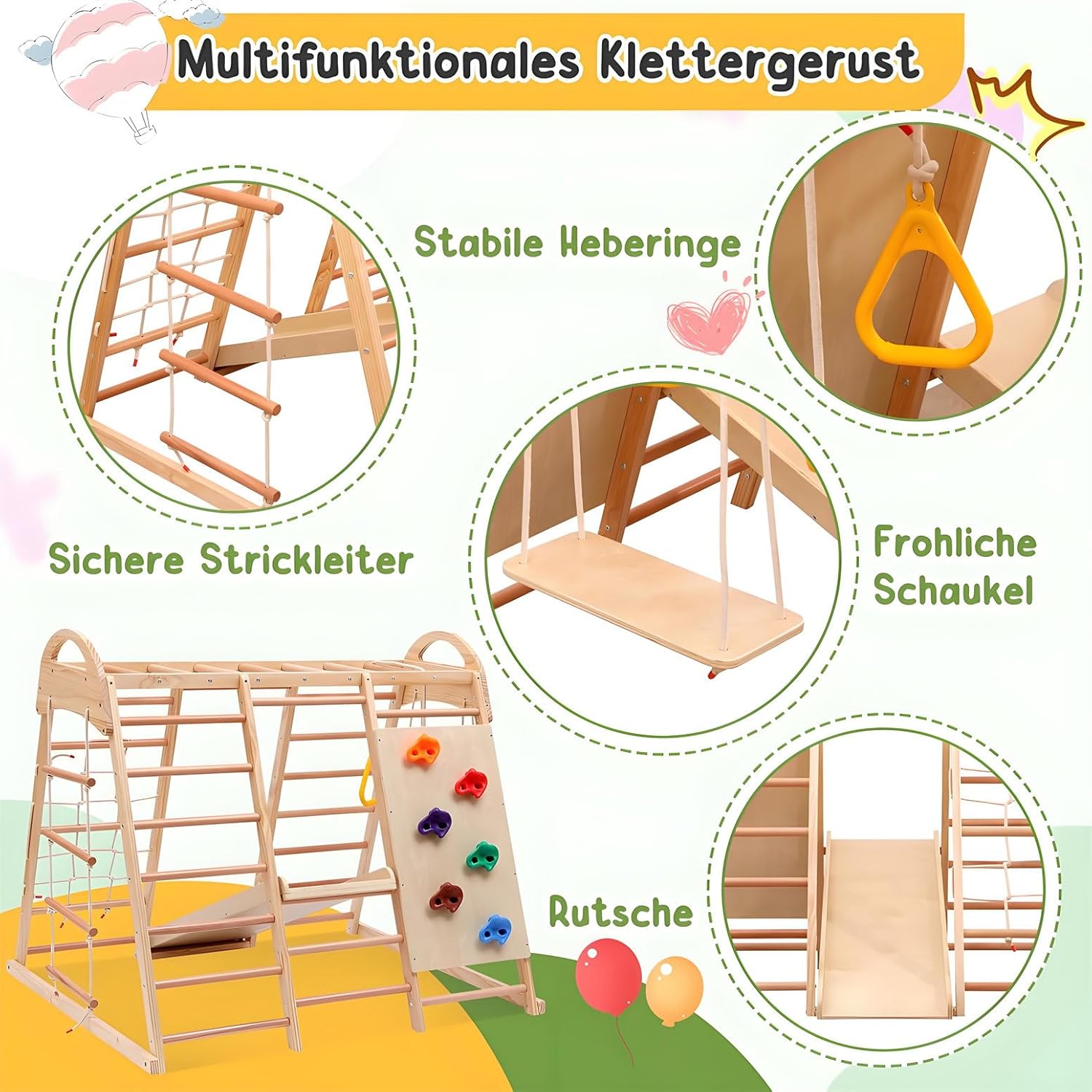 【PARCO GIOCHI 7 IN 1】Questo parco giochi offre sette diverse funzioni in uno: scivolo, barra di arrampicata, altalena, corda di arrampicata e scala a rete, perfetto per infinite possibilità di gioco. Può essere utilizzato come tenda-casa se gli utenti fissano un tappetino sotto questo triangolo di arrampicata. 【PARCO GIOCHI SICURO】Il parco giochi con scivolo e parete di arrampicata è realizzato in legno massello, faggio e compensato. La struttura in legno e gli accessori colorati presentano una superficie senza sbavature, garantendo che le mani dei bambini non si feriscano. Massima sicurezza durante il gioco e l'arrampicata; ideale per avventure indimenticabili. 【FAVORISCE LO SVILUPPO】Questo triangolo di arrampicata 7 in 1 promuove le capacità motorie, la coordinazione e la forza fisica dei bambini: una struttura di gioco versatile per tutte le età. La capacità di carico massima di questo triangolo di arrampicata è di 50 kg. È molto utile per sviluppare l'equilibrio e le abilità sociali dei bambini. 【FACILE DA MONTARE】 Il manuale di istruzioni e i kit di montaggio sono inclusi nel prodotto. Le illustrazioni e le istruzioni chiare e logiche contenute nel manuale di istruzioni aiutano gli utenti a installare questo triangolo di arrampicata multifunzionale in modo impeccabile. Si prega di notare che gli utenti devono preparare il proprio trapano elettrico. 【CERTIFICAZIONE AUTORIZZATA】 Questo parco giochi multifunzionale 7 in 1 ha ottenuto la certificazione EN71.1.2.3.8. Questo parco giochi utilizza una vernice a base acqua priva di solventi per il rivestimento in legno, rendendolo atossico, insapore e adatto ai bambini. Il design strutturale questo triangolo arrampicata è sensato, con una struttura in legno e accessori luminosi che attirano facilmente attenzione dei bambini. Contribuisce a promuovere capacità cognitive e creatività dei bambini