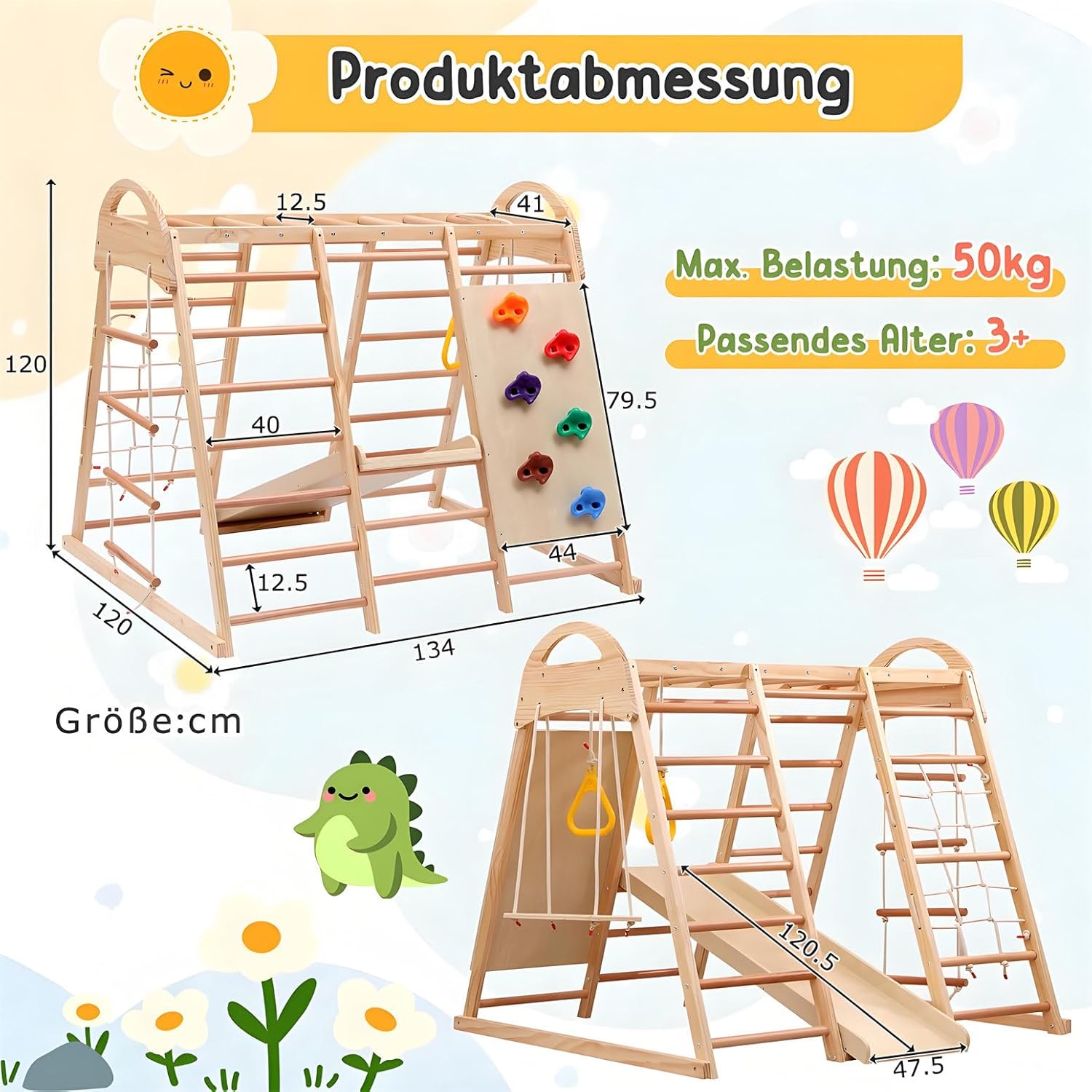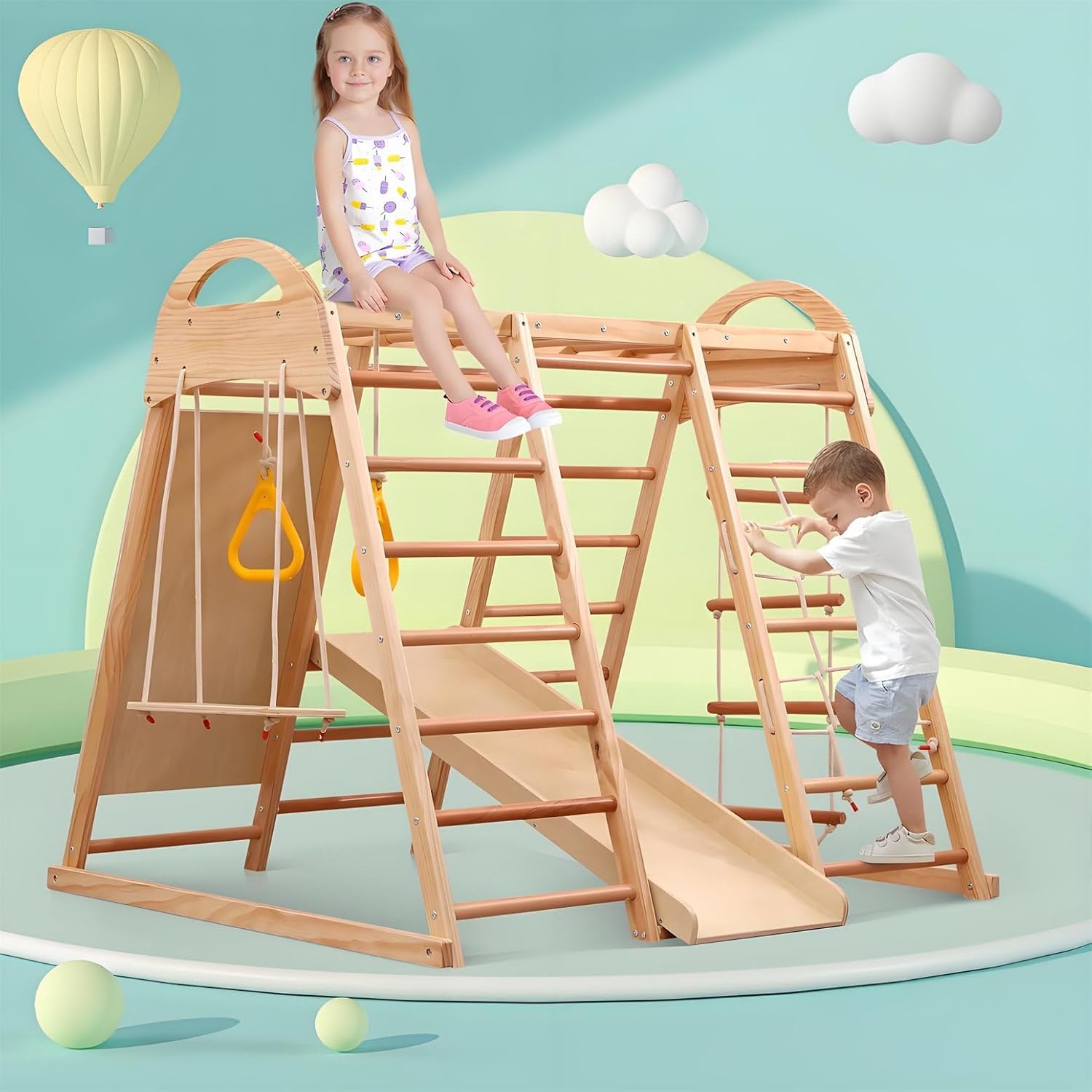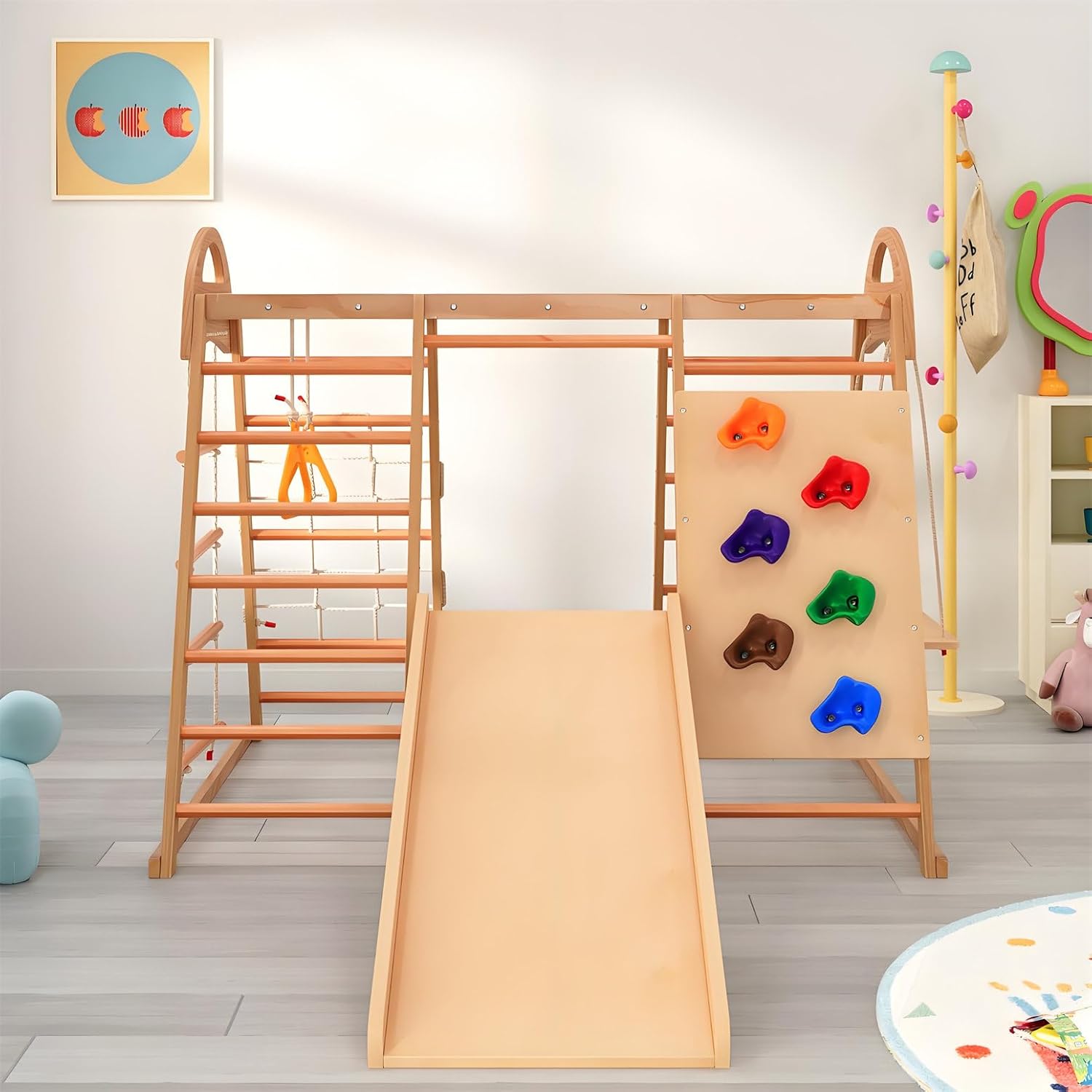 【PARCO GIOCHI 7 IN 1】Questo parco giochi offre sette diverse funzioni in uno: scivolo, barra di arrampicata, altalena, corda di arrampicata e scala a rete, perfetto per infinite possibilità di gioco. Può essere utilizzato come tenda-casa se gli utenti fissano un tappetino sotto questo triangolo di arrampicata. 【PARCO GIOCHI SICURO】Il parco giochi con scivolo e parete di arrampicata è realizzato in legno massello, faggio e compensato. La struttura in legno e gli accessori colorati presentano una superficie senza sbavature, garantendo che le mani dei bambini non si feriscano. Massima sicurezza durante il gioco e l'arrampicata; ideale per avventure indimenticabili. 【FAVORISCE LO SVILUPPO】Questo triangolo di arrampicata 7 in 1 promuove le capacità motorie, la coordinazione e la forza fisica dei bambini: una struttura di gioco versatile per tutte le età. La capacità di carico massima di questo triangolo di arrampicata è di 50 kg. È molto utile per sviluppare l'equilibrio e le abilità sociali dei bambini. 【FACILE DA MONTARE】 Il manuale di istruzioni e i kit di montaggio sono inclusi nel prodotto. Le illustrazioni e le istruzioni chiare e logiche contenute nel manuale di istruzioni aiutano gli utenti a installare questo triangolo di arrampicata multifunzionale in modo impeccabile. Si prega di notare che gli utenti devono preparare il proprio trapano elettrico. 【CERTIFICAZIONE AUTORIZZATA】 Questo parco giochi multifunzionale 7 in 1 ha ottenuto la certificazione EN71.1.2.3.8. Questo parco giochi utilizza una vernice a base acqua priva di solventi per il rivestimento in legno, rendendolo atossico, insapore e adatto ai bambini. Il design strutturale questo triangolo arrampicata è sensato, con una struttura in legno e accessori luminosi che attirano facilmente attenzione dei bambini. Contribuisce a promuovere capacità cognitive e creatività dei bambini