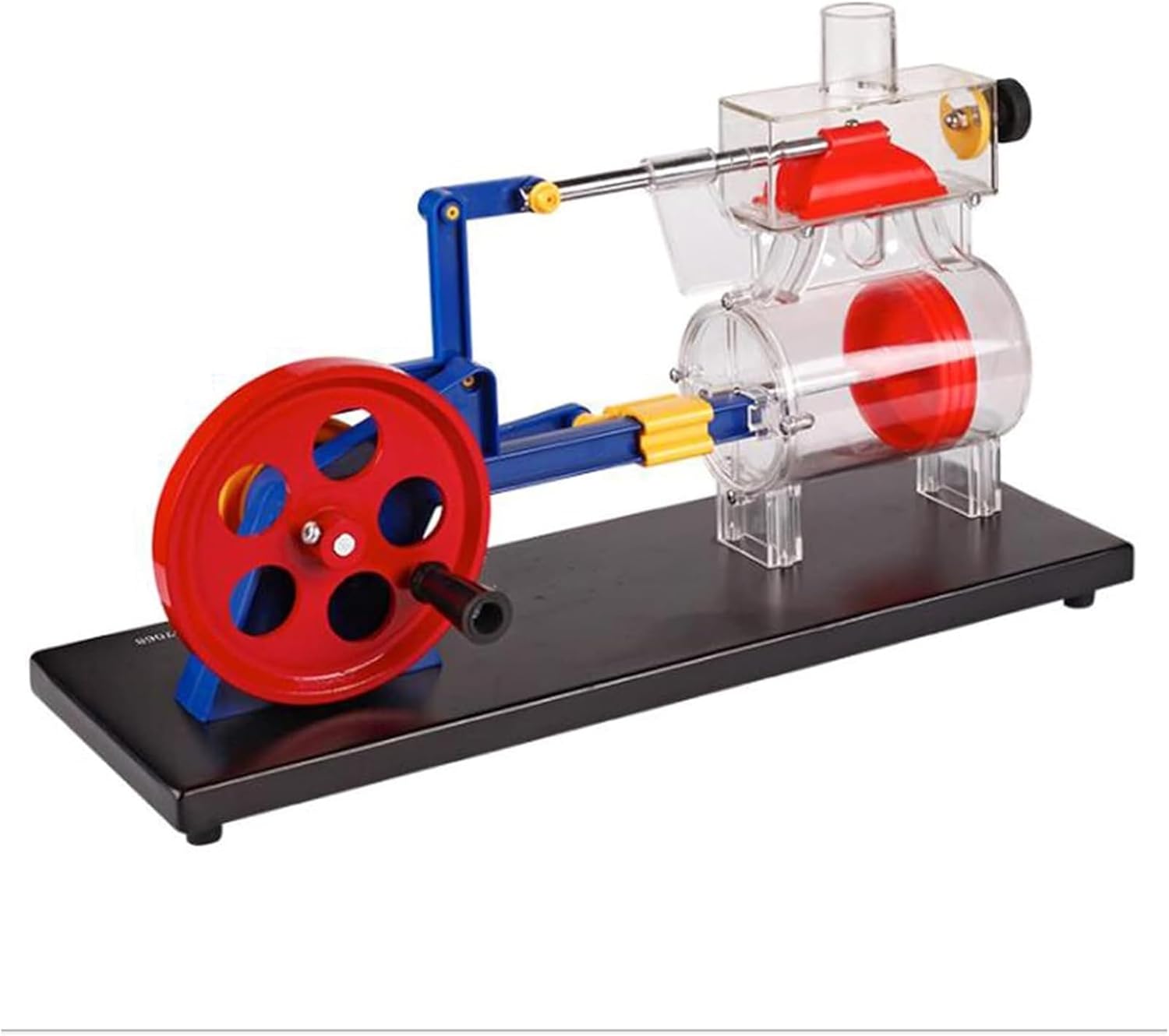 * Questo modello di motore a vapore appartiene ad un motore a vapore a doppia propulsione. Il vapore viene controllato modificando la valvola e l'aria aspirata da entrambe le estremità del cilindro può spingere alternativamente il pistone a funzionare. * Alcune parti sono progettate in trasparenza, il che è utile for osservare i dettagli di funzionamento di ciascuna parte in modo completo senza angoli morti. * Lo strumento è composto da cilindro, pistone, camera di vapore, valvola di inversione del flusso di vapore, meccanismo di biella a manovella, volano, staffa e piastra inferiore. * for facilitare l'osservazione del processo di lavoro del pistone in funzione e della valvola di inversione del flusso di vapore, il cilindro e la camera del vapore sono realizzati in plastica trasparente. * Sopra il cilindro è previsto un passaggio del vapore for il collegamento con la camera del vapore; un lato della camera del vapore è progettato con un meccanismo di regolazione della pressione del vapore for regolare la velocità di funzionamento della macchina e il volano è in ghisa.