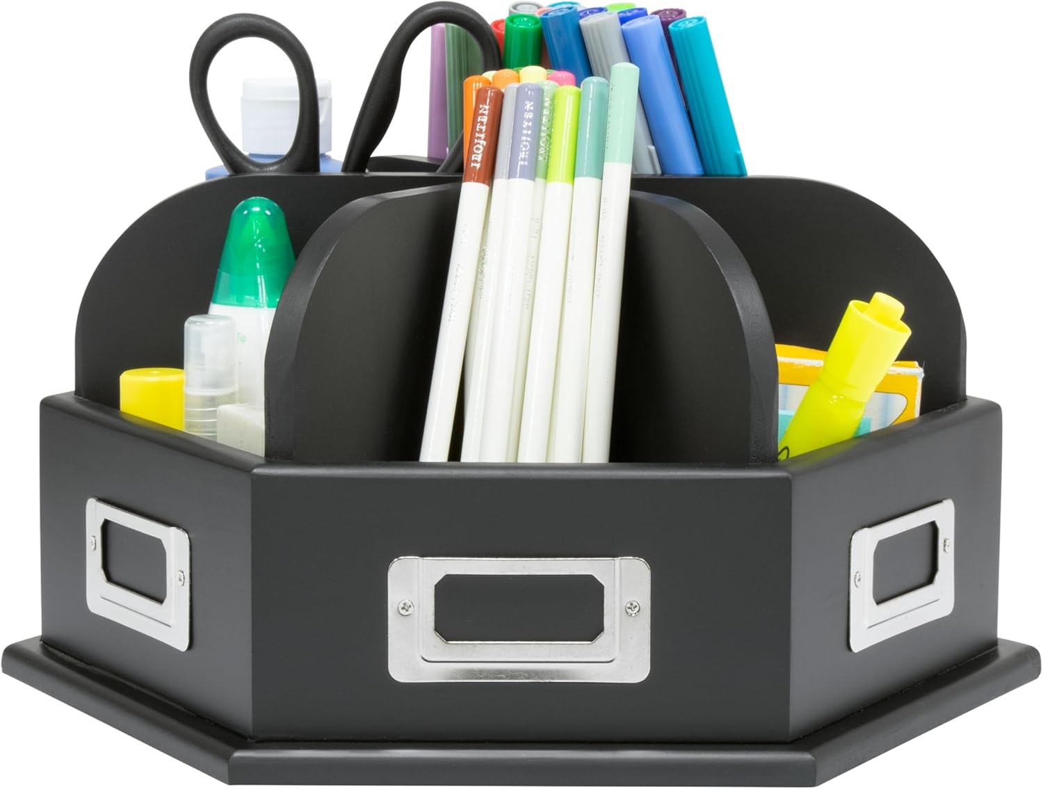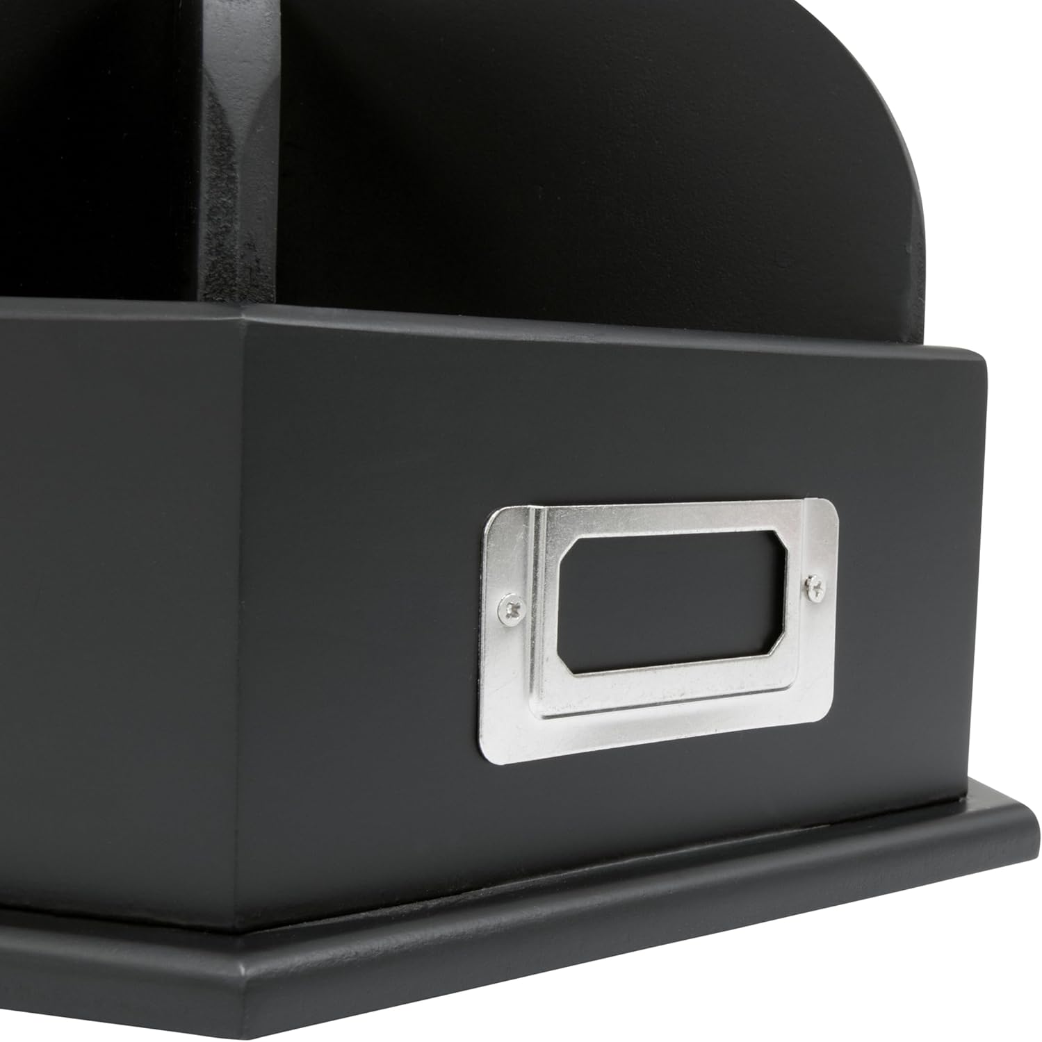 Dimensioni complessive: 30,5 cm di diametro x 17,8 cm di altezza. Rotante, contenitore autonomo. 6 scomparti: 11,4 x 11,4 cm (larghezza x profondità). 6 porta etichette – 1 per scomparto (etichette non incluse). Design e finitura anticata.